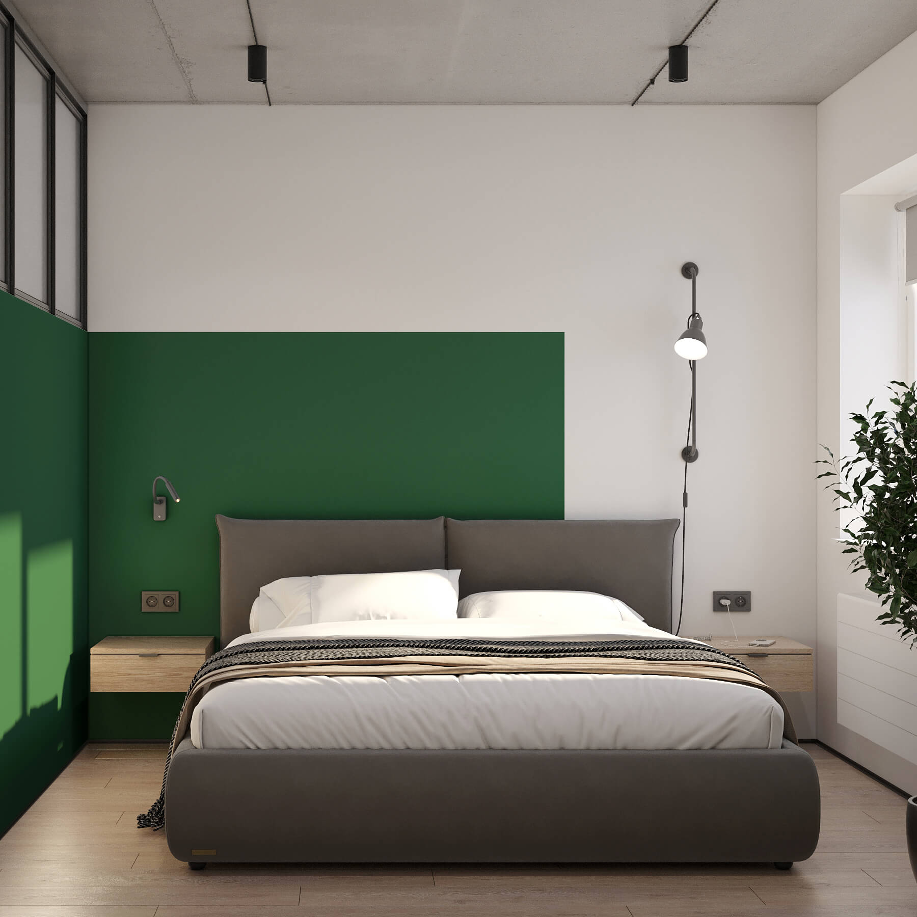 A small bedroom can become not only a place to relax, but also a real highlight of the interior. In this project, the main focus is on the area behind the headboard. We used a deep green colour that forms a stylish composition together with wall lamps and a glass partition. This approach adds character to the room without overwhelming it.