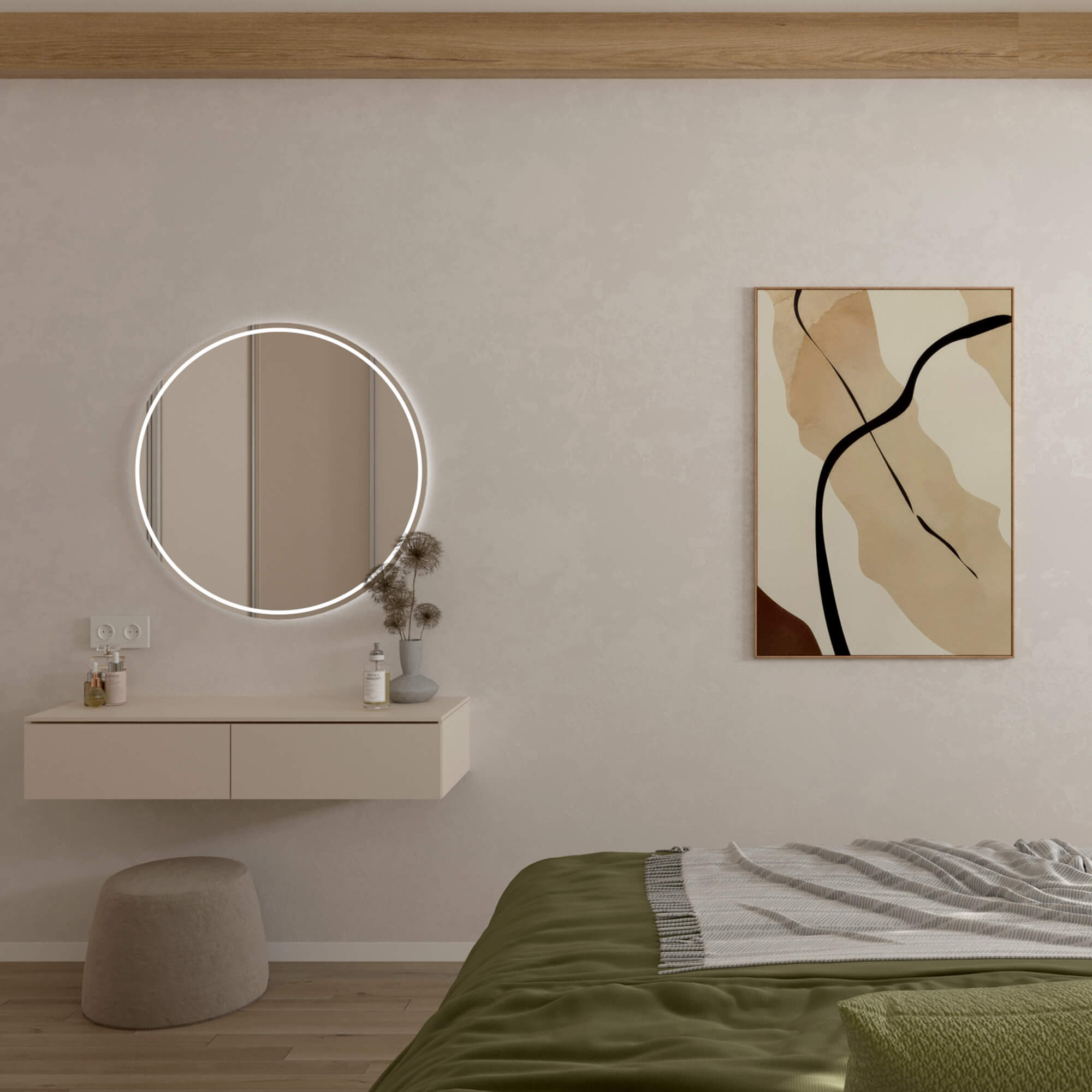 У цьому проєкті ми поєднали функціональність і спокій скандинавського мінімалізму. На прохання замовниці великий робочий стіл розмістили навпроти вікна – для світла й щоденного натхнення. Додали містку шафу та окремий косметичний столик. Розетки навпроти ліжка приховали картиною, щоб у майбутньому легко інтегрувати телевізор. Дерев’яні жалюзі замінили текстиль і підкреслили стиль кімнати.