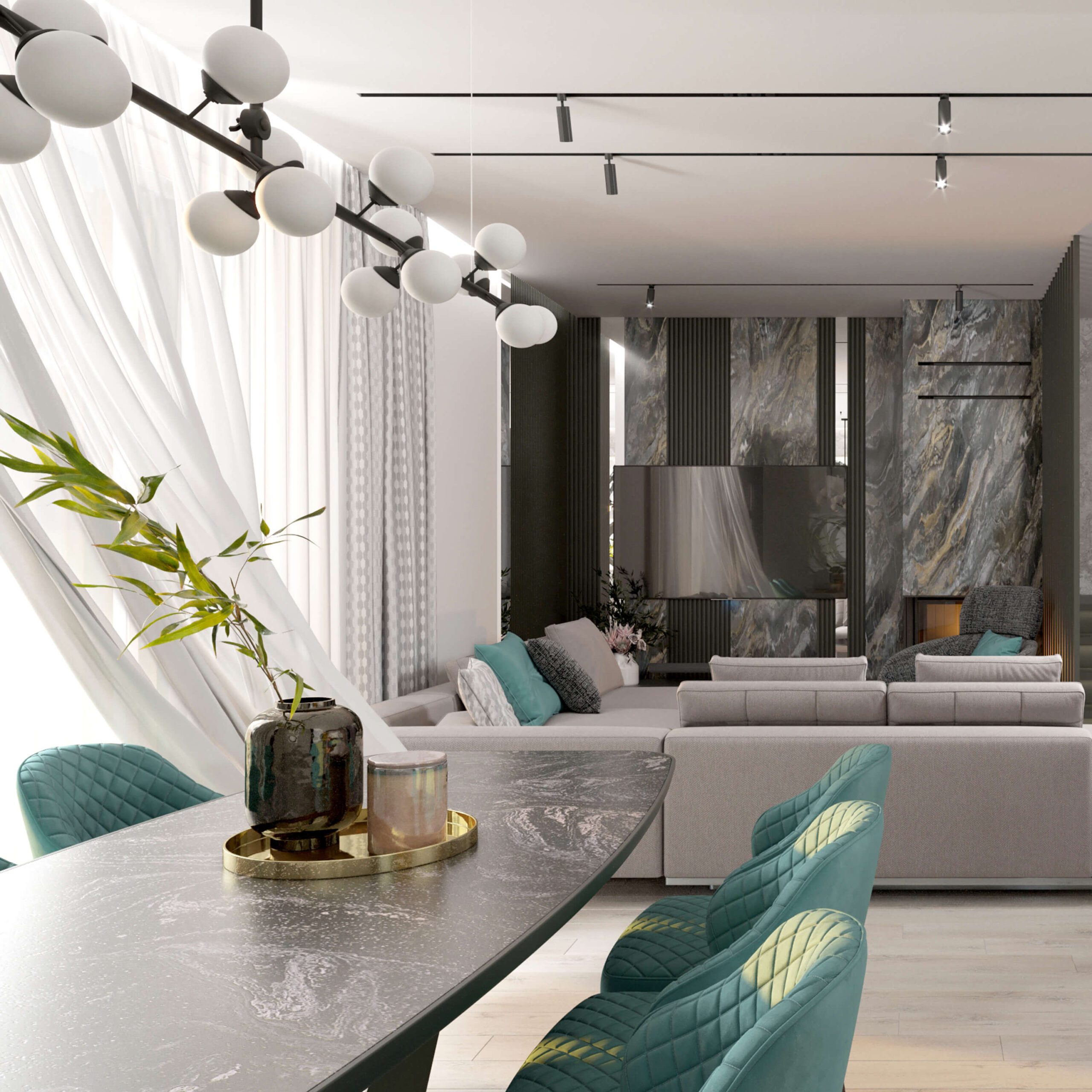 У цю кухню-вітальню ми додали пофарбування в кольорі Dusty pink, в результаті отримали об’єднаний простір з кухнею. Зону каміну оздобили керамогранітом з текстурою каменю, поєднали з чорними рейками та вставками з дзеркала. Вийшло дуже стильно й завершено!