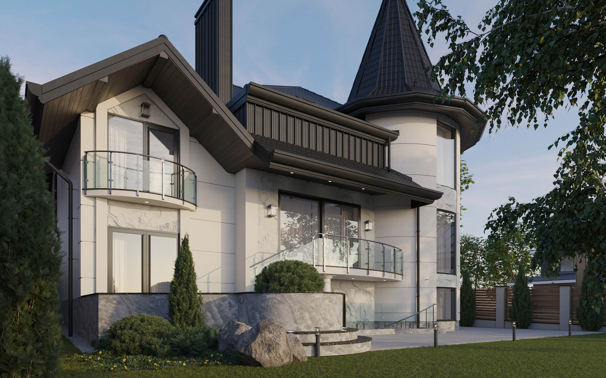 Фасад выполнен из высококачественных материалов, таких как природный камень, плитка, архитектурный бетон в виде скалы и краска, что придает зданию прочность и долговечность. Оттенки нейтральных цветов — серый и белый, подчеркивают благородство и чистоту форм.