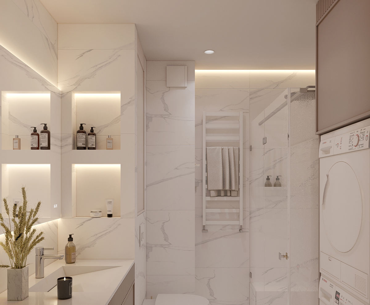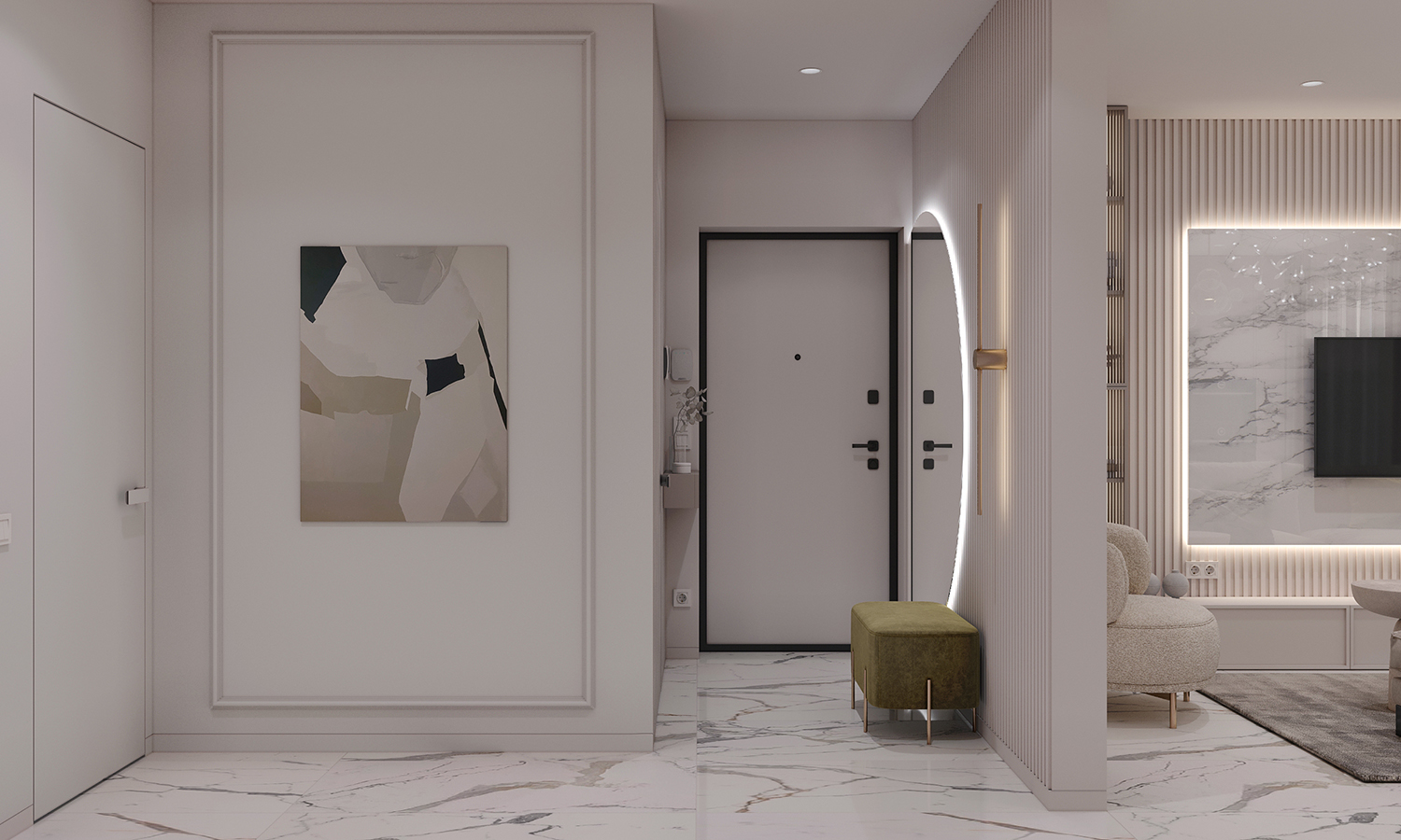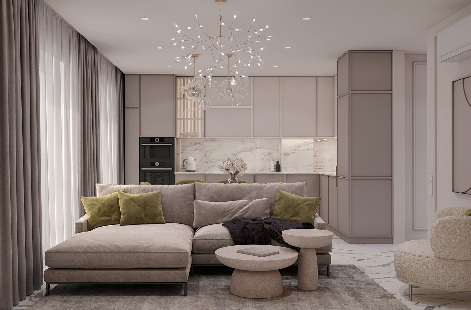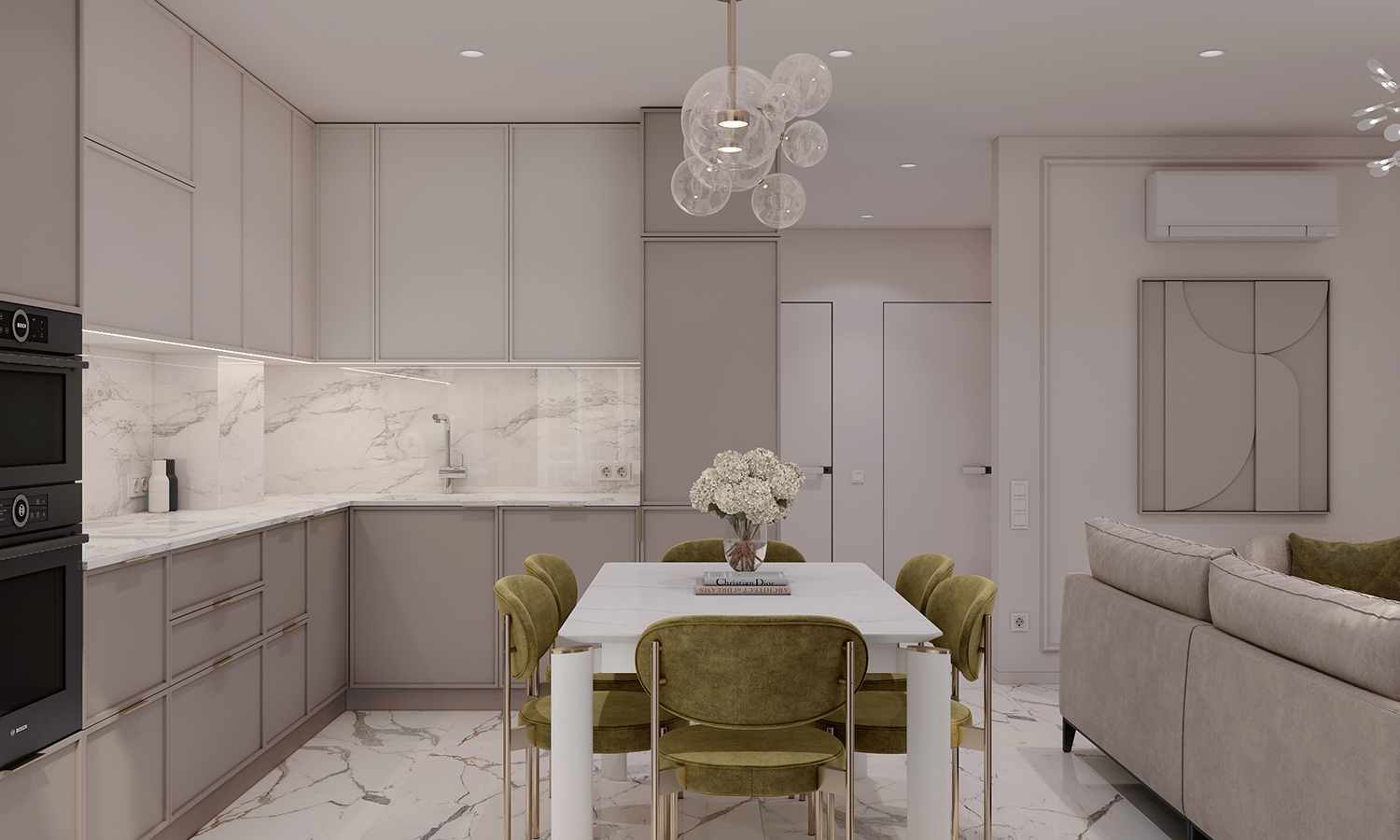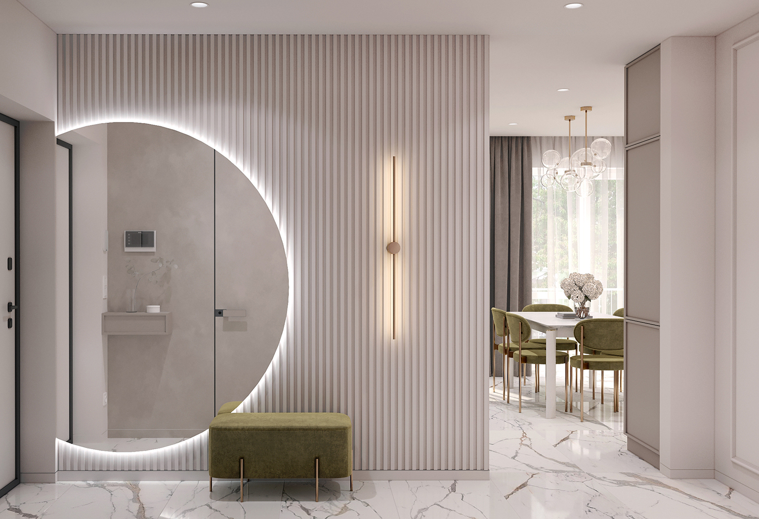 Прихожа та кухня-вітальня формують дизайн інтер’єру з нейтральними та ніжними кольорами з акцентом на салатовому відтінку. Сучасні фасади меблів вражають своєю тонкою та делікатною рамкою, надаючи приміщенню легкості та елегантності. Різні сценарії освітлення – основне, зоноване та підсвітка – додають функціональності і атмосфери. Золоті деталі стають яскравим акцентом, розкриваючи розкіш і шарм цього сучасного інтер’єру.