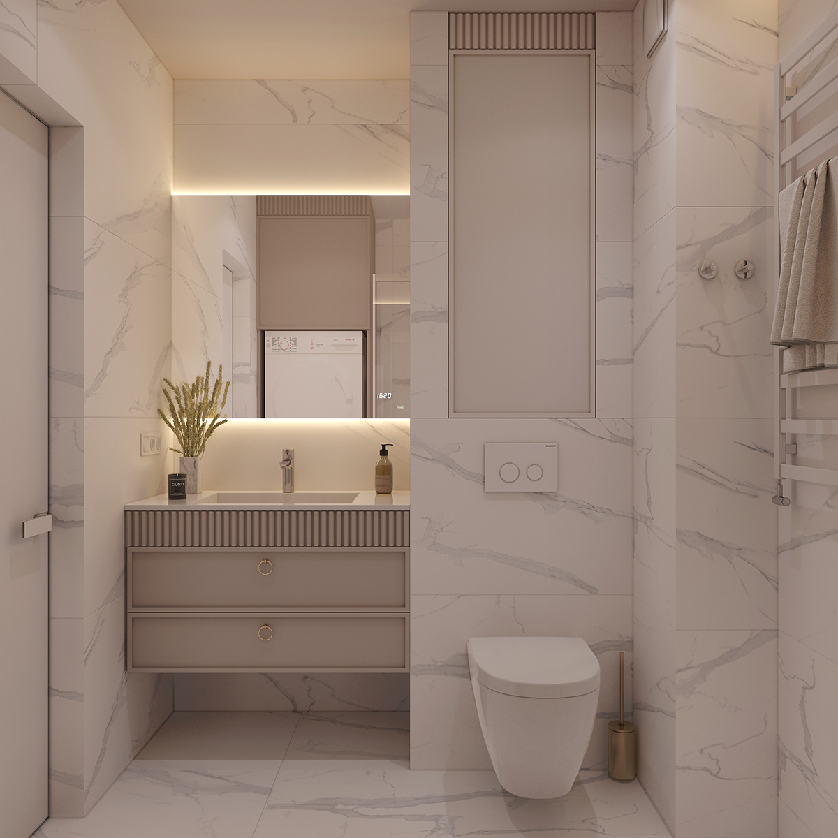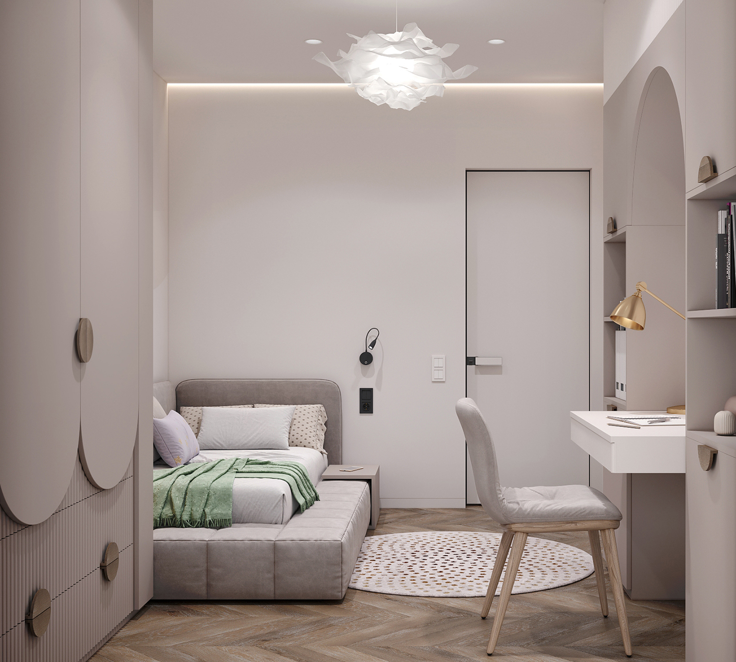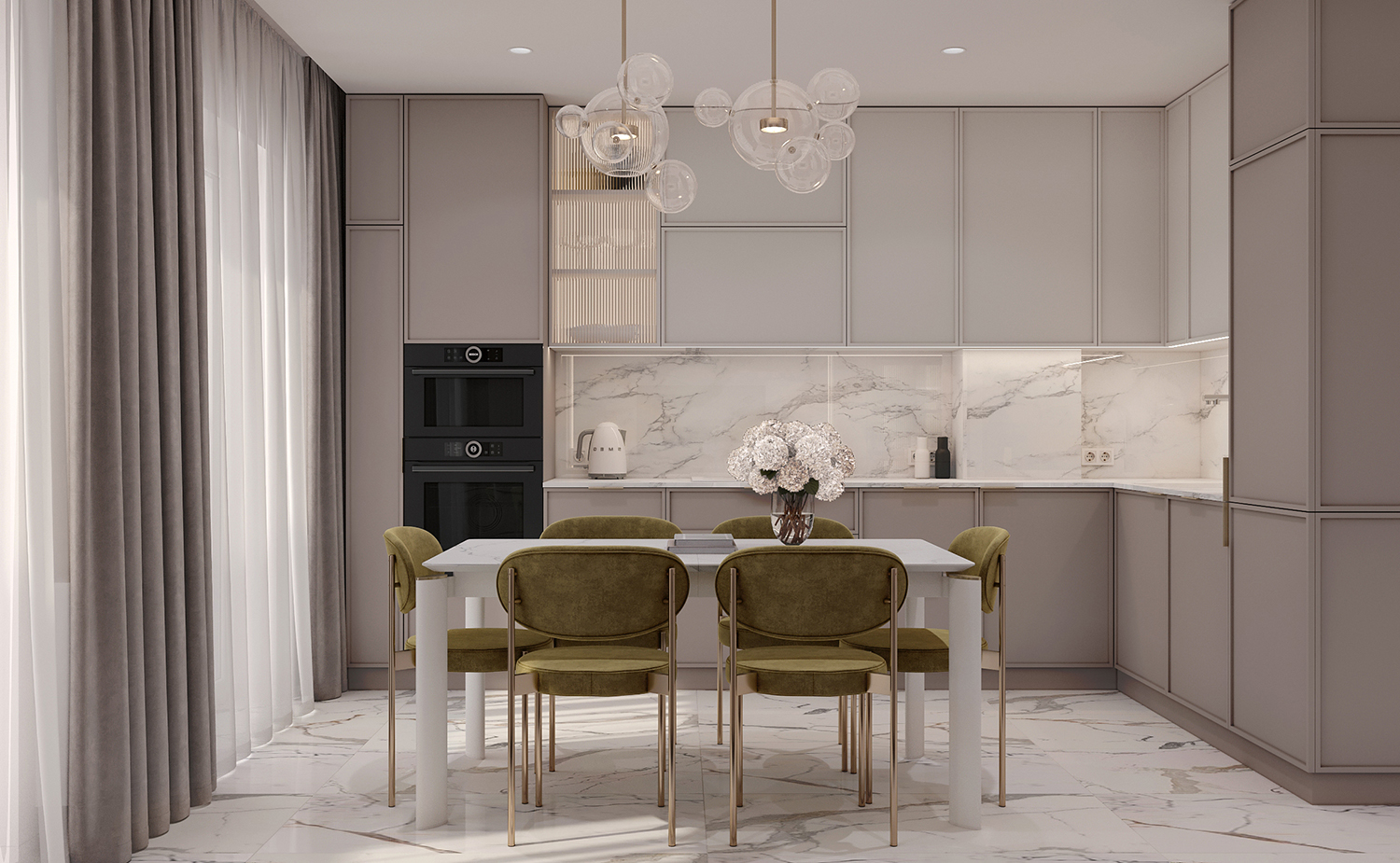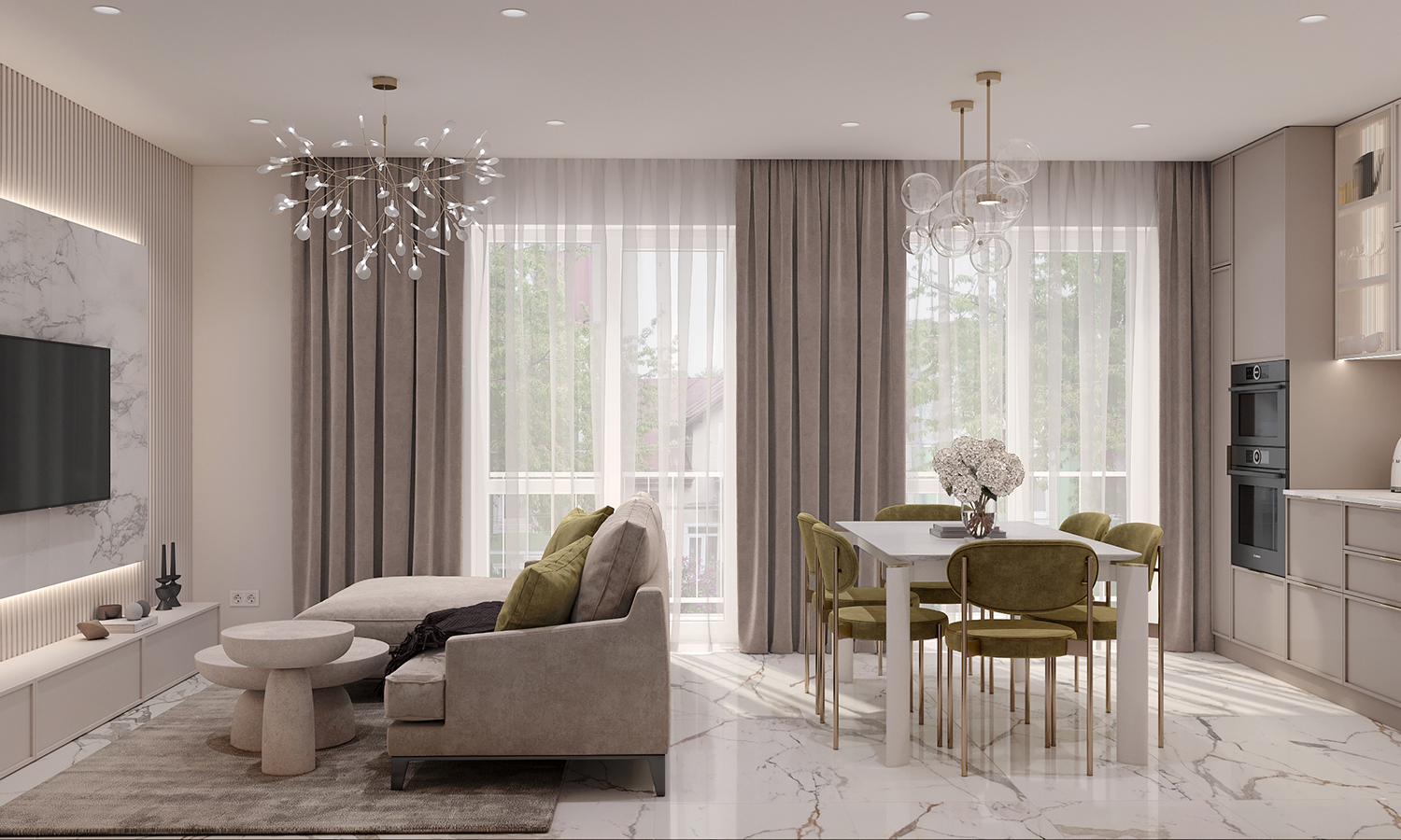 Прихожа та кухня-вітальня формують дизайн інтер’єру з нейтральними та ніжними кольорами з акцентом на салатовому відтінку. Сучасні фасади меблів вражають своєю тонкою та делікатною рамкою, надаючи приміщенню легкості та елегантності. Різні сценарії освітлення – основне, зоноване та підсвітка – додають функціональності і атмосфери. Золоті деталі стають яскравим акцентом, розкриваючи розкіш і шарм цього сучасного інтер’єру.