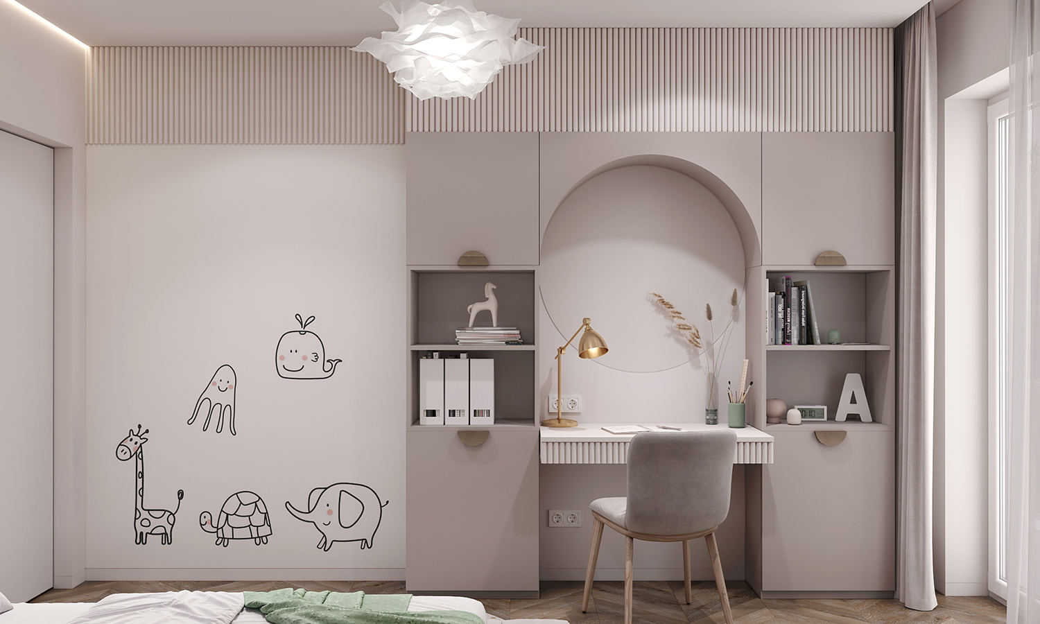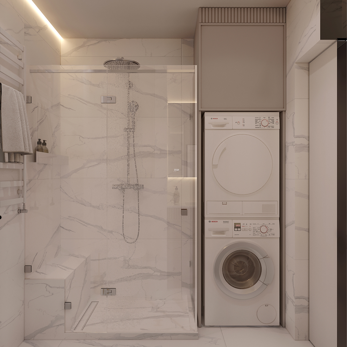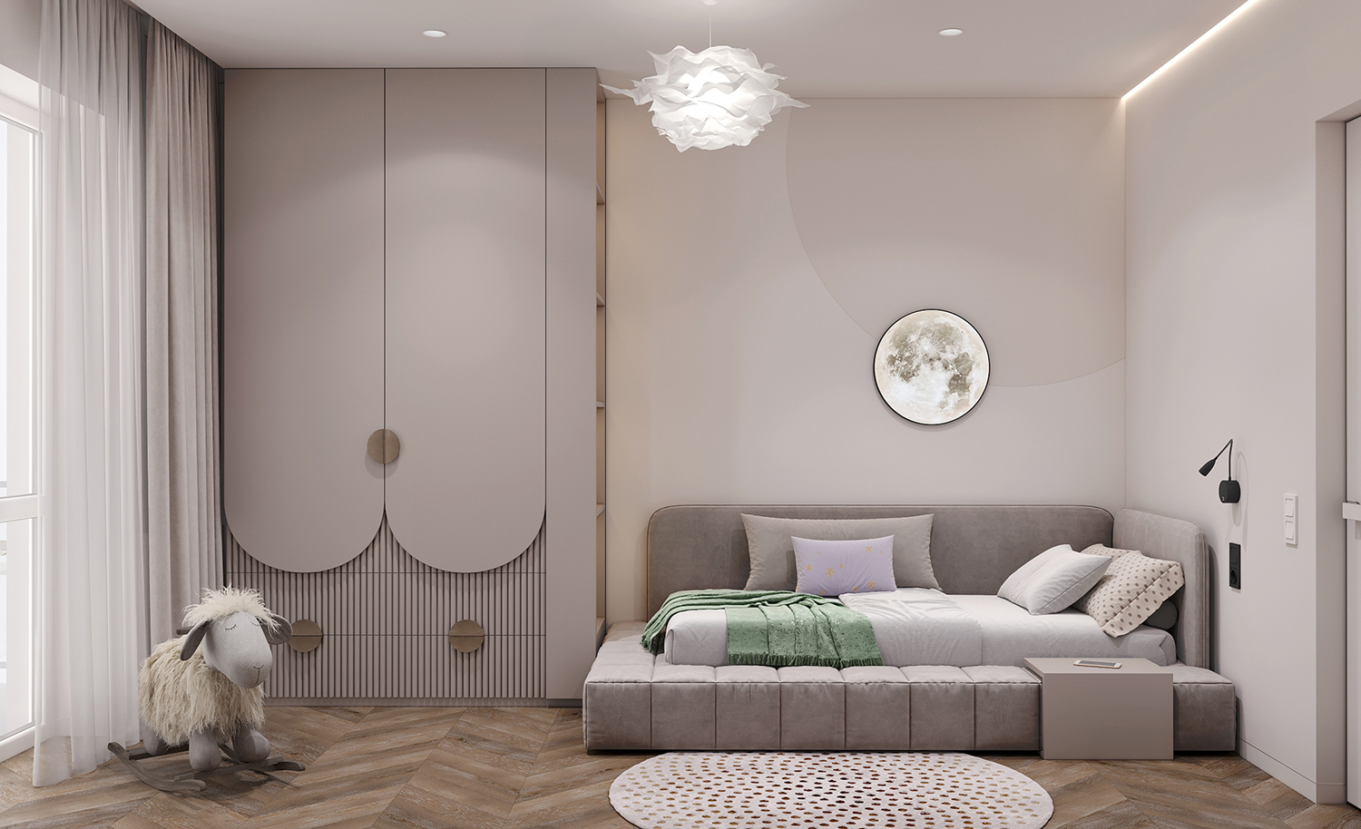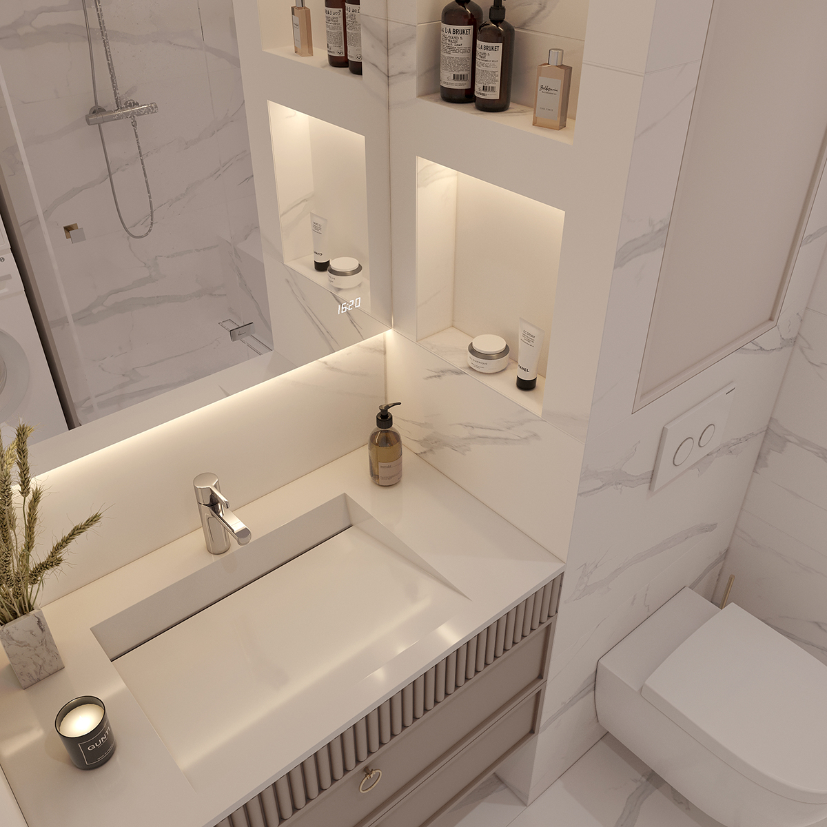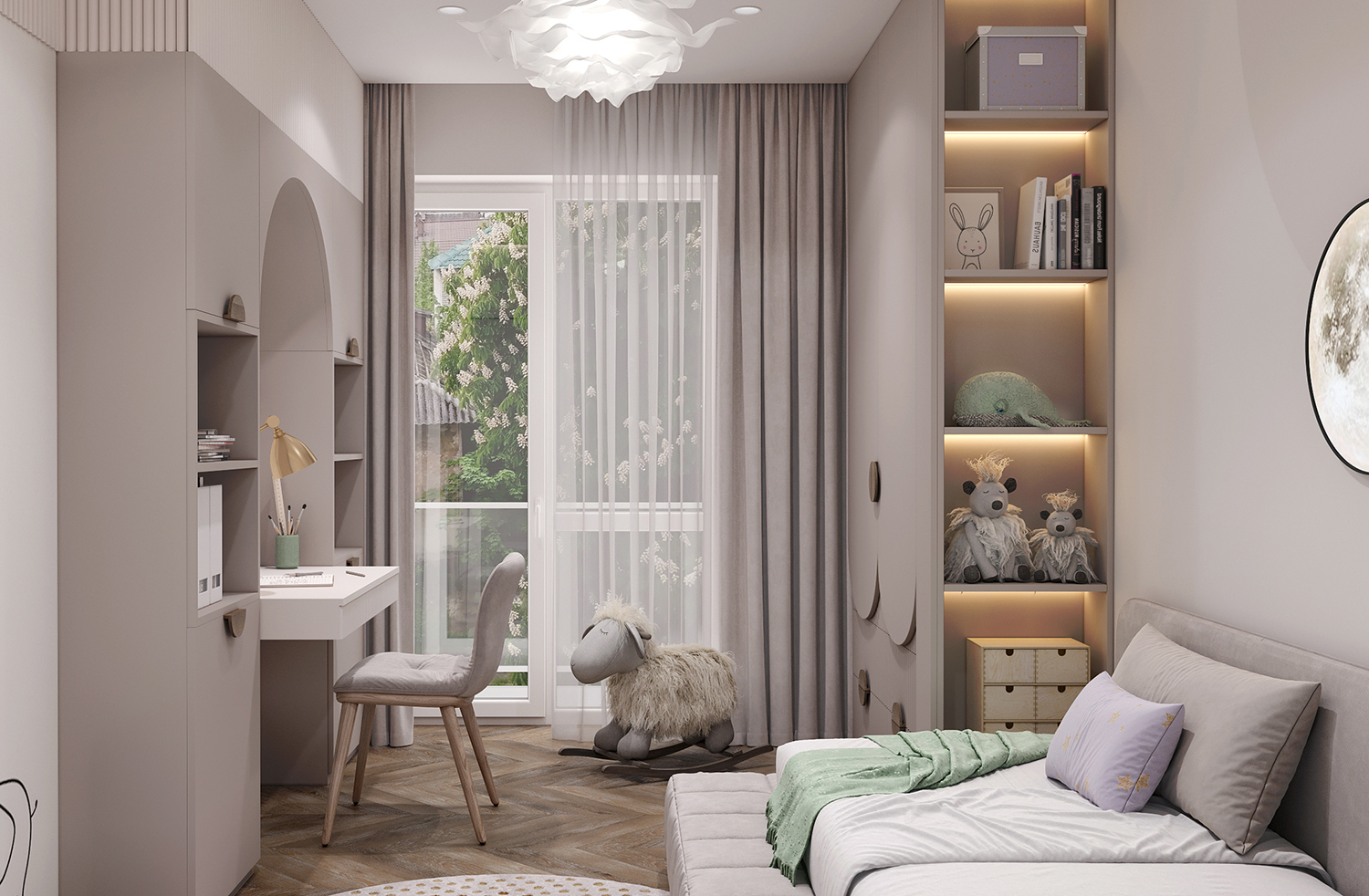 Прихожа та кухня-вітальня формують дизайн інтер’єру з нейтральними та ніжними кольорами з акцентом на салатовому відтінку. Сучасні фасади меблів вражають своєю тонкою та делікатною рамкою, надаючи приміщенню легкості та елегантності. Різні сценарії освітлення – основне, зоноване та підсвітка – додають функціональності і атмосфери. Золоті деталі стають яскравим акцентом, розкриваючи розкіш і шарм цього сучасного інтер’єру.