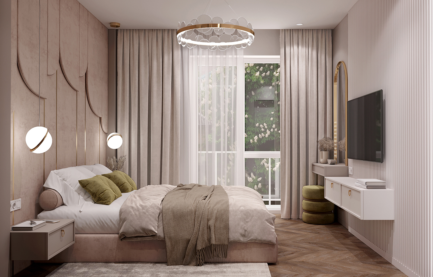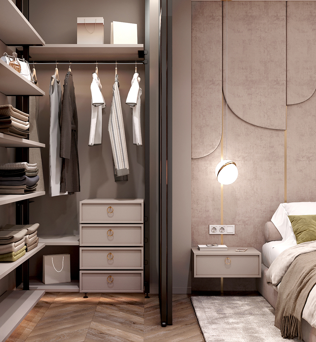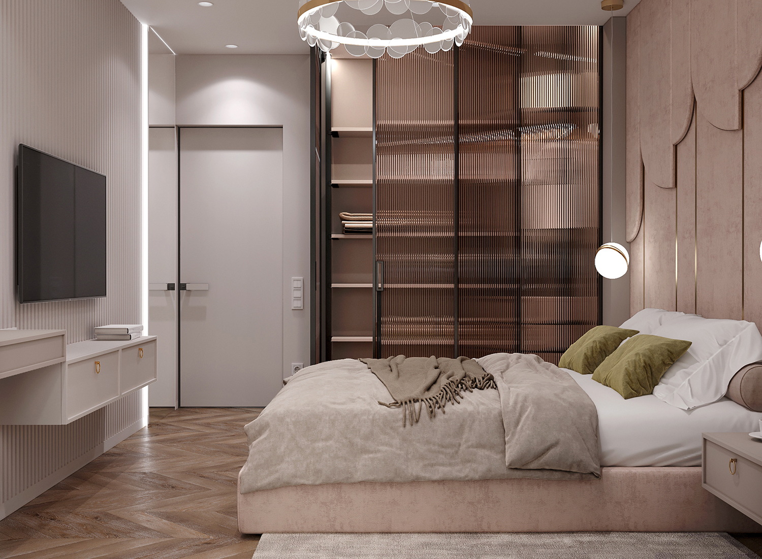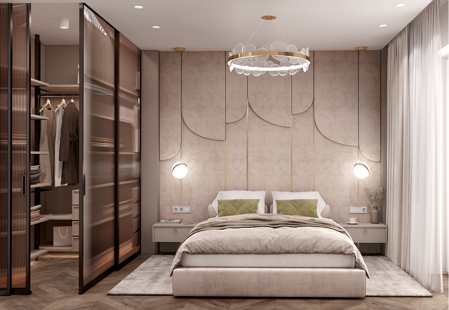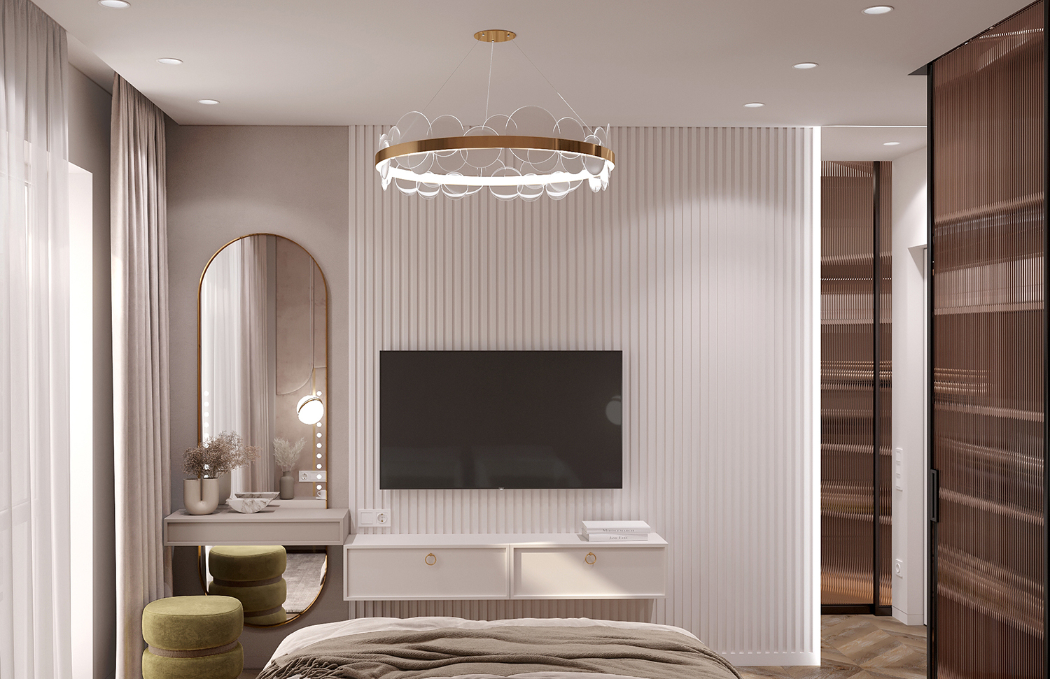 Результат: інтерʼєр вийшов легким та невимушеним, з цікавими дизайнерськими рішеннями. Наприклад, у спальні розмістився скляний гардероб, який миттєво привертає увагу. Скло флутс в смуги створює цікавий ефект розмиття, заскрізь якого ледь видно розташовані за ним речі, додаючи загадковості інтер’єру. Важко не відзначити м’яке узголів’я за ліжком, яке охоплює всю висоту приміщення. Це додає спальні комфорту та елегантності.