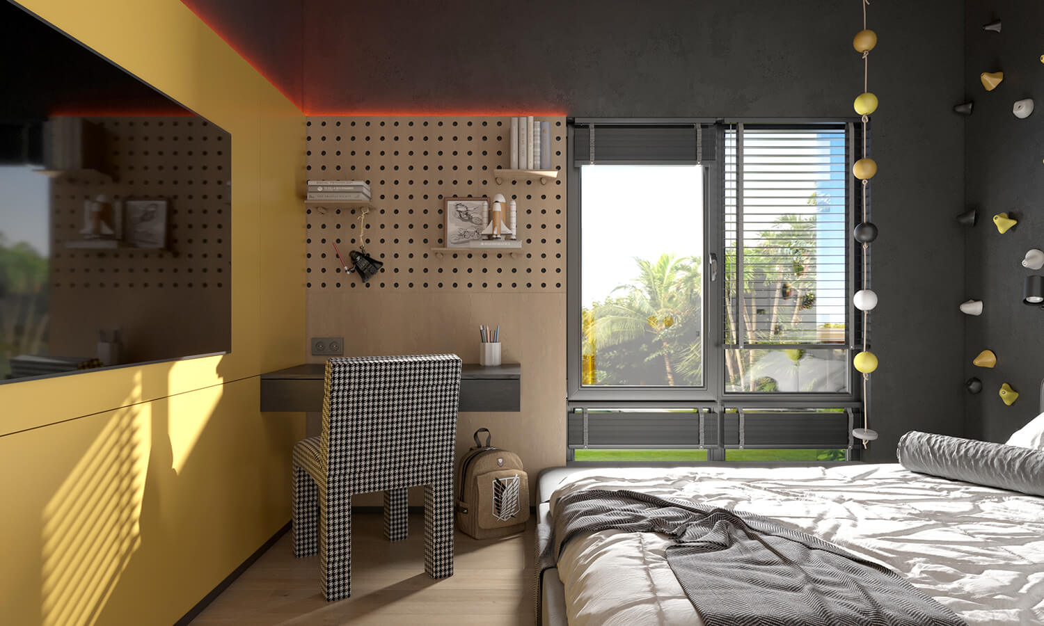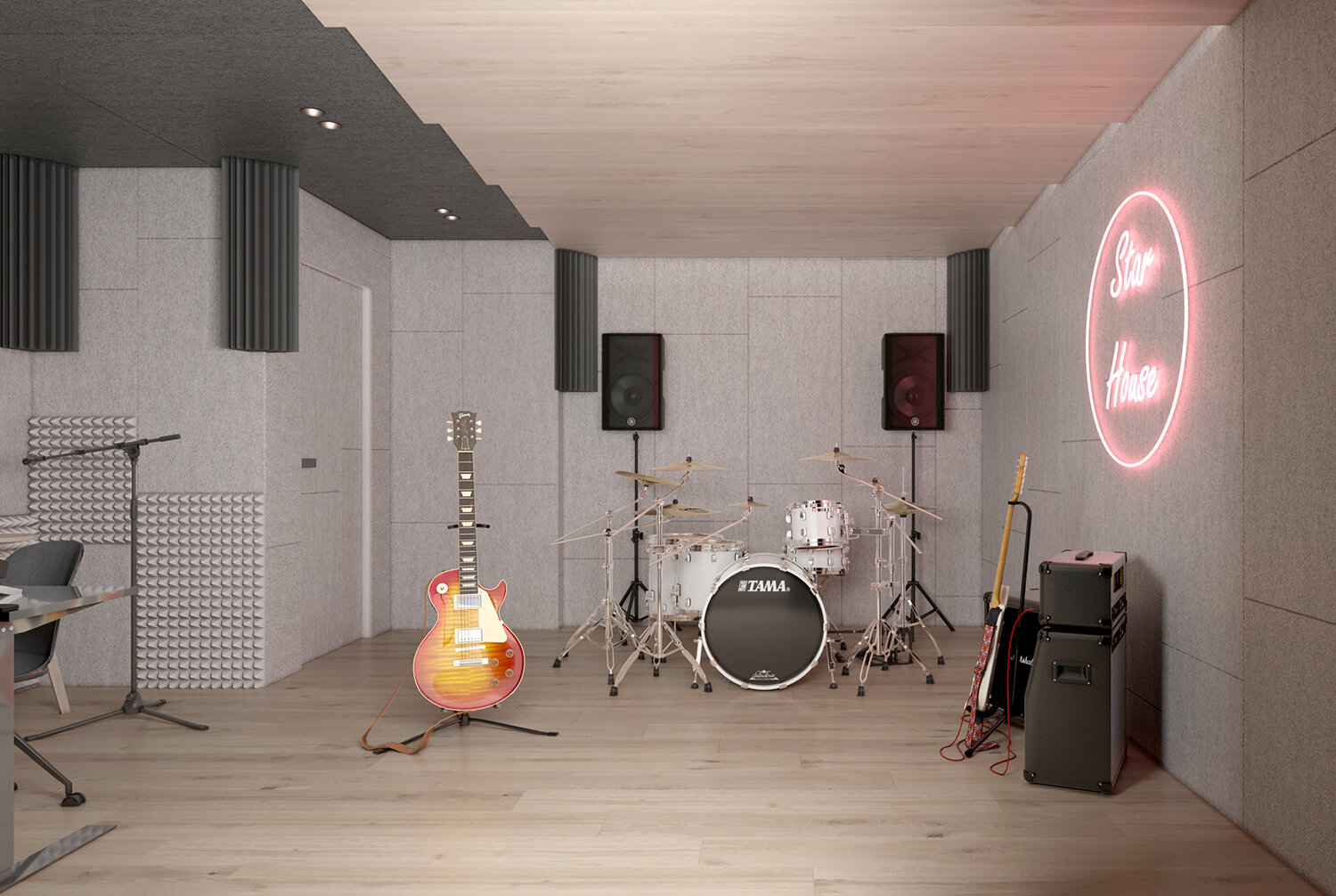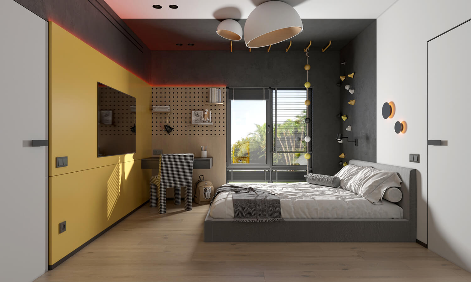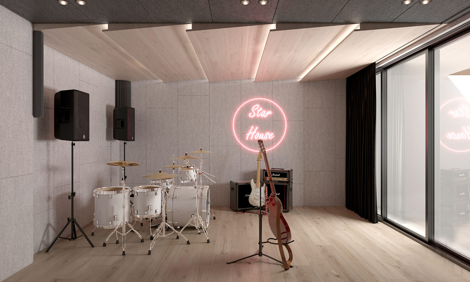 Особливу увагу ми приділили індивідуальним сценаріям: акустичній кімнаті для професійної репетиційної практики, ігрово-відпочинковій зоні для дітей замість гаражу, а також кімнатам для дітей, де дитяче поєднується з відчуттям дорослого, функціонального простору. Кожне з цих рішень – відповідь на конкретний запит родини та частина єдиної історії дому.