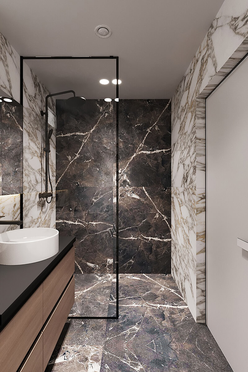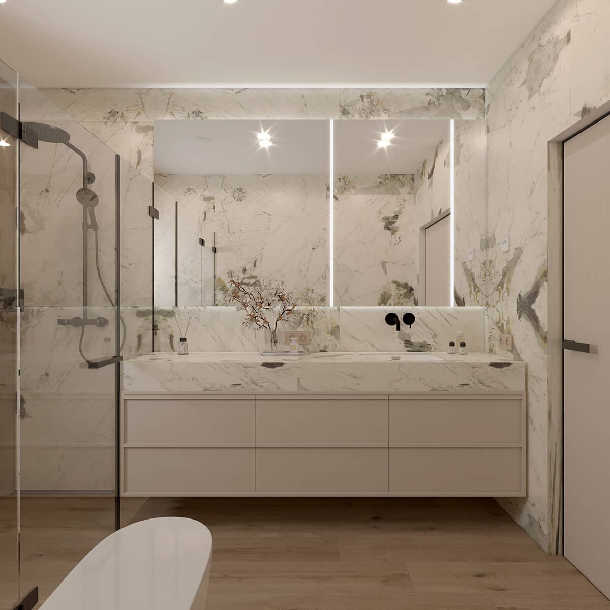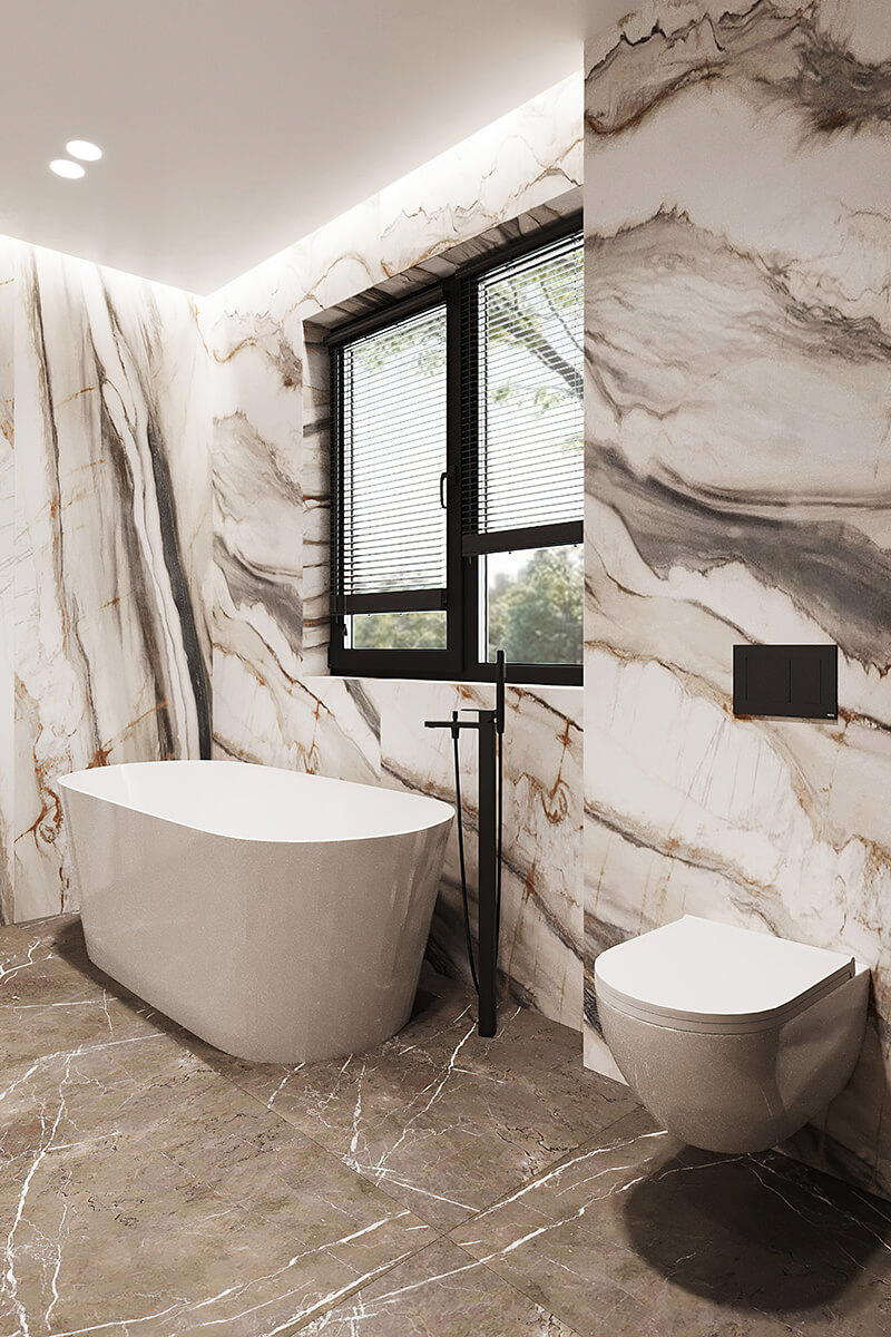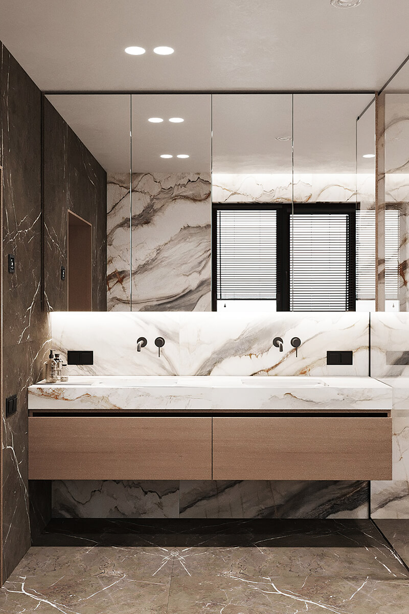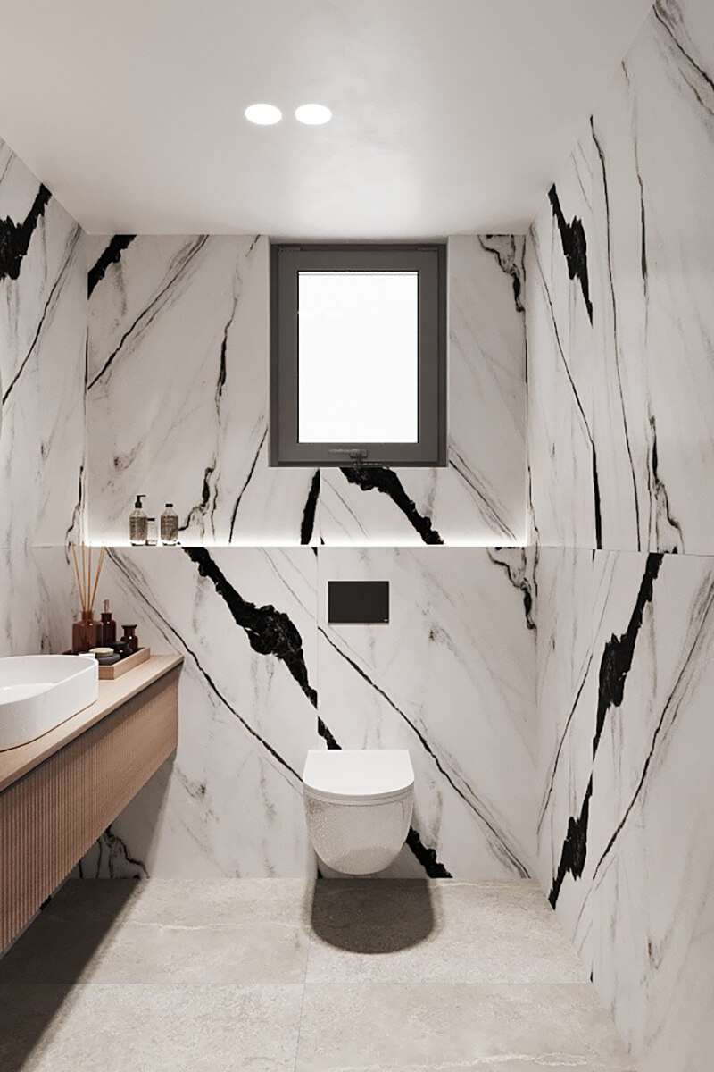 Приватні зони вирішені як продовження загальної концепції дому, але з власним характером. Спальня вирішена як простір глибокого спокою та відновлення, де м’яка нейтральна палітра, тактильні текстури та чітка симетрія формують відчуття балансу й приватності: акцентна стіна з поєднанням дерева та рельєфних панелей задає ритм інтер’єру, м’яке узголів’я ліжка підсилює відчуття комфорту. Санвузол, спроєктований за принципом готельної приватності, поєднує мінімалізм, текстури каменю та дзеркальні площини. Гостьові й додаткові санвузли демонструють, як навіть компактні простори можуть бути виразними завдяки роботі з матеріалами, світлом і деталями.