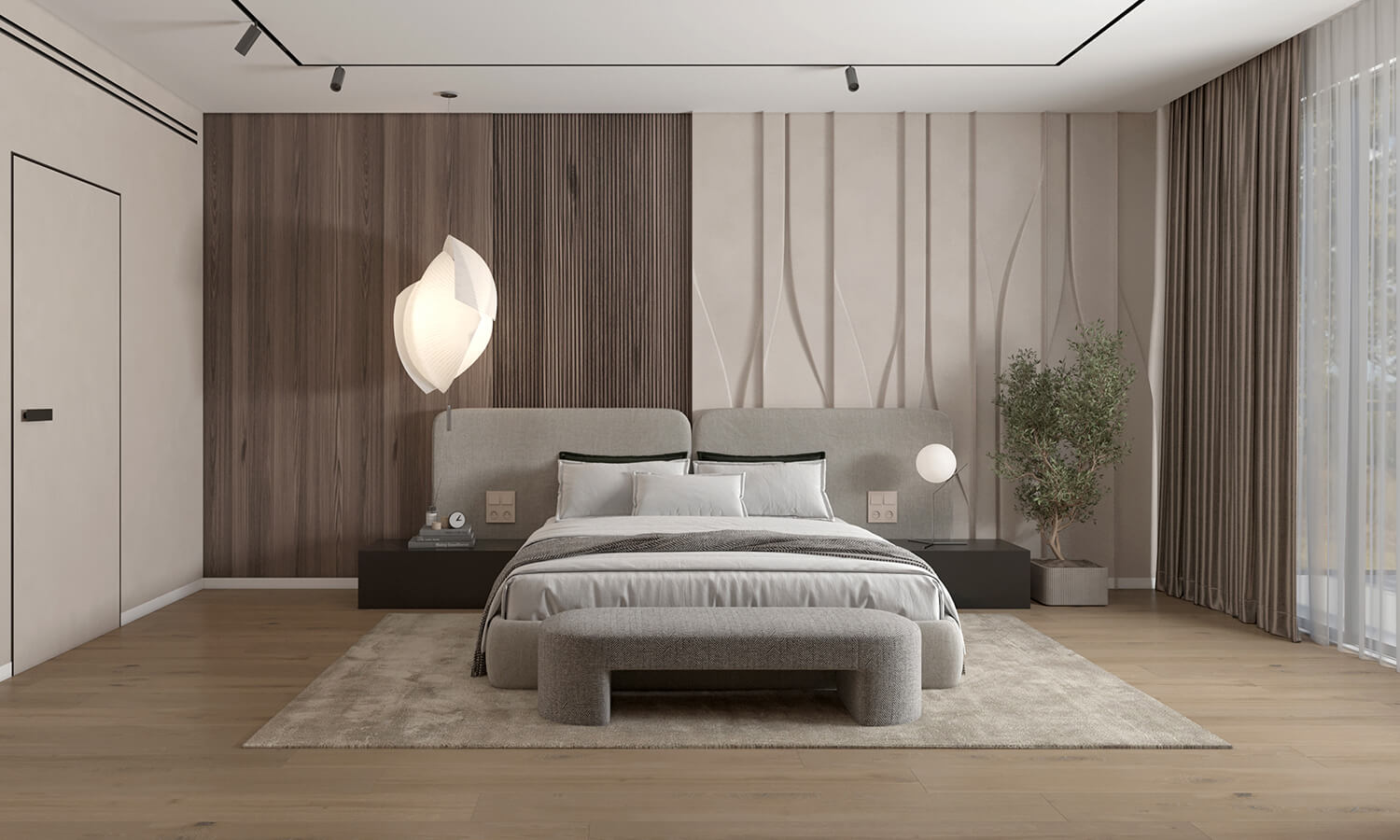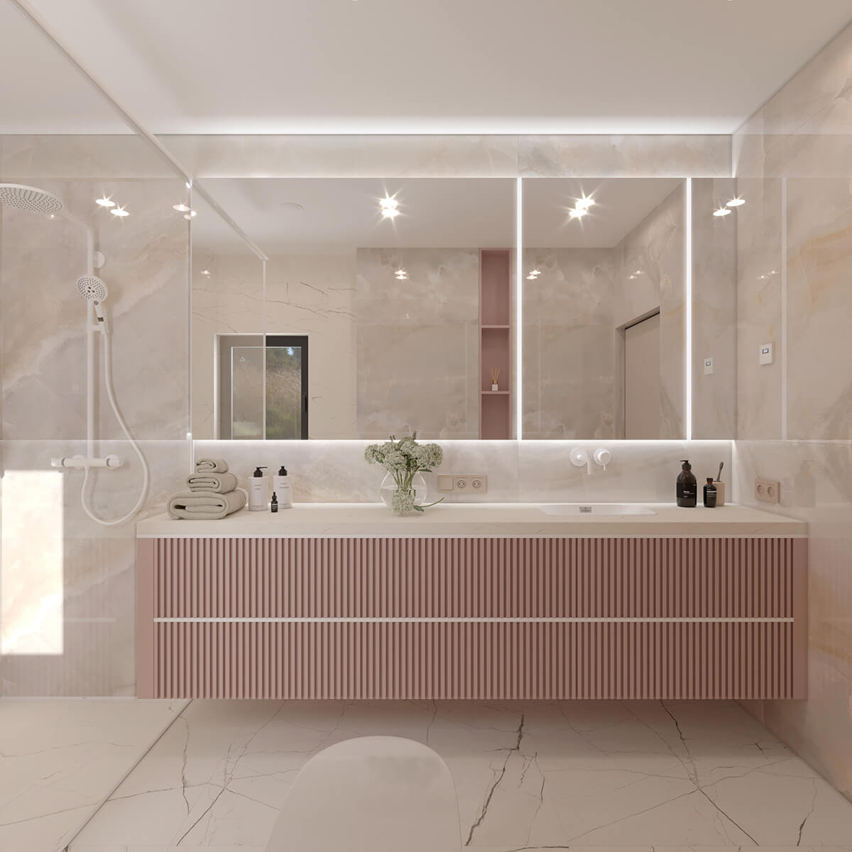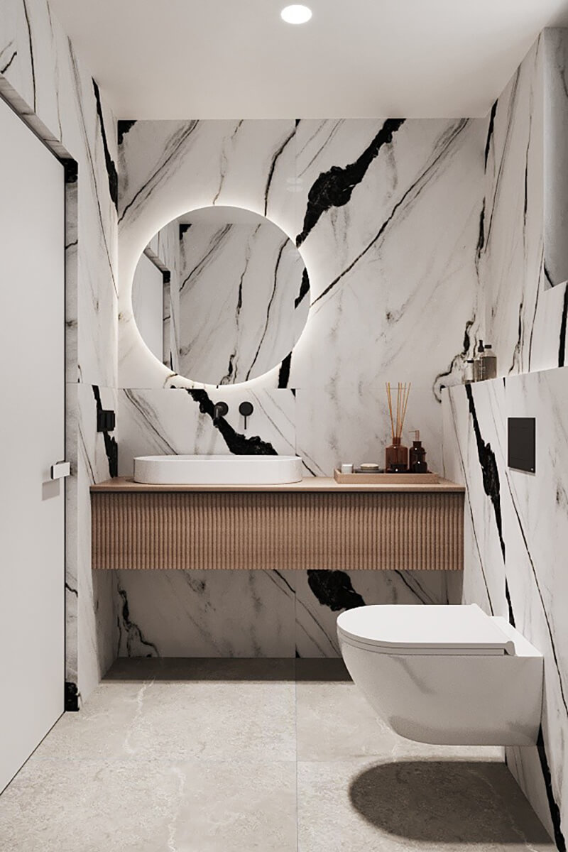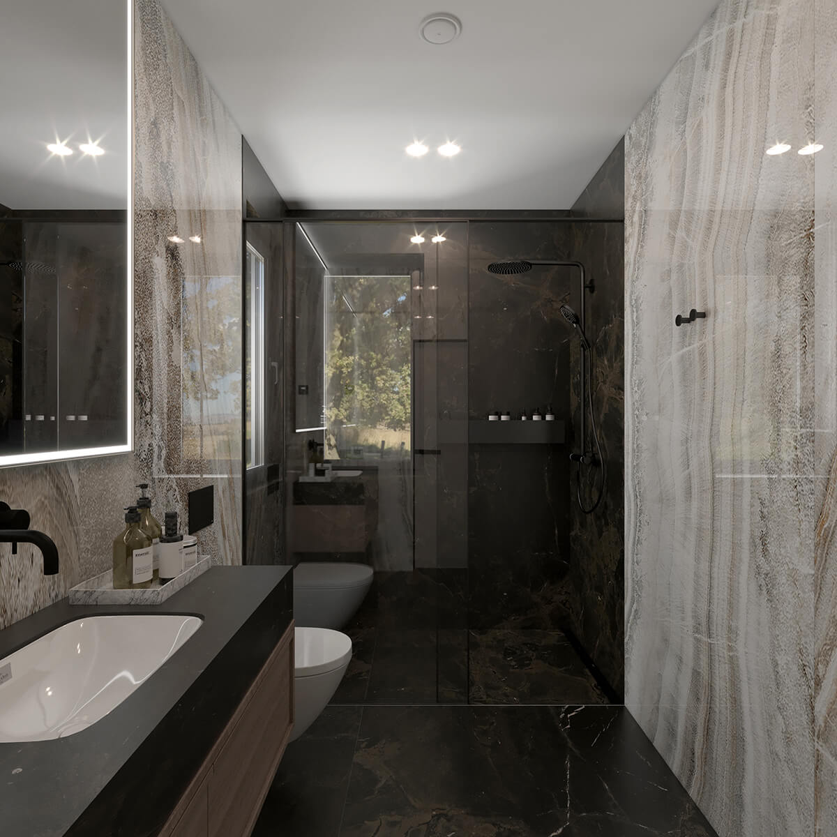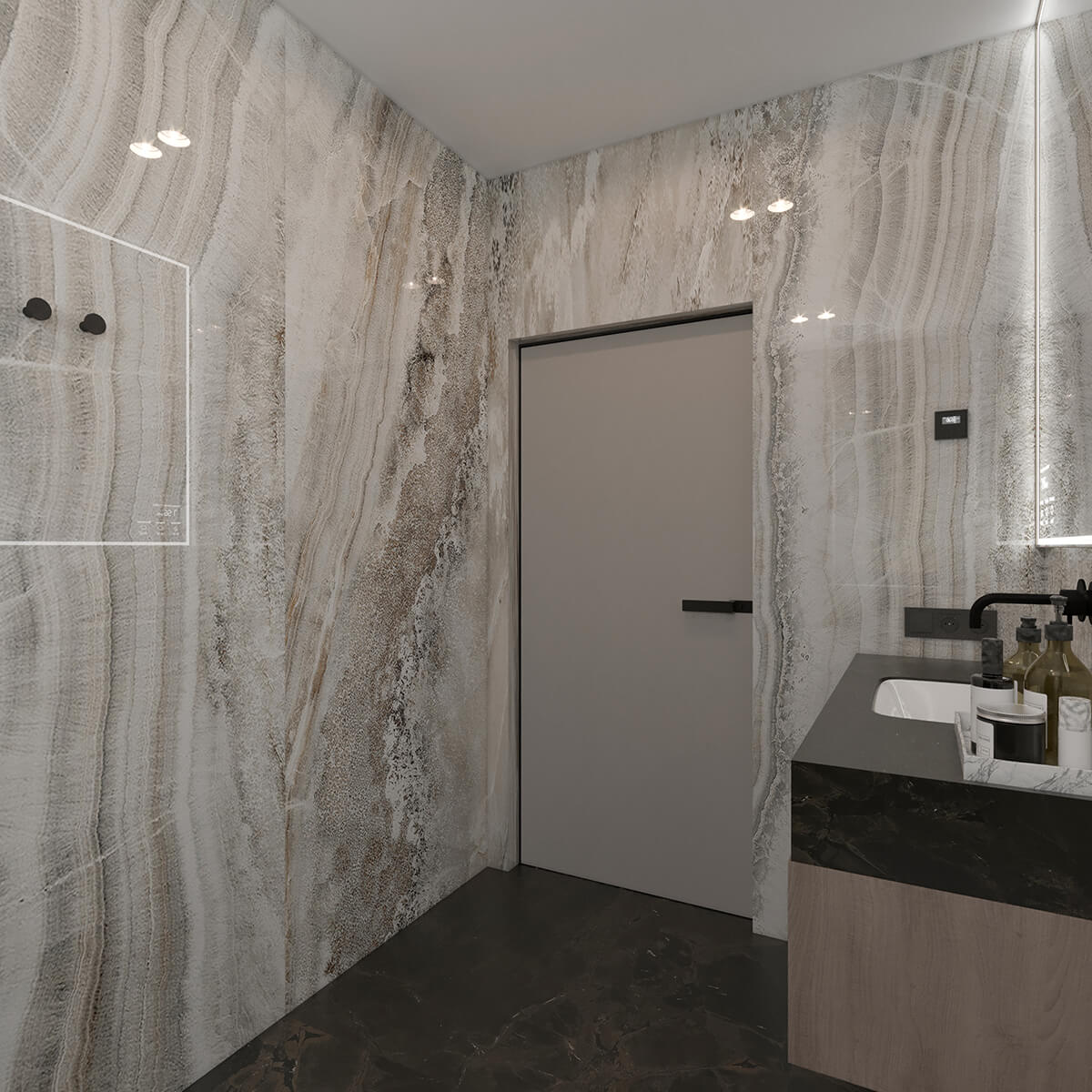 Приватні зони вирішені як продовження загальної концепції дому, але з власним характером. Спальня вирішена як простір глибокого спокою та відновлення, де м’яка нейтральна палітра, тактильні текстури та чітка симетрія формують відчуття балансу й приватності: акцентна стіна з поєднанням дерева та рельєфних панелей задає ритм інтер’єру, м’яке узголів’я ліжка підсилює відчуття комфорту. Санвузол, спроєктований за принципом готельної приватності, поєднує мінімалізм, текстури каменю та дзеркальні площини. Гостьові й додаткові санвузли демонструють, як навіть компактні простори можуть бути виразними завдяки роботі з матеріалами, світлом і деталями.