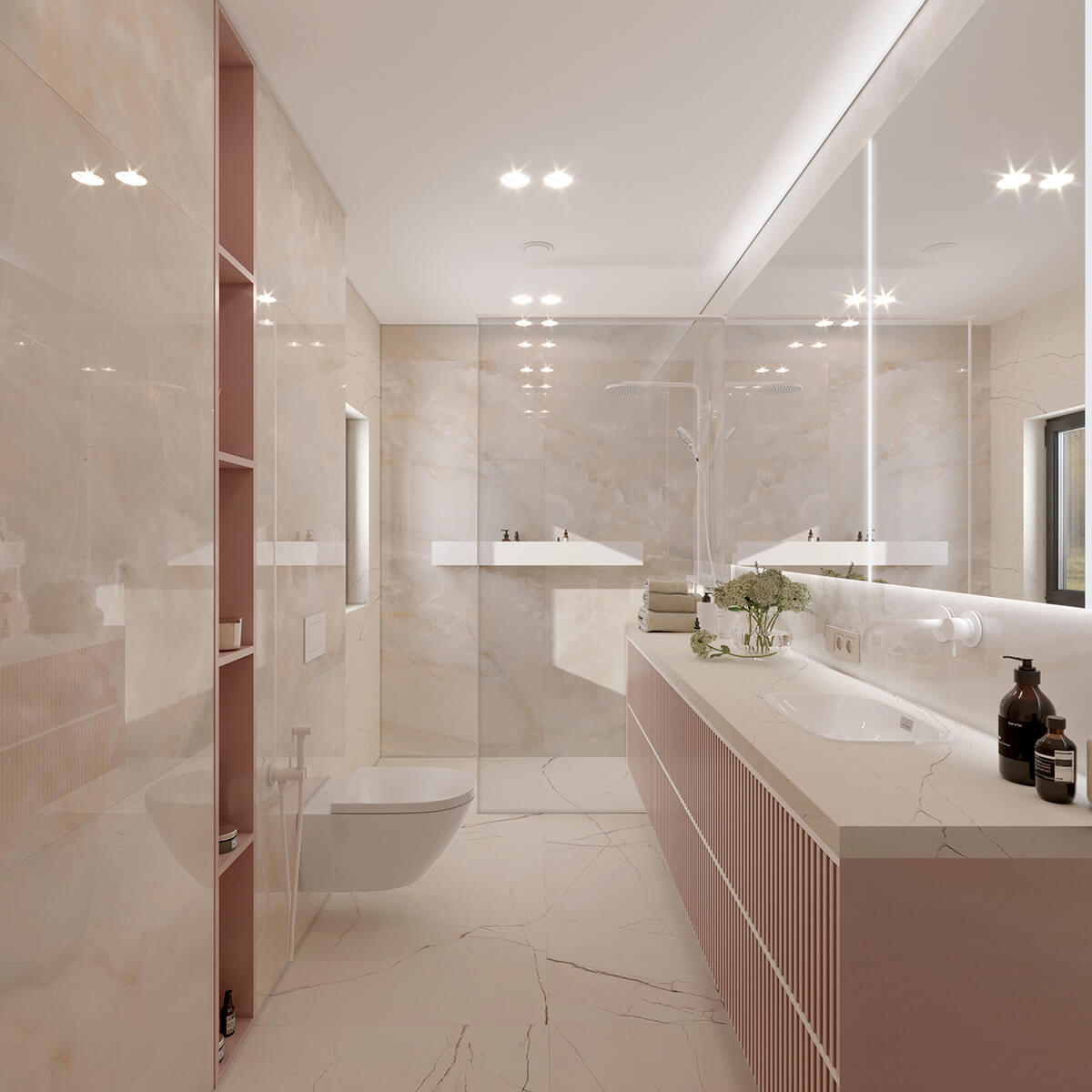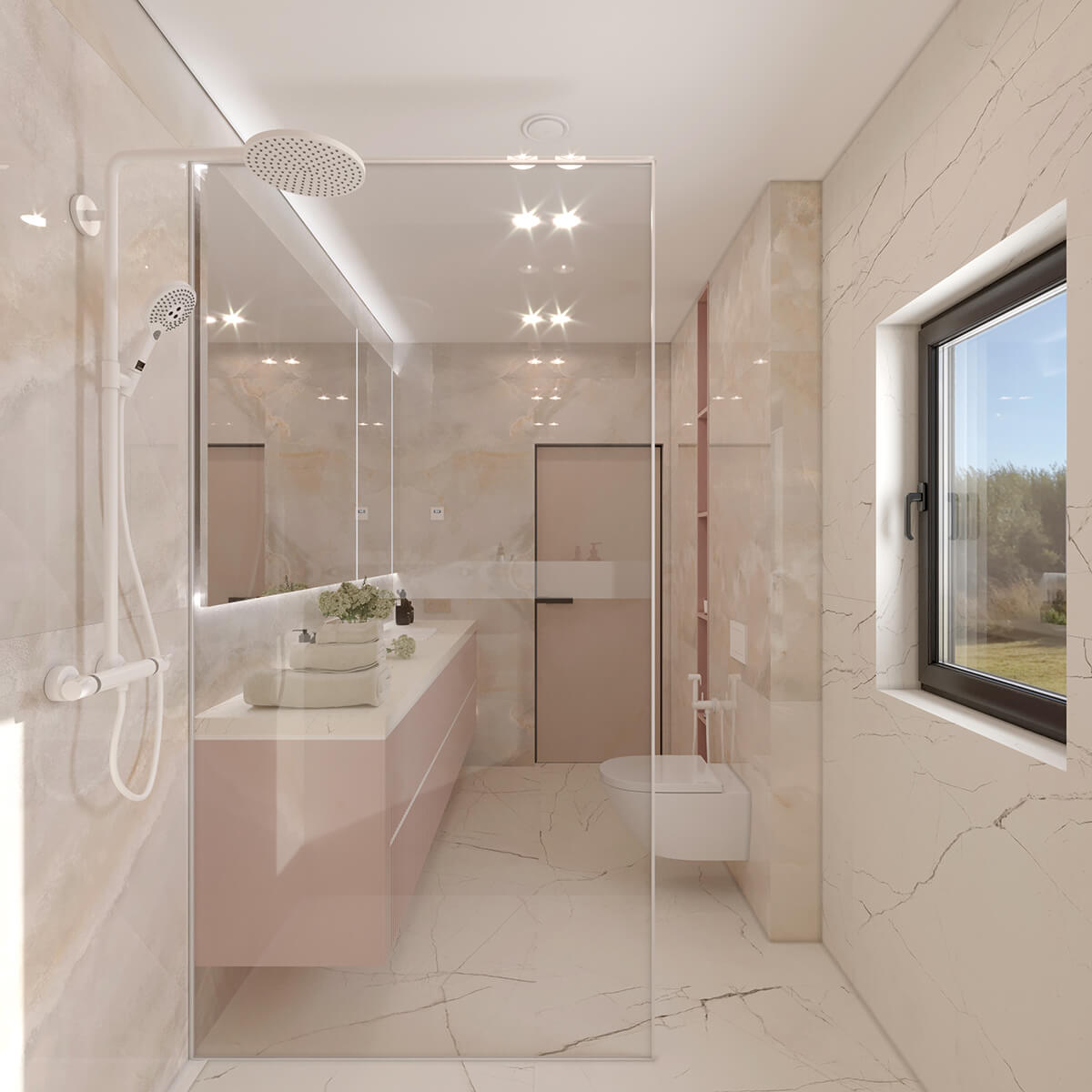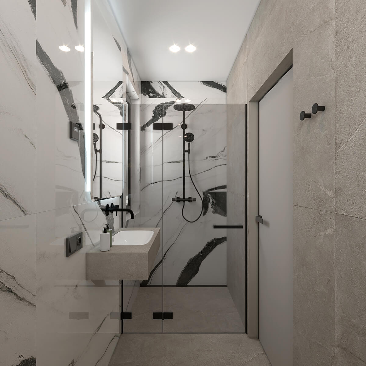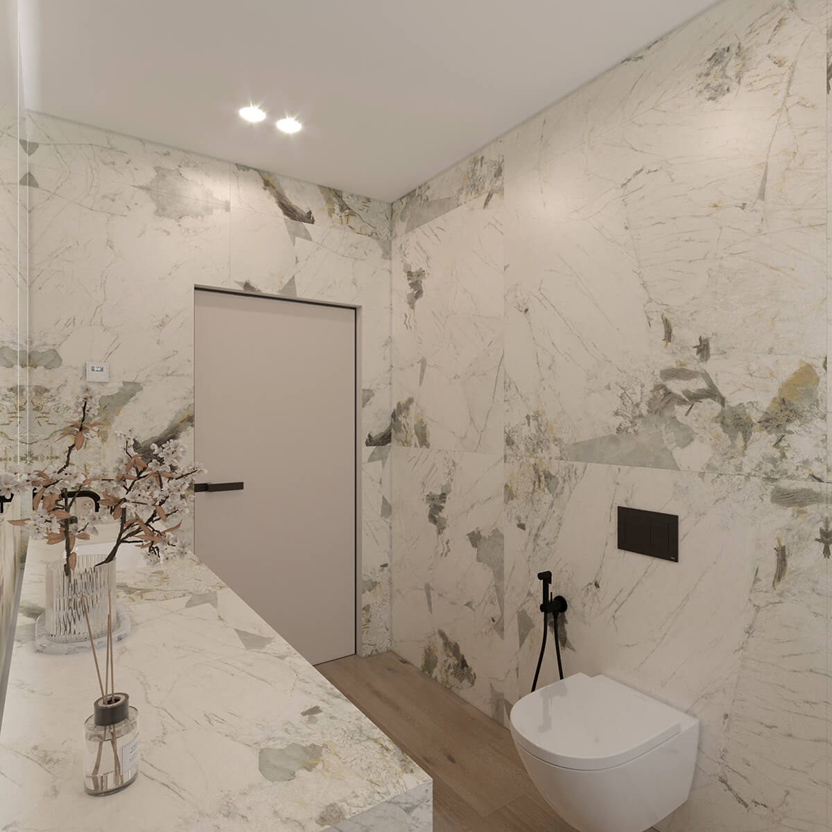 Приватні зони вирішені як продовження загальної концепції дому, але з власним характером. Спальня вирішена як простір глибокого спокою та відновлення, де м’яка нейтральна палітра, тактильні текстури та чітка симетрія формують відчуття балансу й приватності: акцентна стіна з поєднанням дерева та рельєфних панелей задає ритм інтер’єру, м’яке узголів’я ліжка підсилює відчуття комфорту. Санвузол, спроєктований за принципом готельної приватності, поєднує мінімалізм, текстури каменю та дзеркальні площини. Гостьові й додаткові санвузли демонструють, як навіть компактні простори можуть бути виразними завдяки роботі з матеріалами, світлом і деталями.