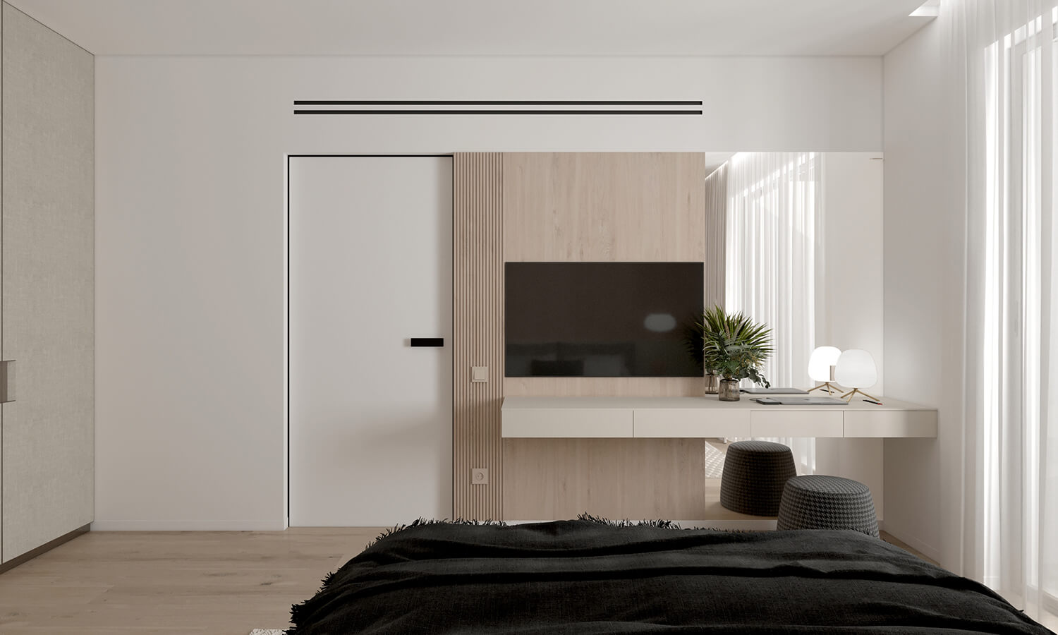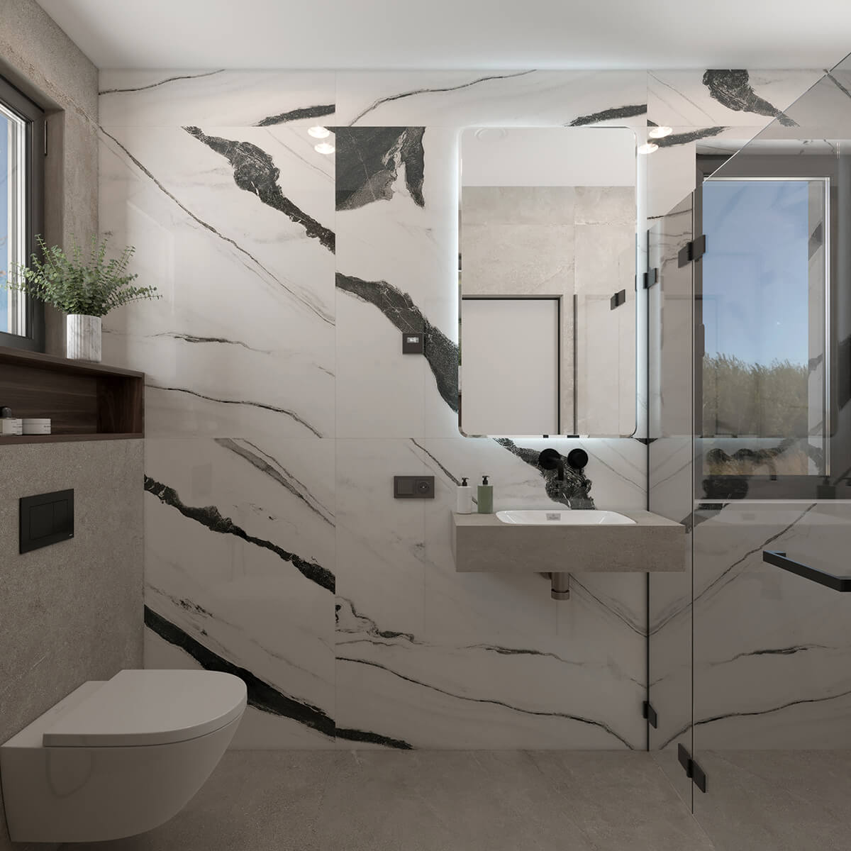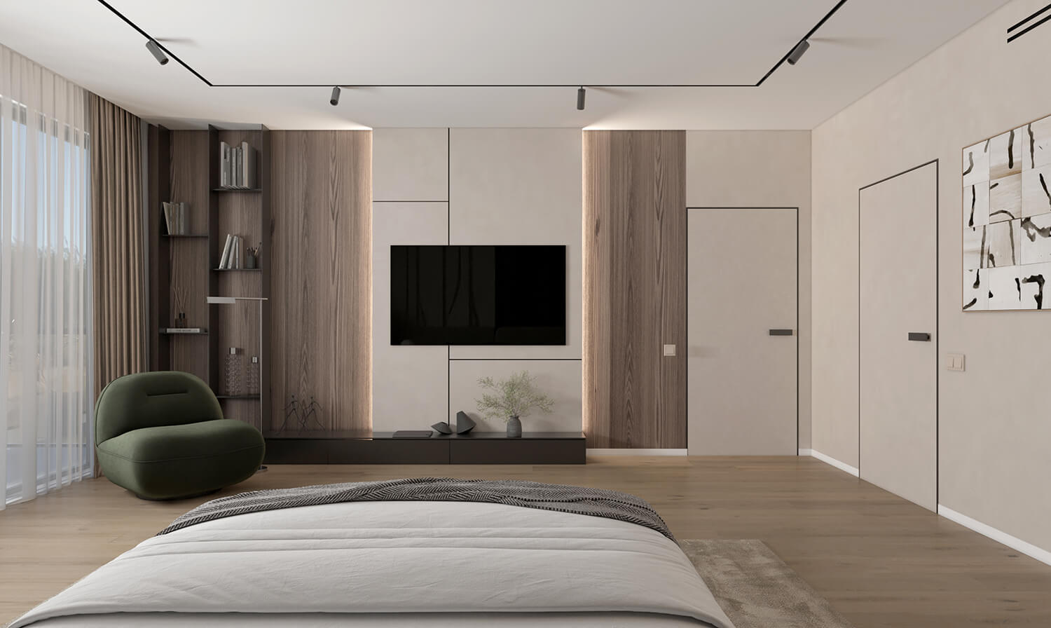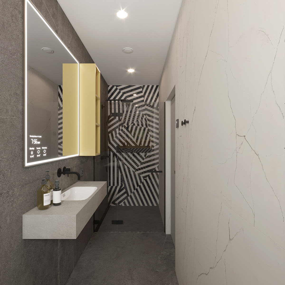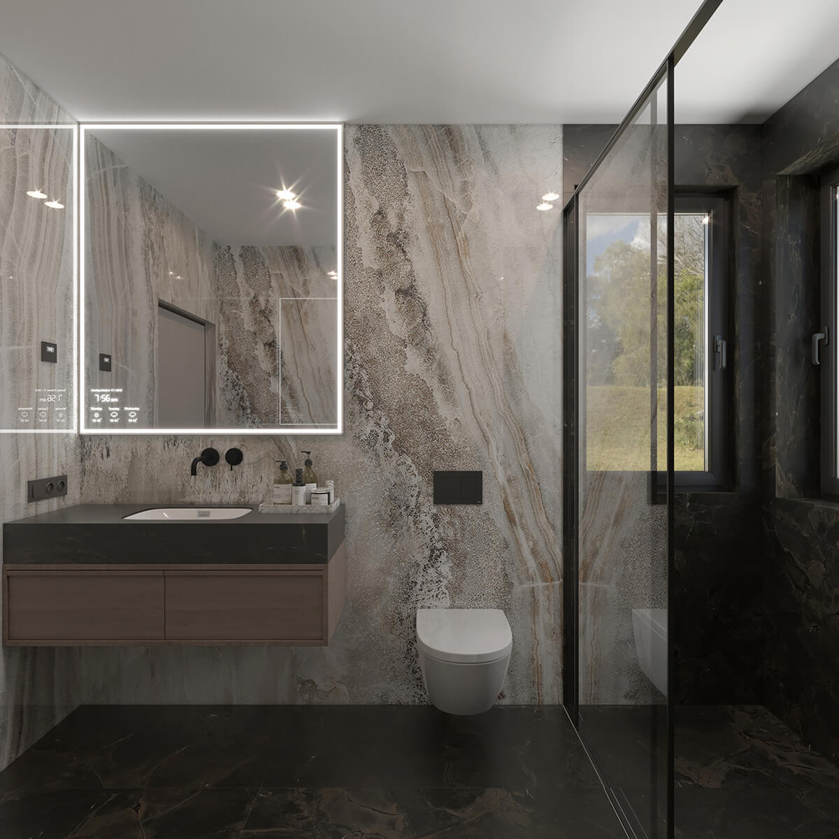 Приватні зони вирішені як продовження загальної концепції дому, але з власним характером. Спальня вирішена як простір глибокого спокою та відновлення, де м’яка нейтральна палітра, тактильні текстури та чітка симетрія формують відчуття балансу й приватності: акцентна стіна з поєднанням дерева та рельєфних панелей задає ритм інтер’єру, м’яке узголів’я ліжка підсилює відчуття комфорту. Санвузол, спроєктований за принципом готельної приватності, поєднує мінімалізм, текстури каменю та дзеркальні площини. Гостьові й додаткові санвузли демонструють, як навіть компактні простори можуть бути виразними завдяки роботі з матеріалами, світлом і деталями.