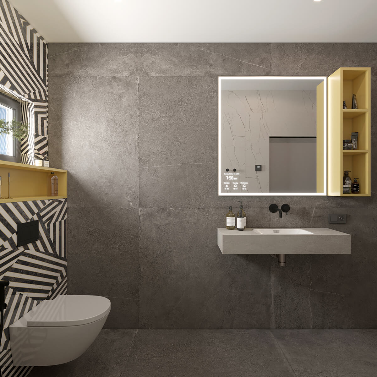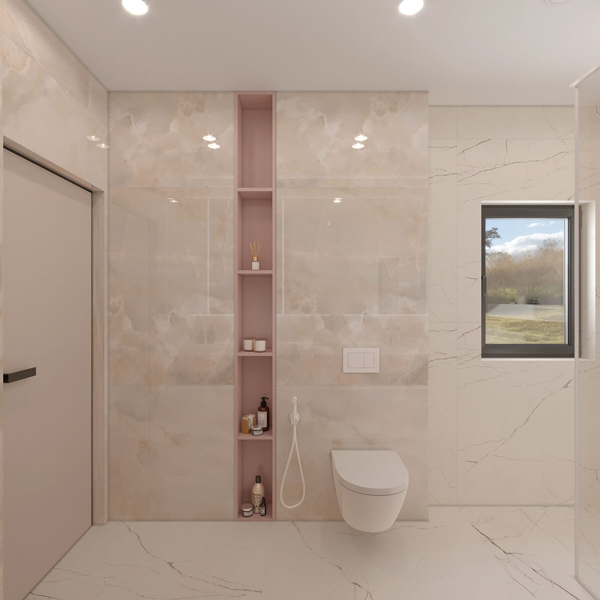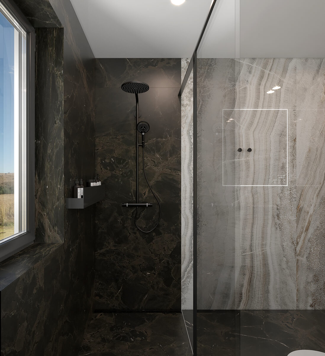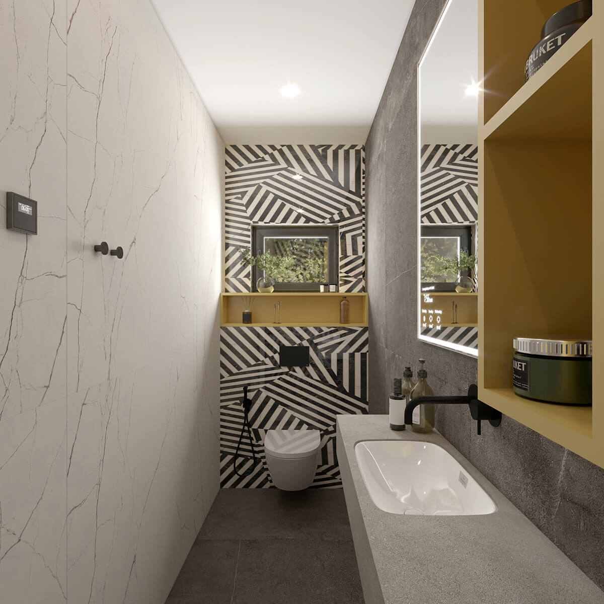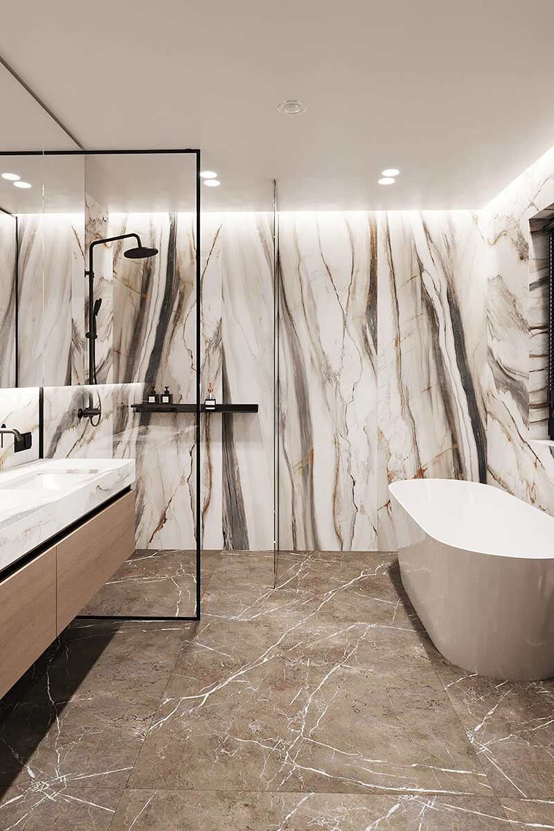 Приватні зони вирішені як продовження загальної концепції дому, але з власним характером. Спальня вирішена як простір глибокого спокою та відновлення, де м’яка нейтральна палітра, тактильні текстури та чітка симетрія формують відчуття балансу й приватності: акцентна стіна з поєднанням дерева та рельєфних панелей задає ритм інтер’єру, м’яке узголів’я ліжка підсилює відчуття комфорту. Санвузол, спроєктований за принципом готельної приватності, поєднує мінімалізм, текстури каменю та дзеркальні площини. Гостьові й додаткові санвузли демонструють, як навіть компактні простори можуть бути виразними завдяки роботі з матеріалами, світлом і деталями.