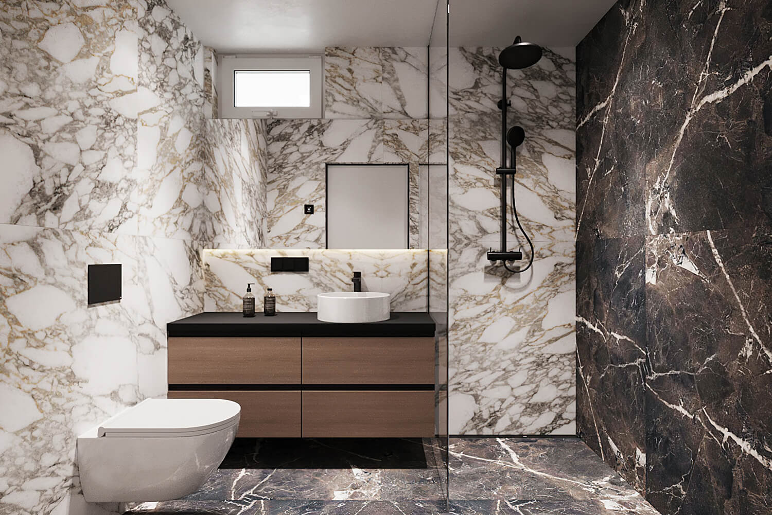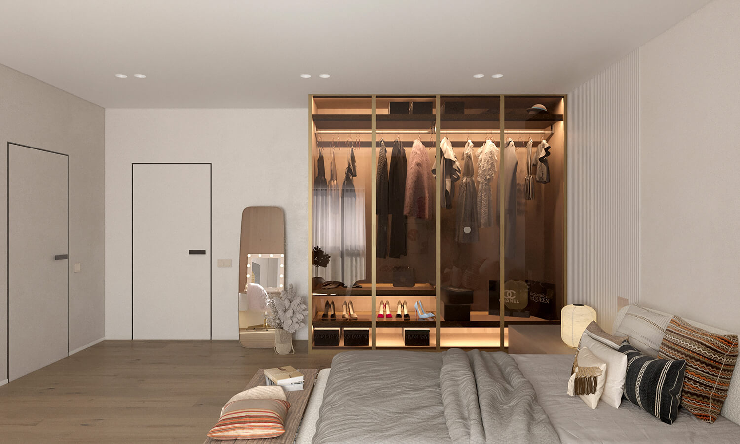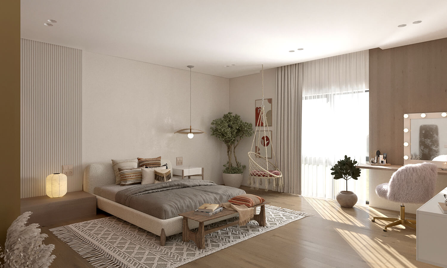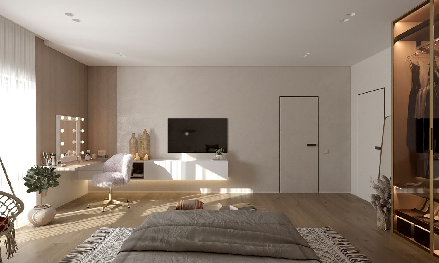 Приватні зони вирішені як продовження загальної концепції дому, але з власним характером. Спальня вирішена як простір глибокого спокою та відновлення, де м’яка нейтральна палітра, тактильні текстури та чітка симетрія формують відчуття балансу й приватності: акцентна стіна з поєднанням дерева та рельєфних панелей задає ритм інтер’єру, м’яке узголів’я ліжка підсилює відчуття комфорту. Санвузол, спроєктований за принципом готельної приватності, поєднує мінімалізм, текстури каменю та дзеркальні площини. Гостьові й додаткові санвузли демонструють, як навіть компактні простори можуть бути виразними завдяки роботі з матеріалами, світлом і деталями.