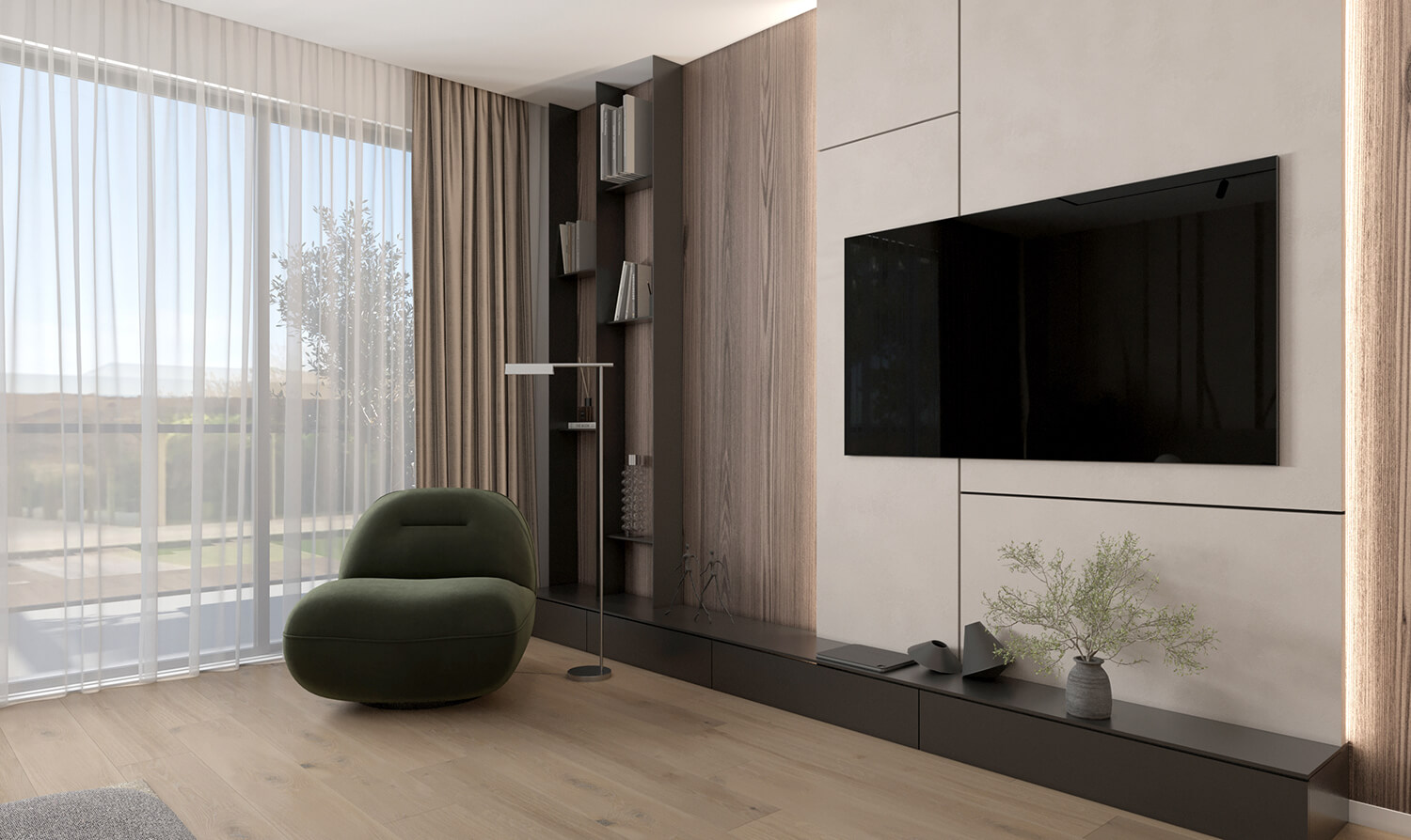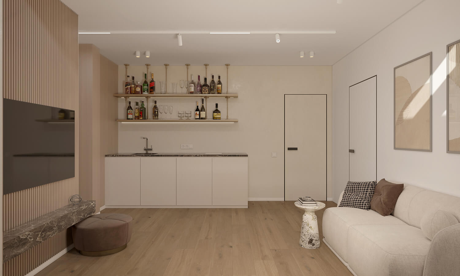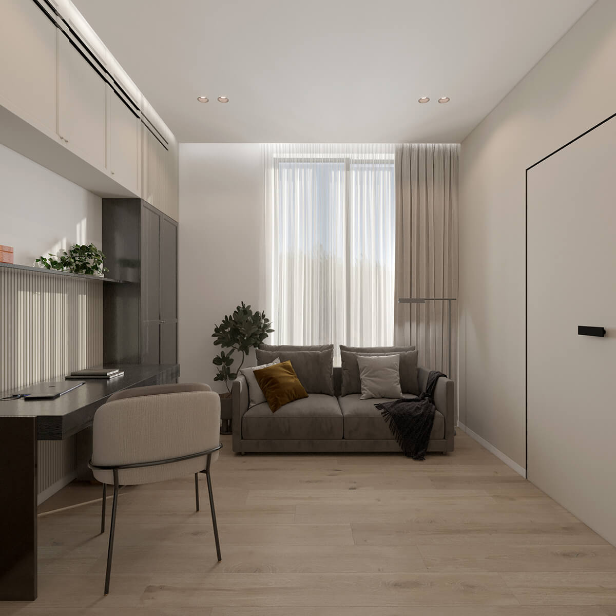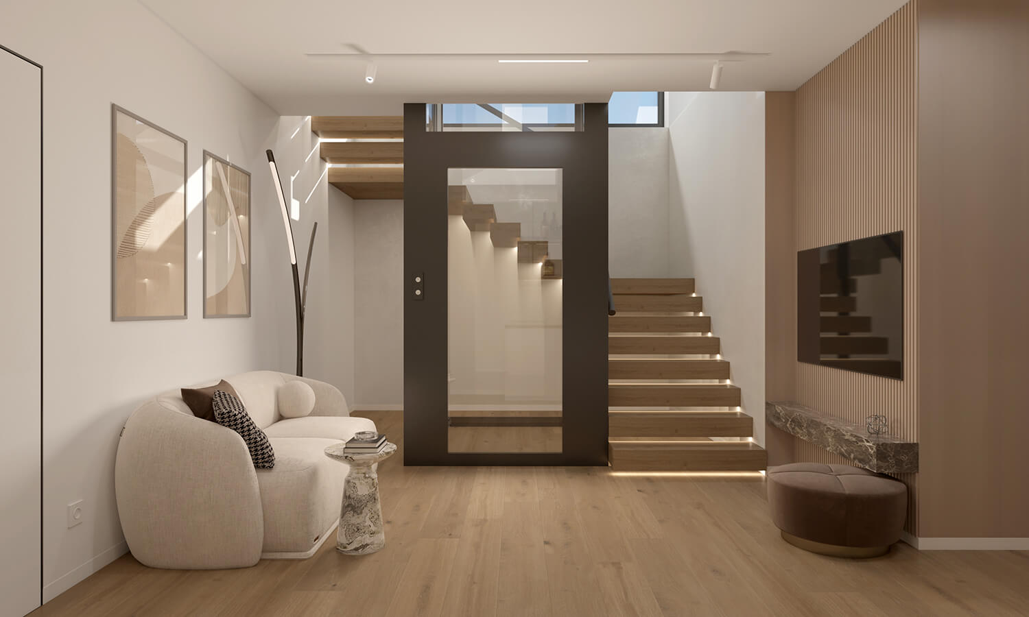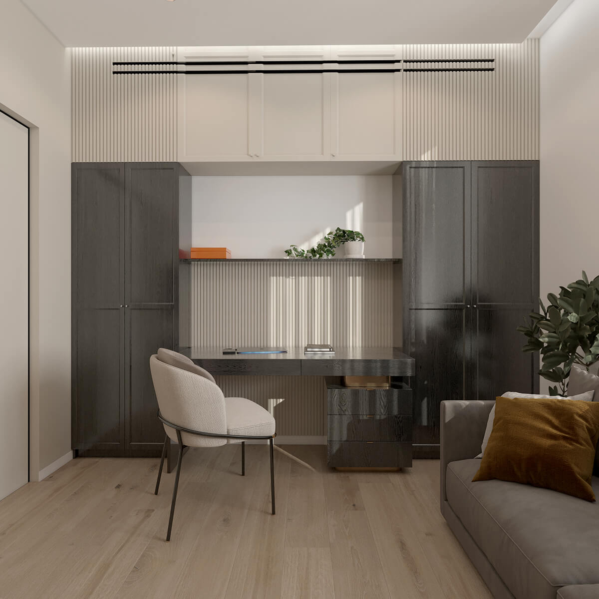 Цей проєкт – про дім, який живе разом із родиною та змінюється разом із нею. Ми працювали з простором як із цілісною системою, де важливою є не лише естетика, а й сценарії життя: спільні моменти, особисті паузи, тиша, рух і емоції. В основі концепції – тепла, заземлена палітра, природні текстури дерева й каменю, живі рослини та м’яке світло, що формує відчуття спокою й балансу.
