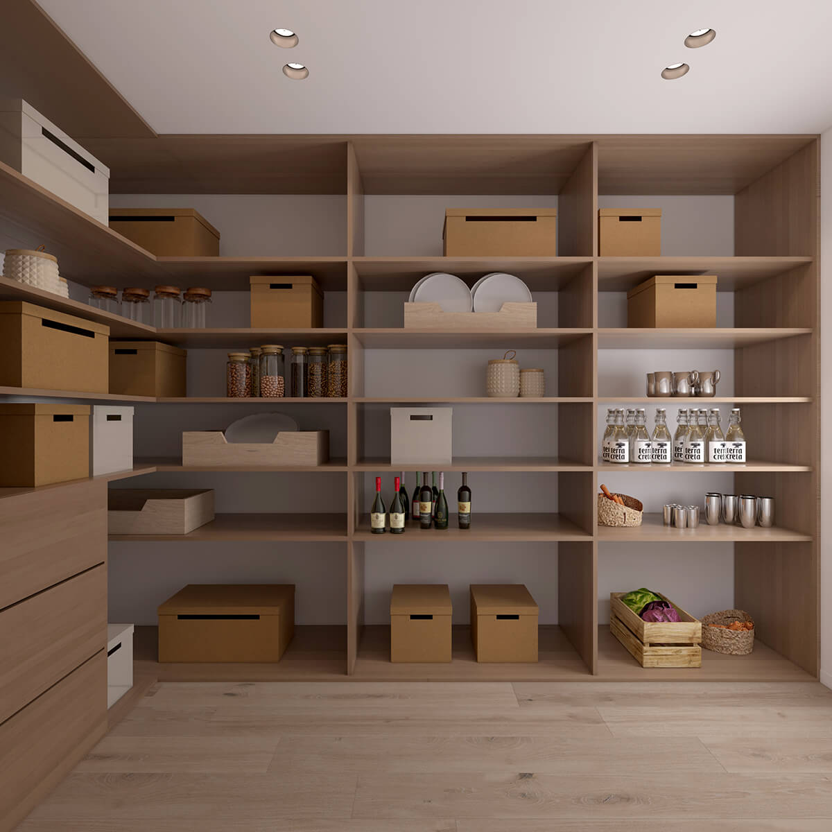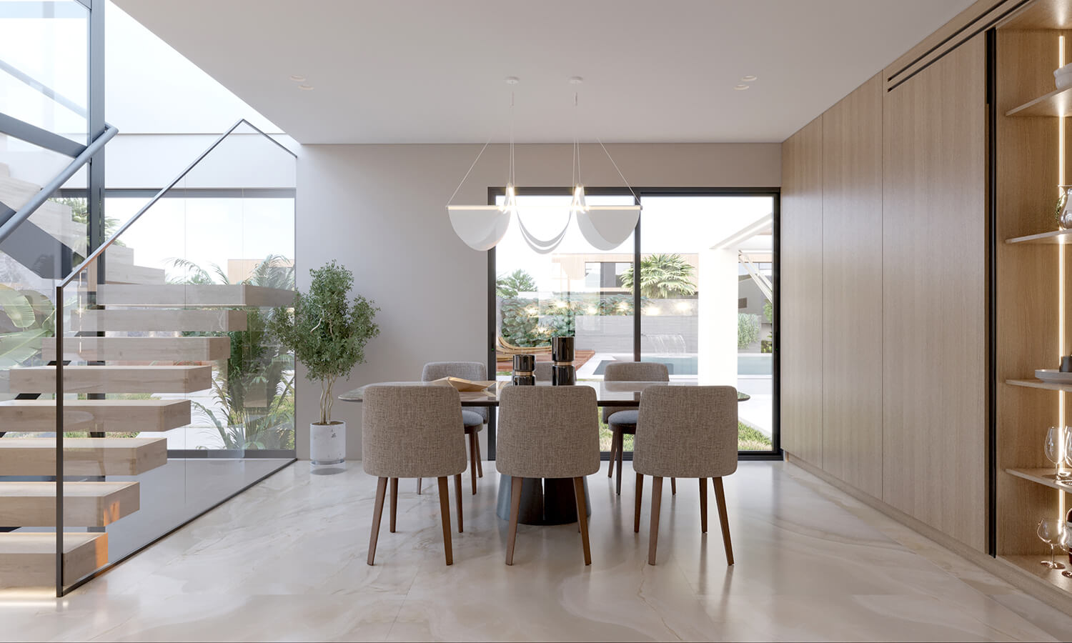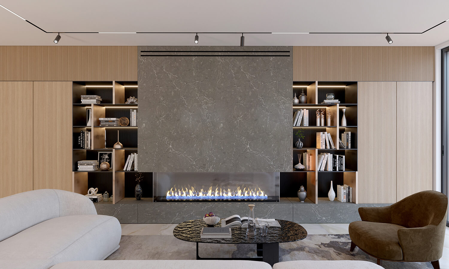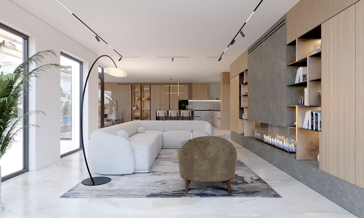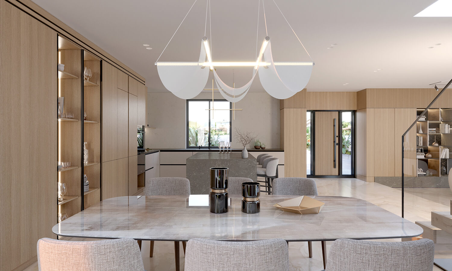 Кухня спроєктована як місце взаємодії та життя. Великий острів став композиційним і функціональним центром. Відмова від верхніх шаф відкрила простір і наповнила його світлом, а вся техніка органічно інтегрована в нижні модулі. Кам’яні фактури, скляна вітрина з підсвіткою та продумані сценарії освітлення формують спокійний, але глибокий настрій.