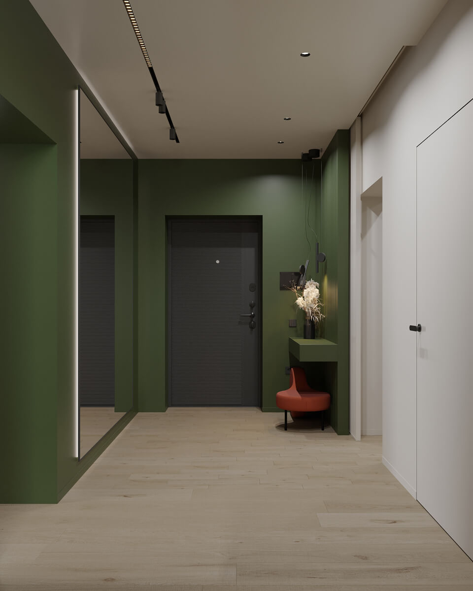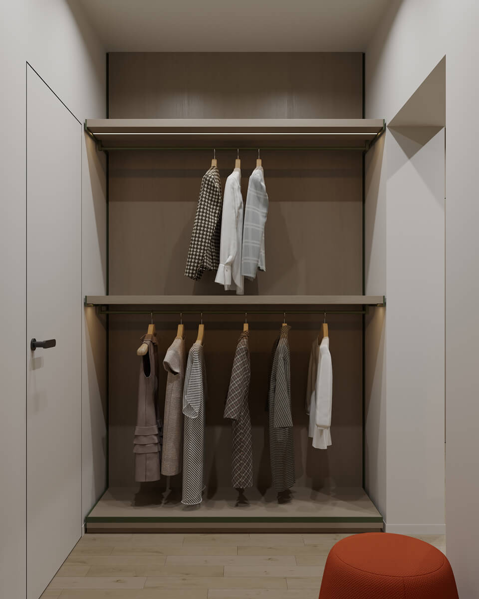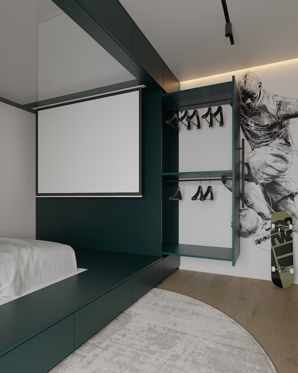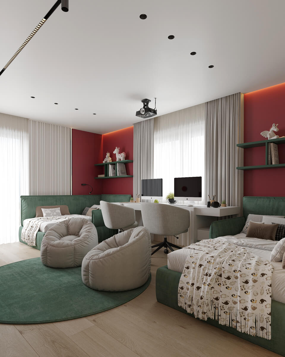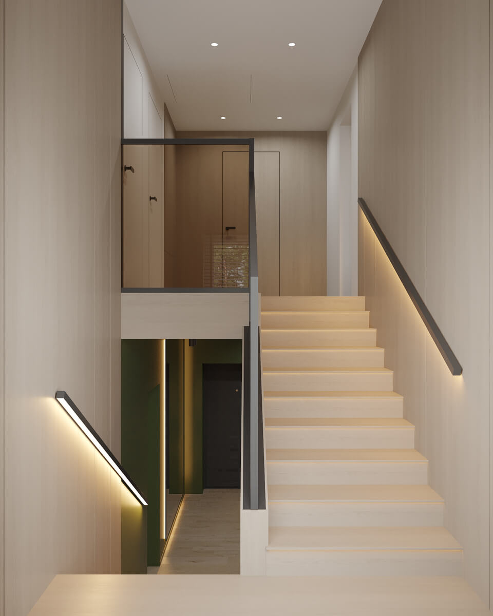 Результат: гармонійне поєднання геометричних форм та ліній створили чудову повітряну естетику. Основною палітрою кольорів цього інтерʼєру є класичне поєднання чорного і білого. Кольорові акценти – це яскраве та сміливе доповнення до монохромної палітри. Освітлення – ключовий момент в нашому дизайні. Магнітна трекова система дозволяє налаштовувати світло так, як вам потрібно. А точкові світильники додають інтриги і створюють гру світла та тіні. В будинку передбачені три дитячі кімнати, кожна з яких цікава та унікальна. У вітальні привертають увагу нестандартної форми світильники над столом у зоні їдальні, як окремий витвір мистецтва. Легким сіро-бежевим кольором виділена зона сходової з неймовірно красивими підсвітками, що одразу привертають увагу. Виділена окрема гардеробна кімната для зручності зберігання та розміщення одягу, адже сімʼя досить велика!
