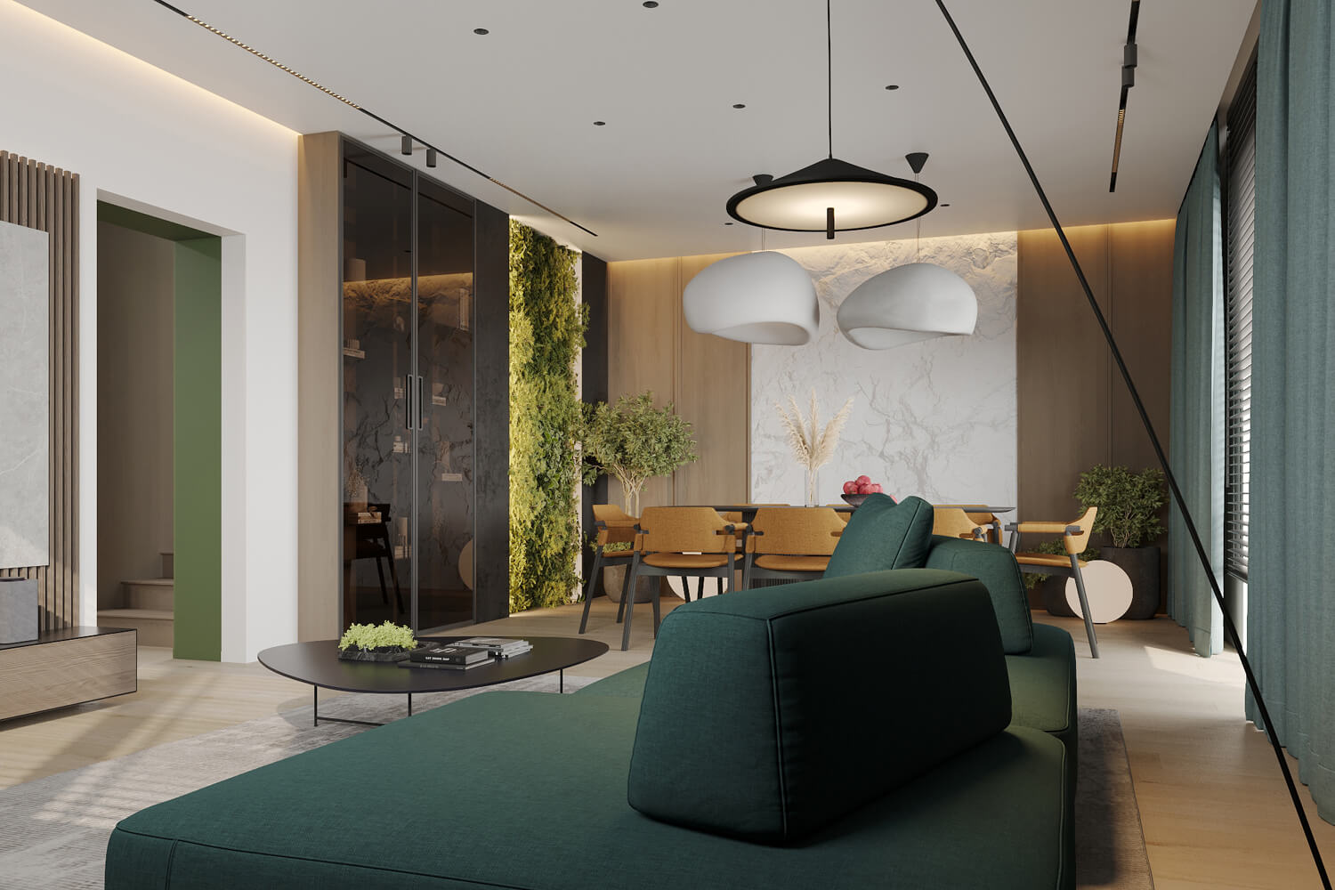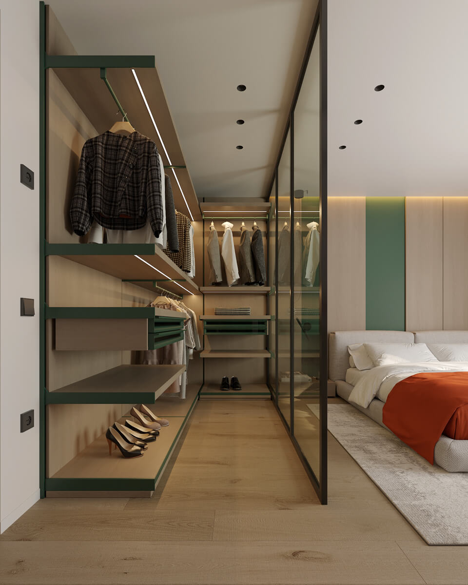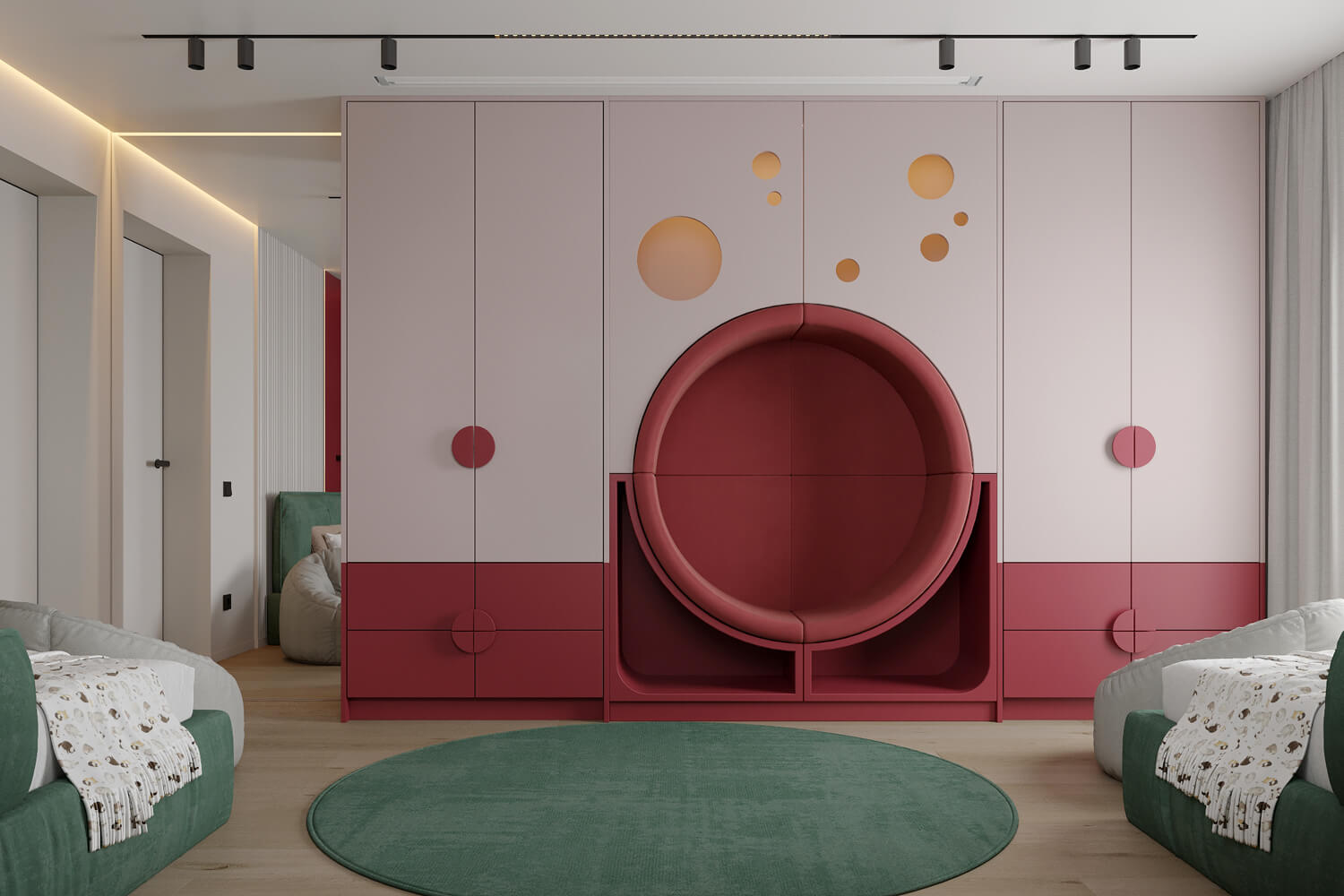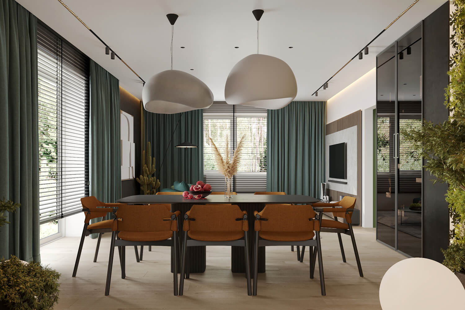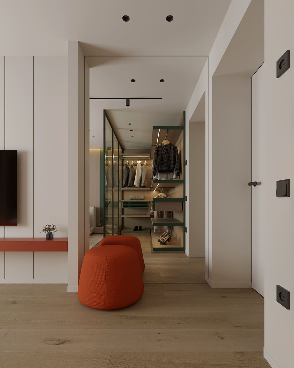 Результат: гармонійне поєднання геометричних форм та ліній створили чудову повітряну естетику. Основною палітрою кольорів цього інтерʼєру є класичне поєднання чорного і білого. Кольорові акценти – це яскраве та сміливе доповнення до монохромної палітри. Освітлення – ключовий момент в нашому дизайні. Магнітна трекова система дозволяє налаштовувати світло так, як вам потрібно. А точкові світильники додають інтриги і створюють гру світла та тіні. В будинку передбачені три дитячі кімнати, кожна з яких цікава та унікальна. У вітальні привертають увагу нестандартної форми світильники над столом у зоні їдальні, як окремий витвір мистецтва. Легким сіро-бежевим кольором виділена зона сходової з неймовірно красивими підсвітками, що одразу привертають увагу. Виділена окрема гардеробна кімната для зручності зберігання та розміщення одягу, адже сімʼя досить велика!