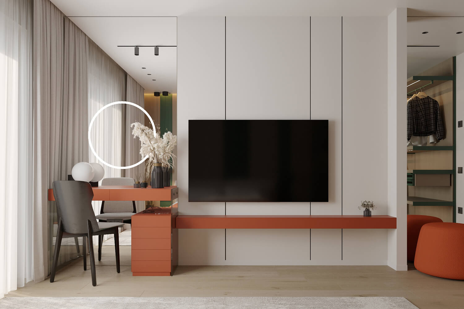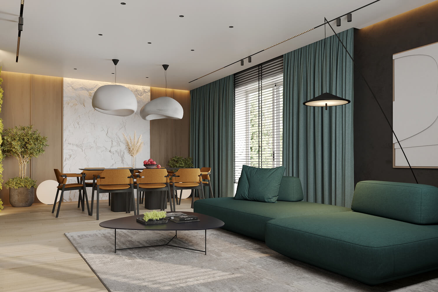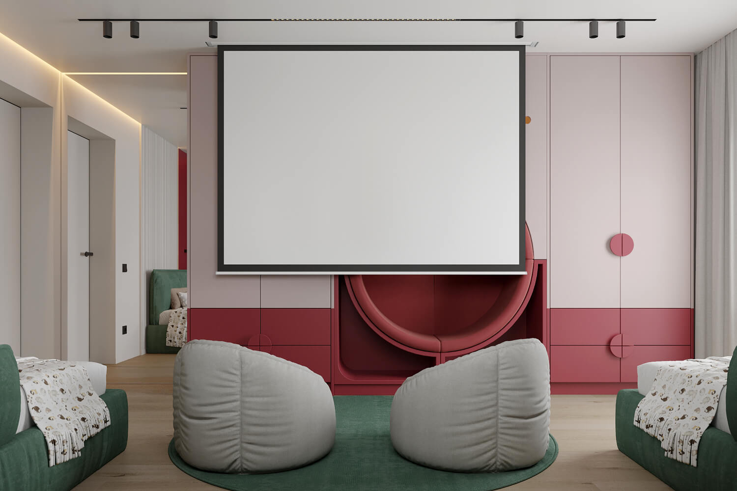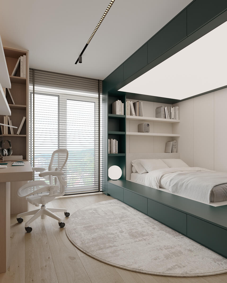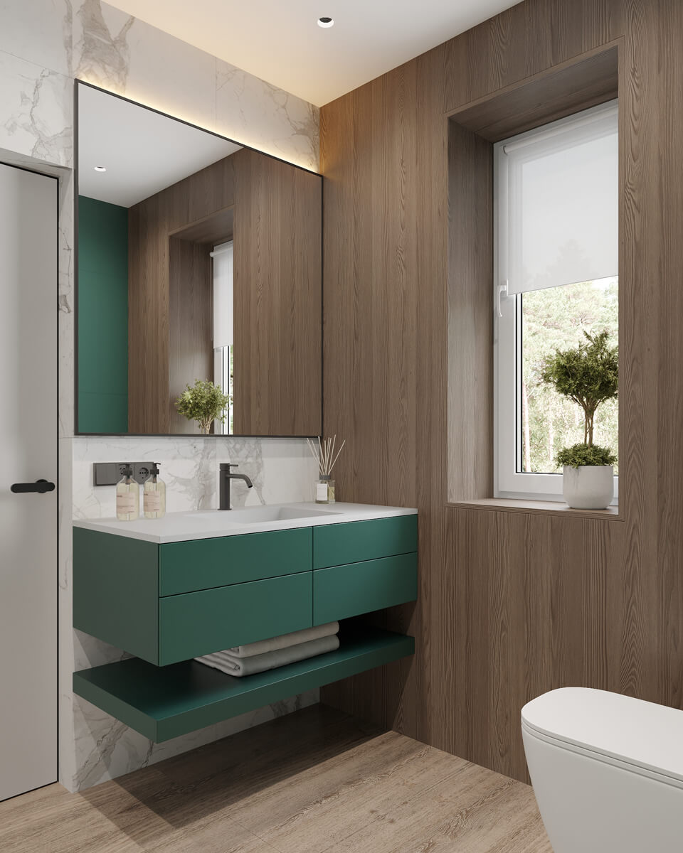Результат: гармонійне поєднання геометричних форм та ліній створили чудову повітряну естетику. Основною палітрою кольорів цього інтерʼєру є класичне поєднання чорного і білого. Кольорові акценти – це яскраве та сміливе доповнення до монохромної палітри. Освітлення – ключовий момент в нашому дизайні. Магнітна трекова система дозволяє налаштовувати світло так, як вам потрібно. А точкові світильники додають інтриги і створюють гру світла та тіні. В будинку передбачені три дитячі кімнати, кожна з яких цікава та унікальна. У вітальні привертають увагу нестандартної форми світильники над столом у зоні їдальні, як окремий витвір мистецтва. Легким сіро-бежевим кольором виділена зона сходової з неймовірно красивими підсвітками, що одразу привертають увагу. Виділена окрема гардеробна кімната для зручності зберігання та розміщення одягу, адже сімʼя досить велика!