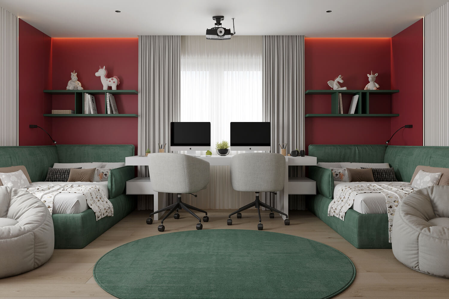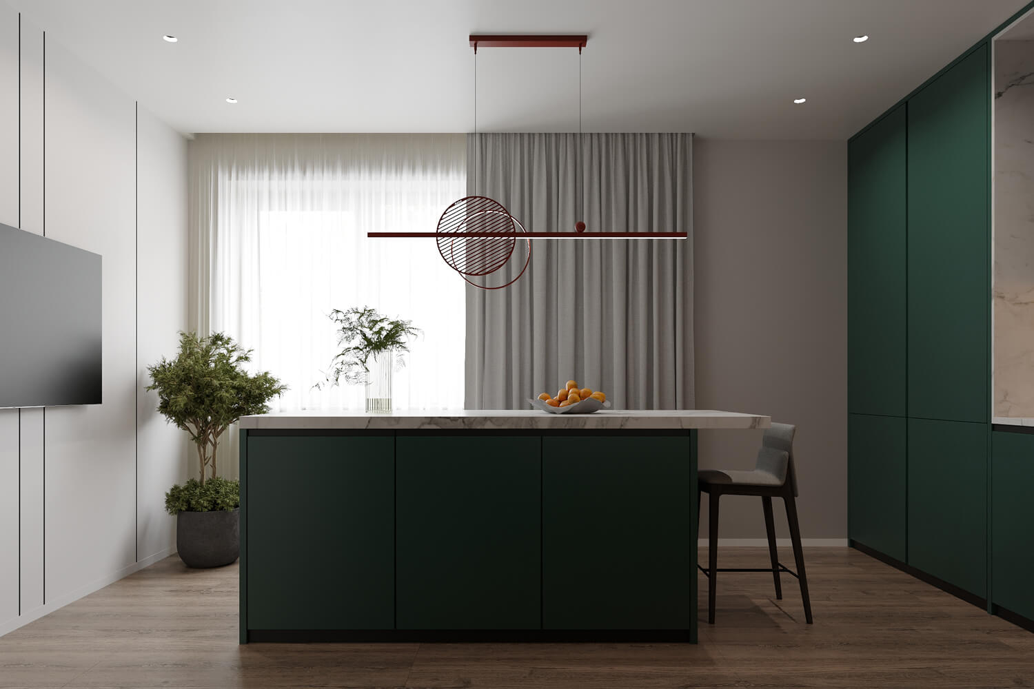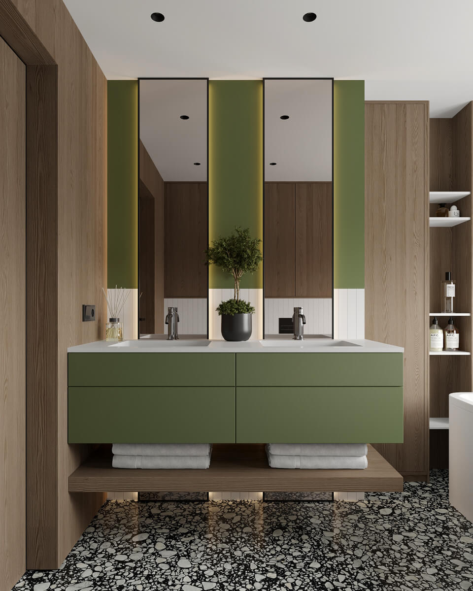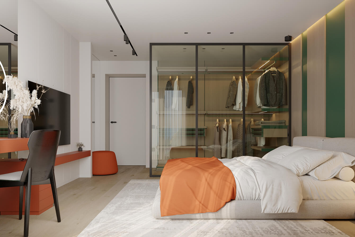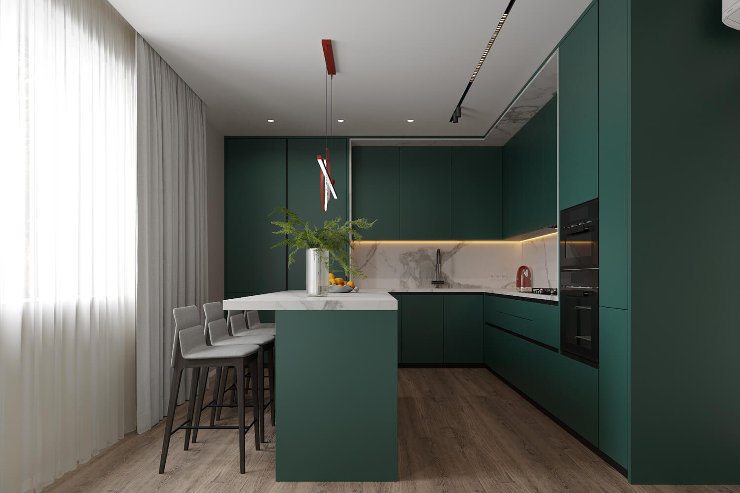 Результат: гармонійне поєднання геометричних форм та ліній створили чудову повітряну естетику. Основною палітрою кольорів цього інтерʼєру є класичне поєднання чорного і білого. Кольорові акценти – це яскраве та сміливе доповнення до монохромної палітри. Освітлення – ключовий момент в нашому дизайні. Магнітна трекова система дозволяє налаштовувати світло так, як вам потрібно. А точкові світильники додають інтриги і створюють гру світла та тіні. В будинку передбачені три дитячі кімнати, кожна з яких цікава та унікальна. У вітальні привертають увагу нестандартної форми світильники над столом у зоні їдальні, як окремий витвір мистецтва. Легким сіро-бежевим кольором виділена зона сходової з неймовірно красивими підсвітками, що одразу привертають увагу. Виділена окрема гардеробна кімната для зручності зберігання та розміщення одягу, адже сімʼя досить велика!