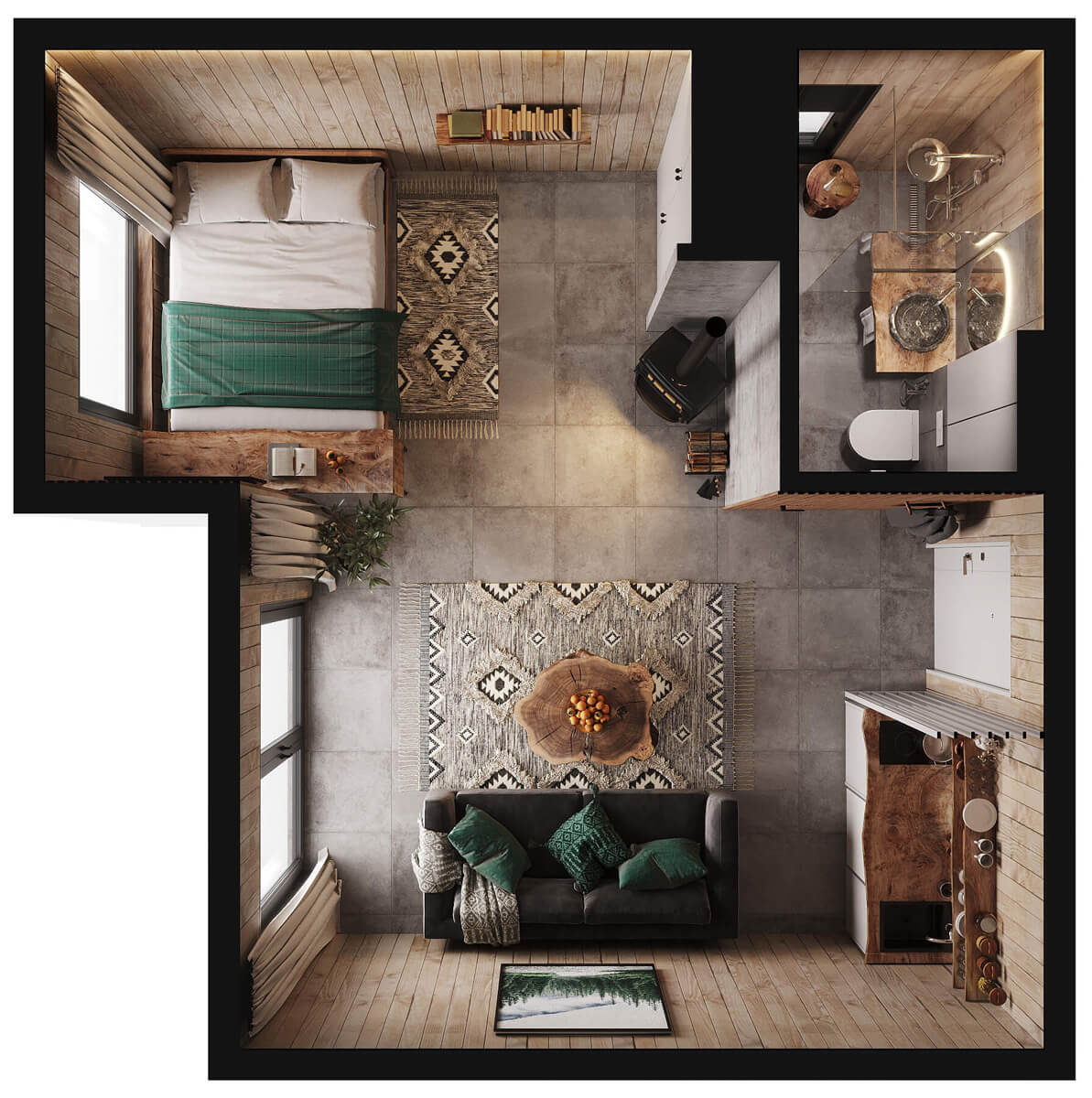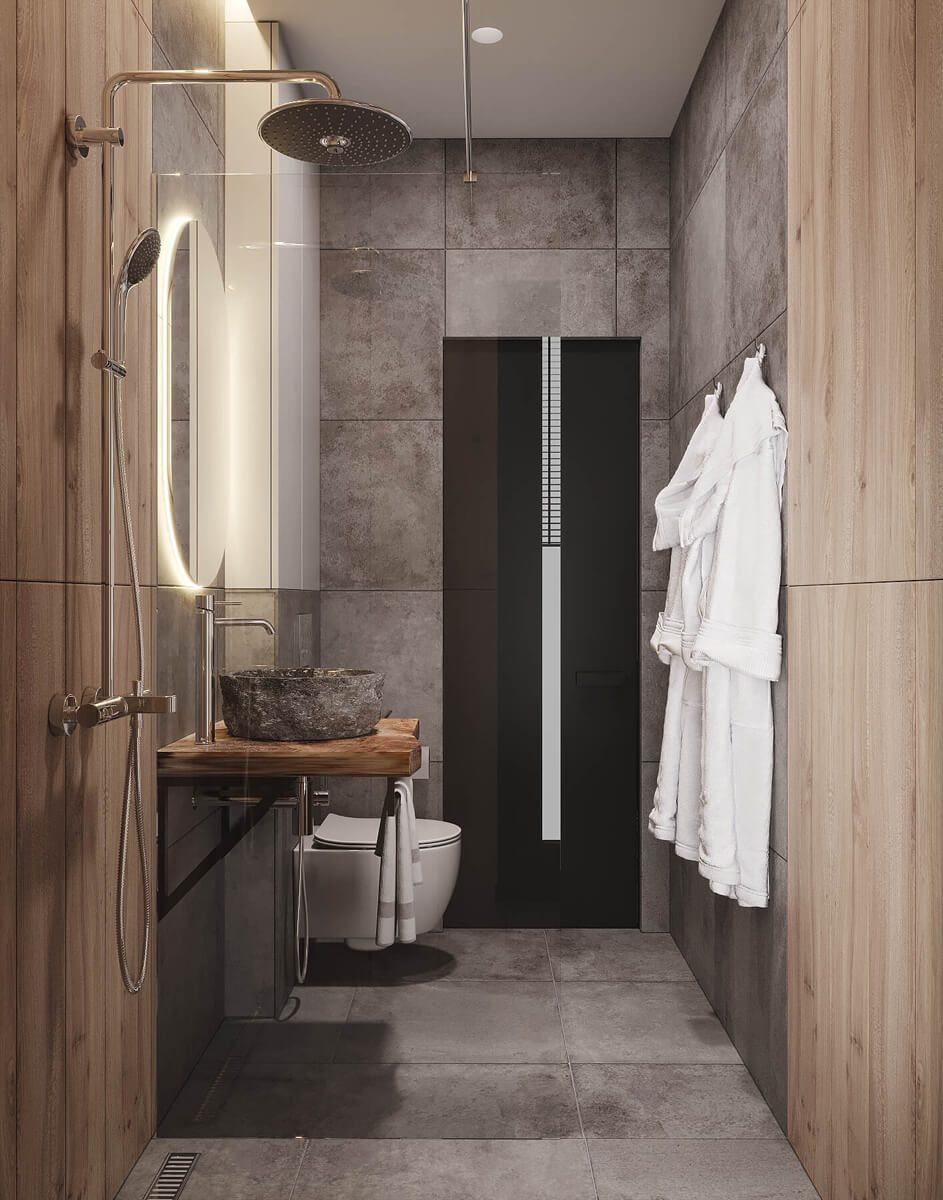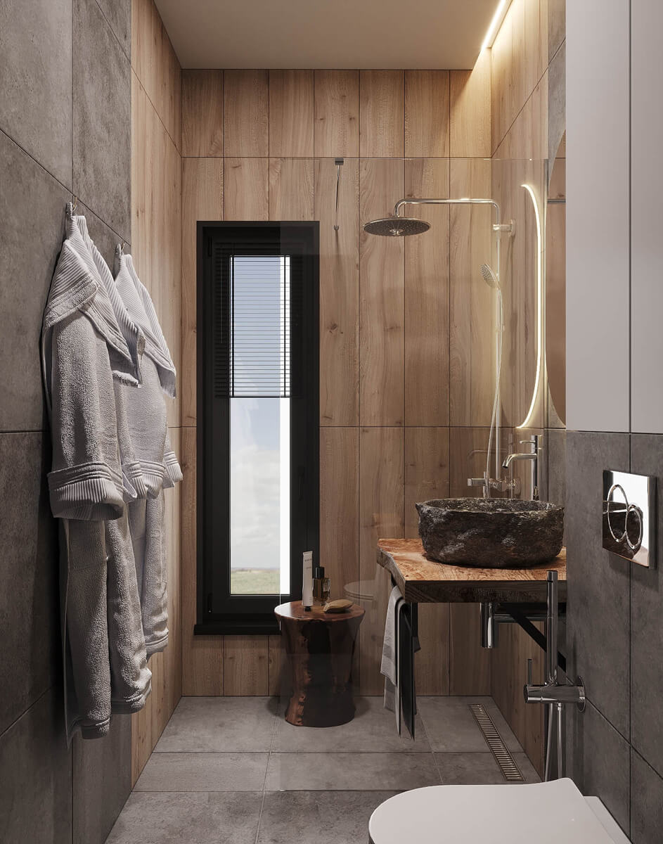 We used all the natural elements – tree countertops with a natural edge, a washbasin in a stone bathroom, and Ukrainian carpets that were used for color.