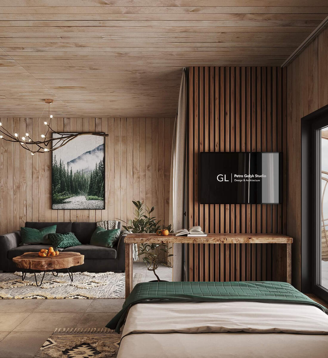 There are also interesting combinations of wood, stone with emerald color in pillows, and painting.