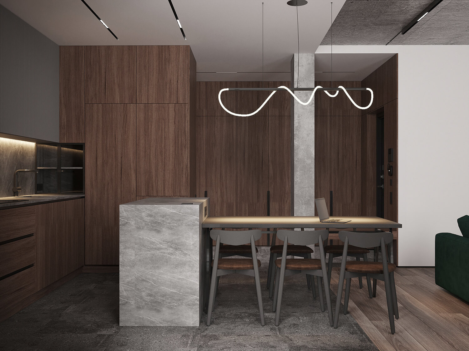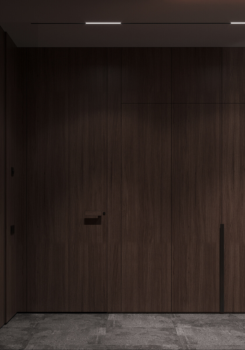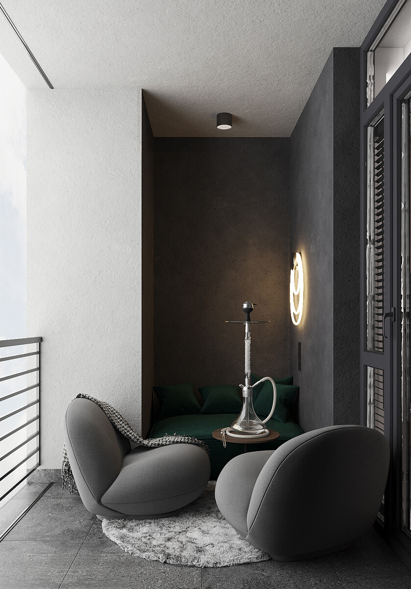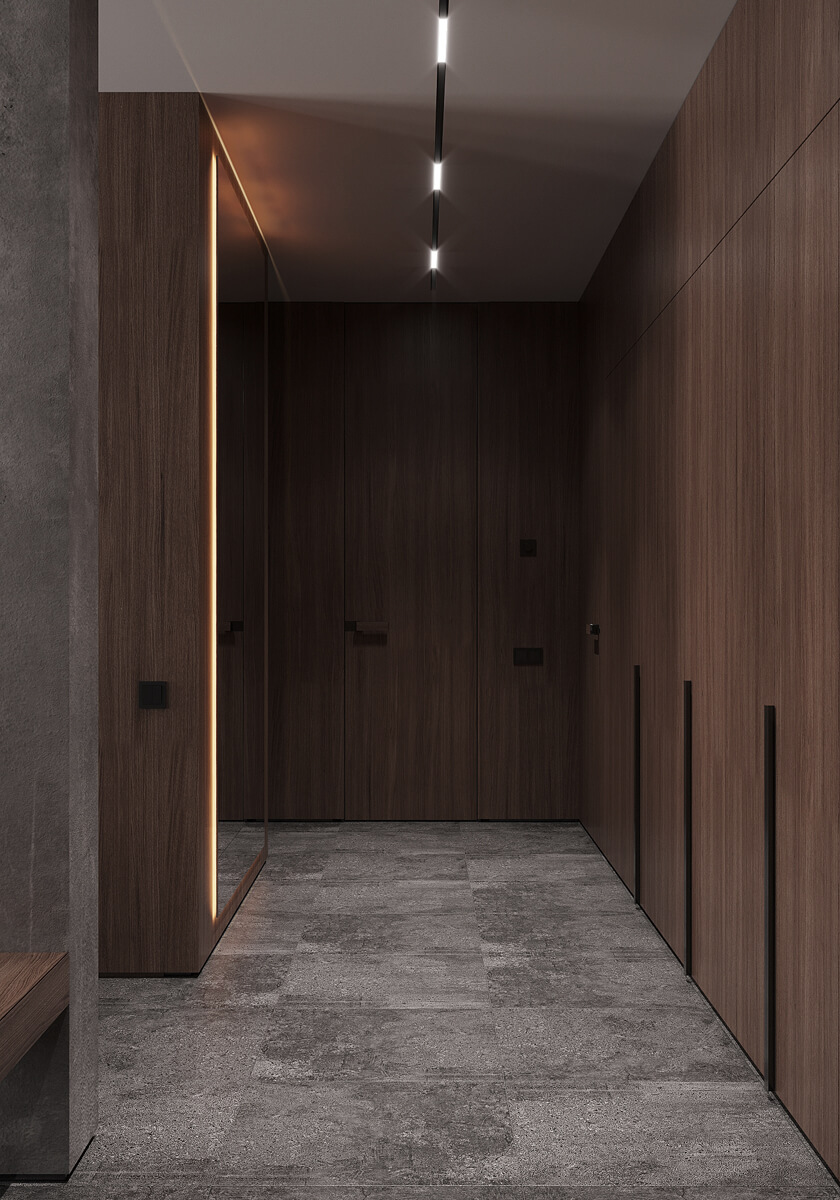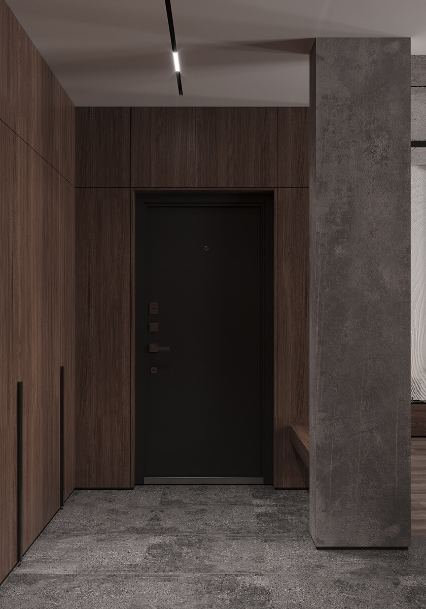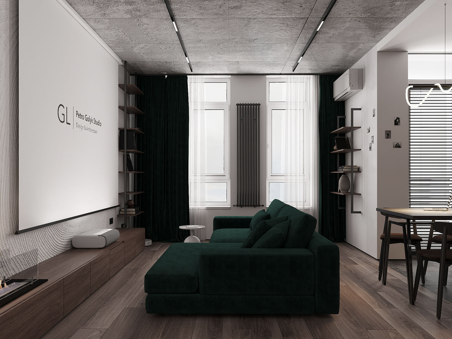 Даний проєкт виконаний в сучасному стилі з поєднанням лофту в таких деталях, як існуюча частина стелі. Щодо кольорової гами, то тут переважають нейтральні та приглушенні відтінки: сірий, білий, чорний та коричневий. Але додали яскравий акцент смарагдового кольору. Ми залишили відкриту чисту стелю з бетонних плит, що оформили накладними треками. Вона підкреслює сильний характер лофту в інтер’єрі!