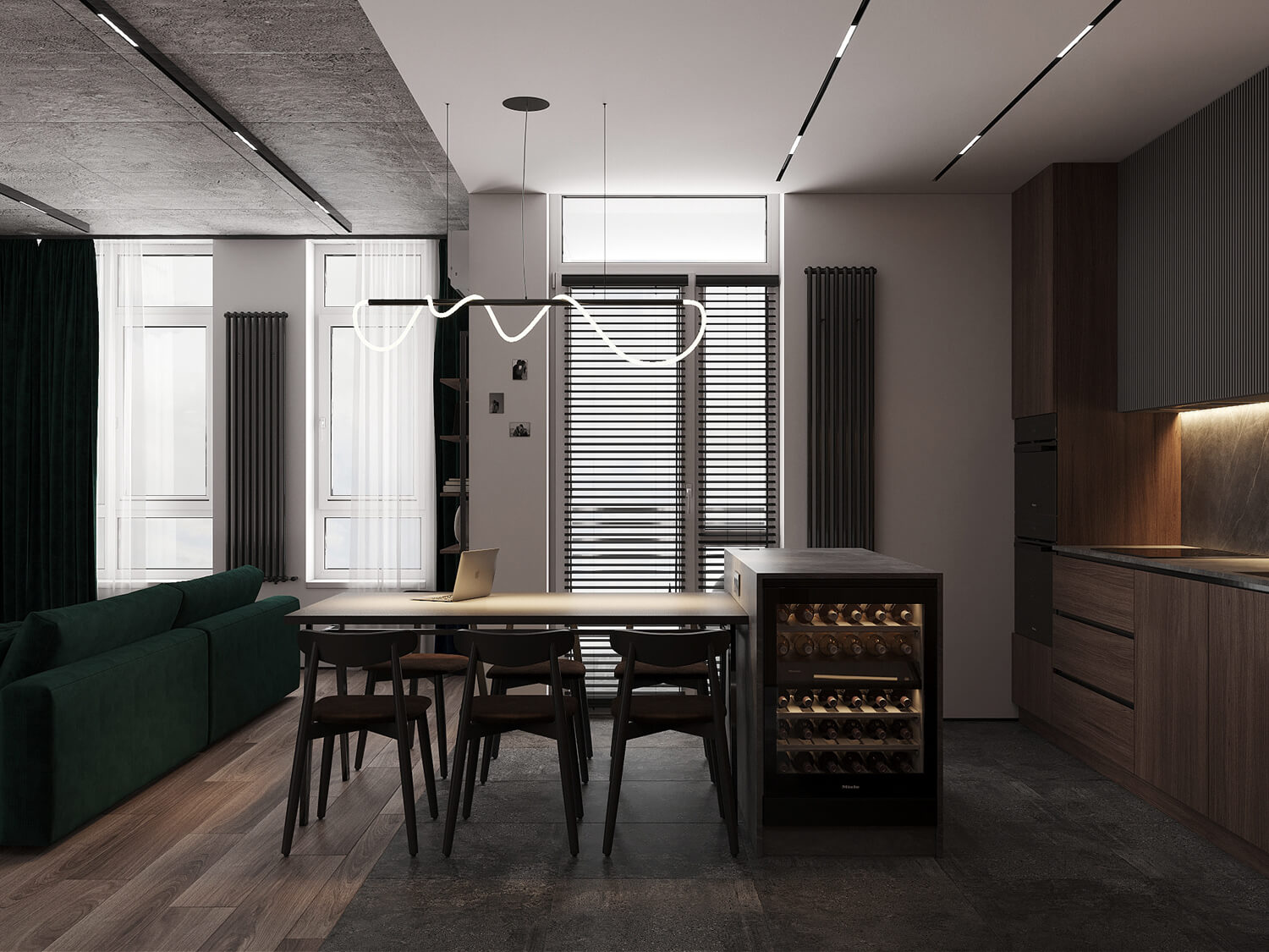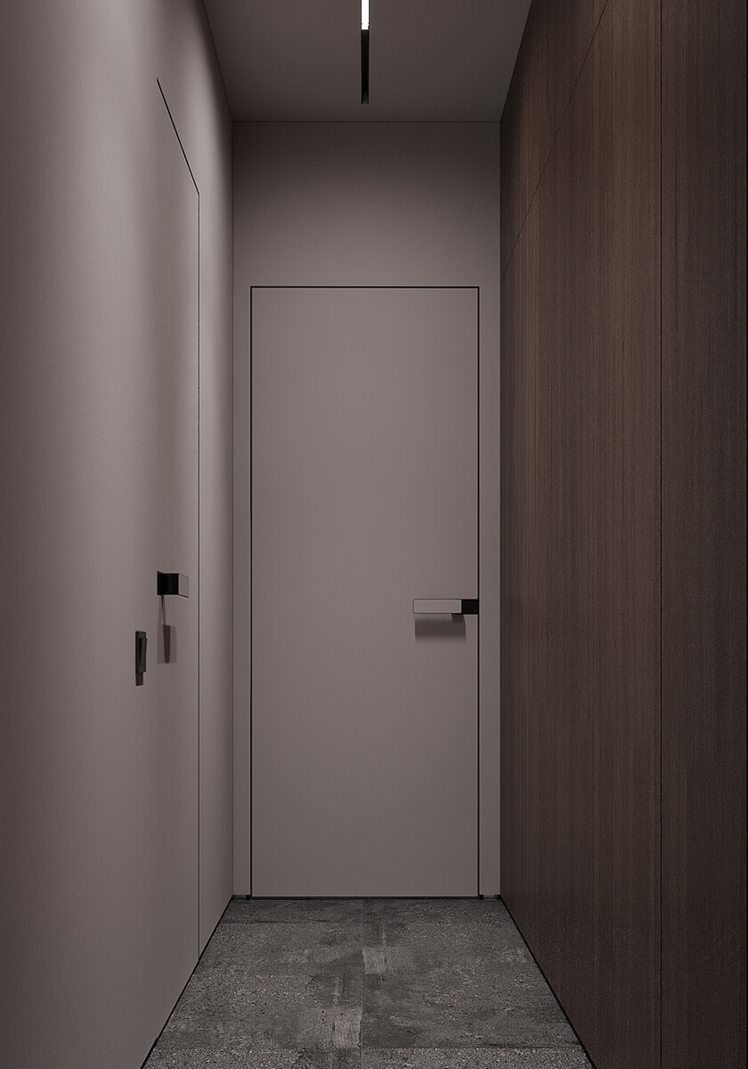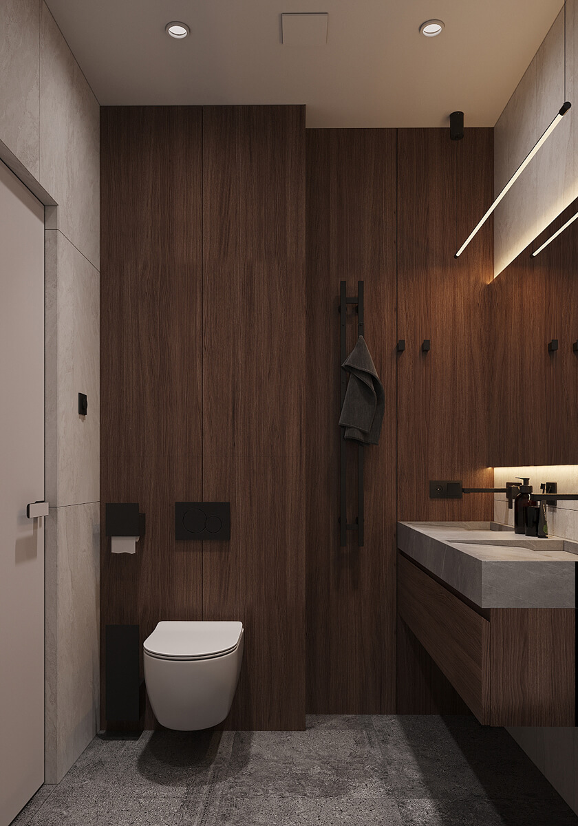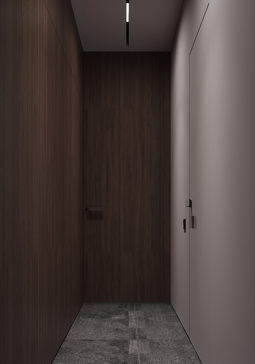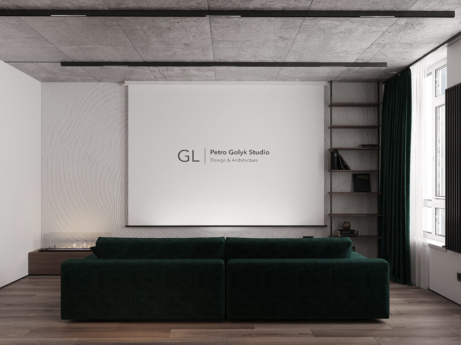 Даний проєкт виконаний в сучасному стилі з поєднанням лофту в таких деталях, як існуюча частина стелі. Щодо кольорової гами, то тут переважають нейтральні та приглушенні відтінки: сірий, білий, чорний та коричневий. Але додали яскравий акцент смарагдового кольору. Ми залишили відкриту чисту стелю з бетонних плит, що оформили накладними треками. Вона підкреслює сильний характер лофту в інтер’єрі!
