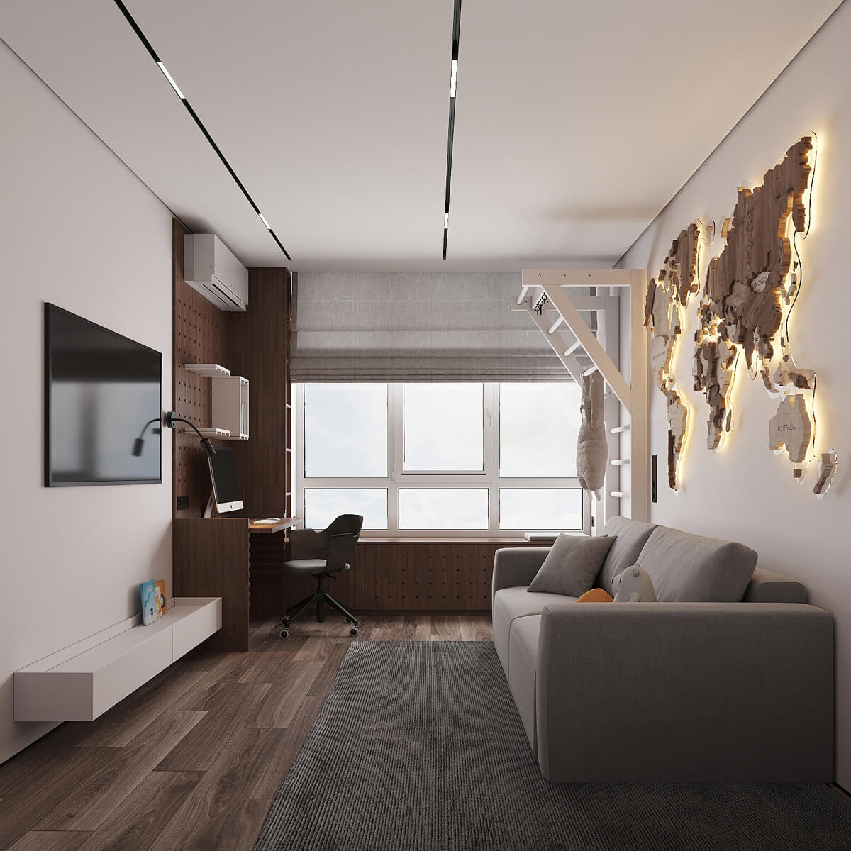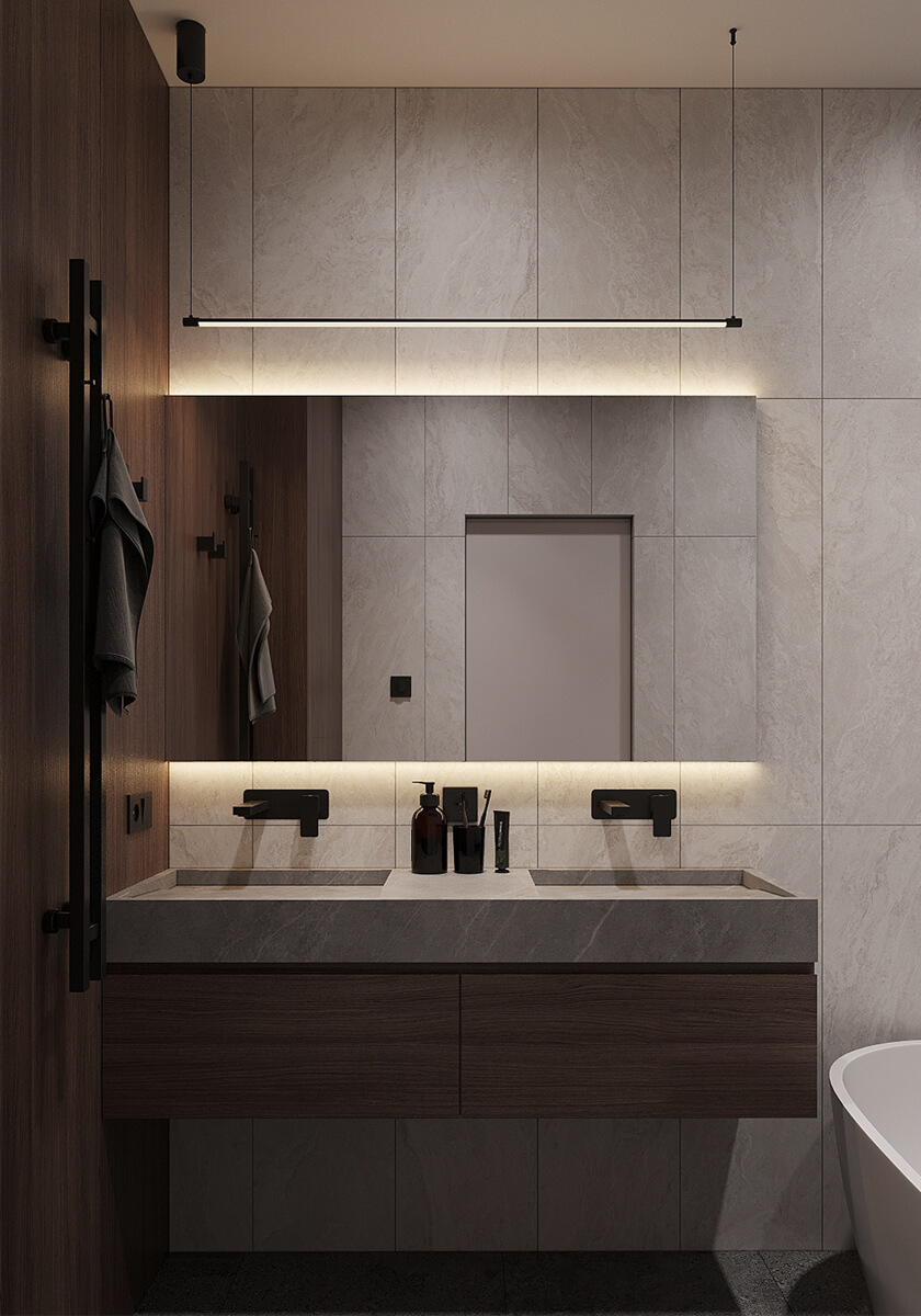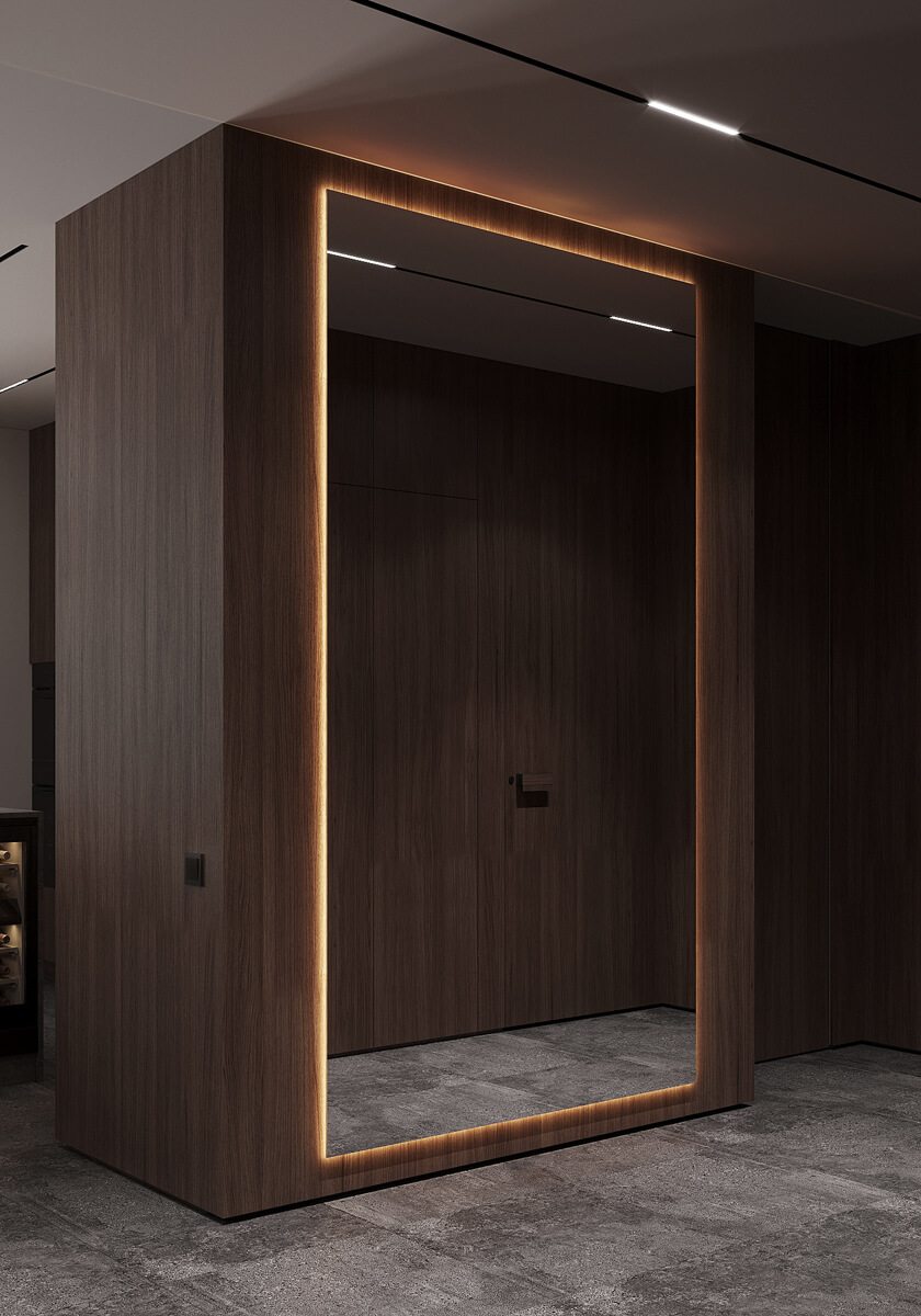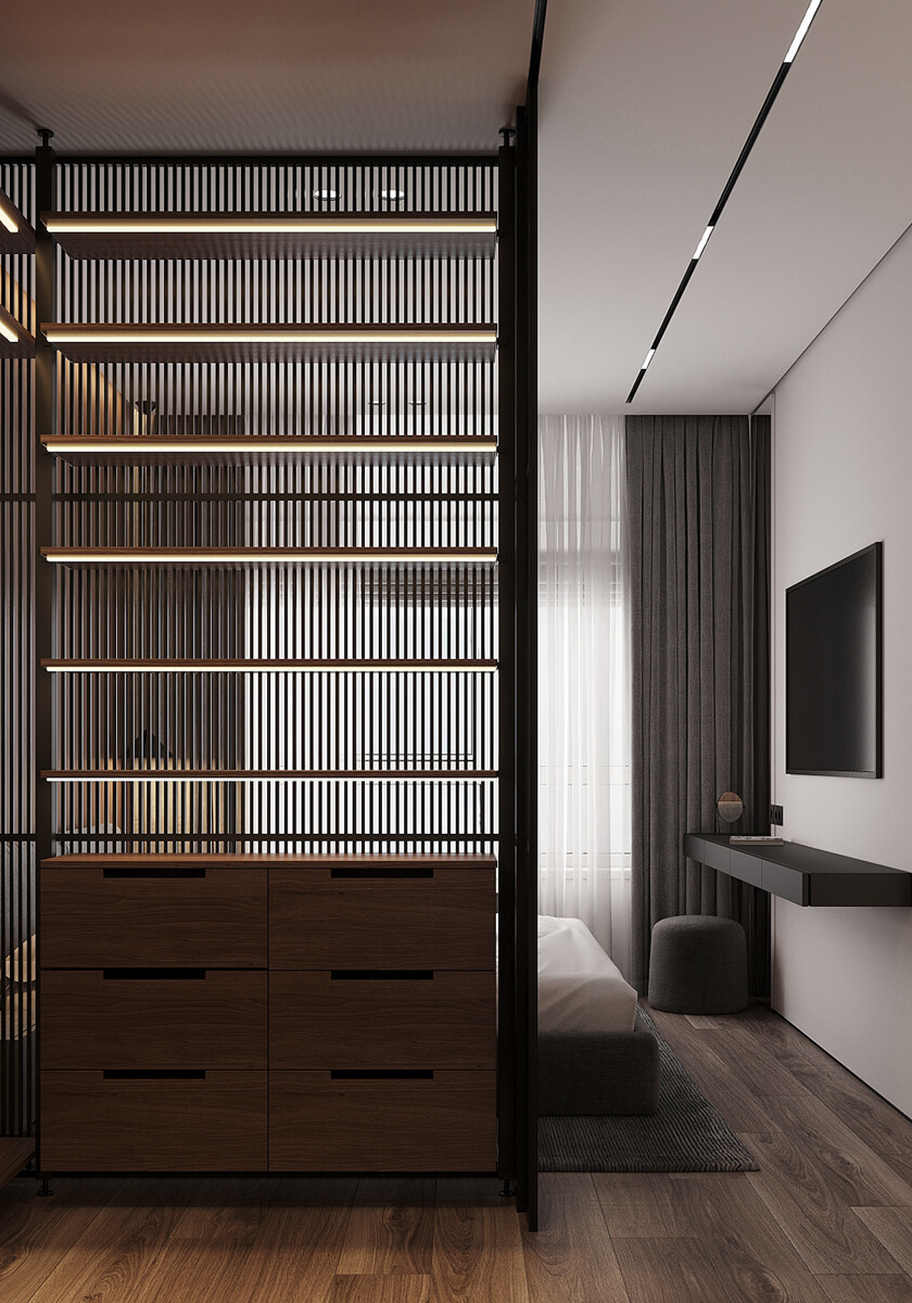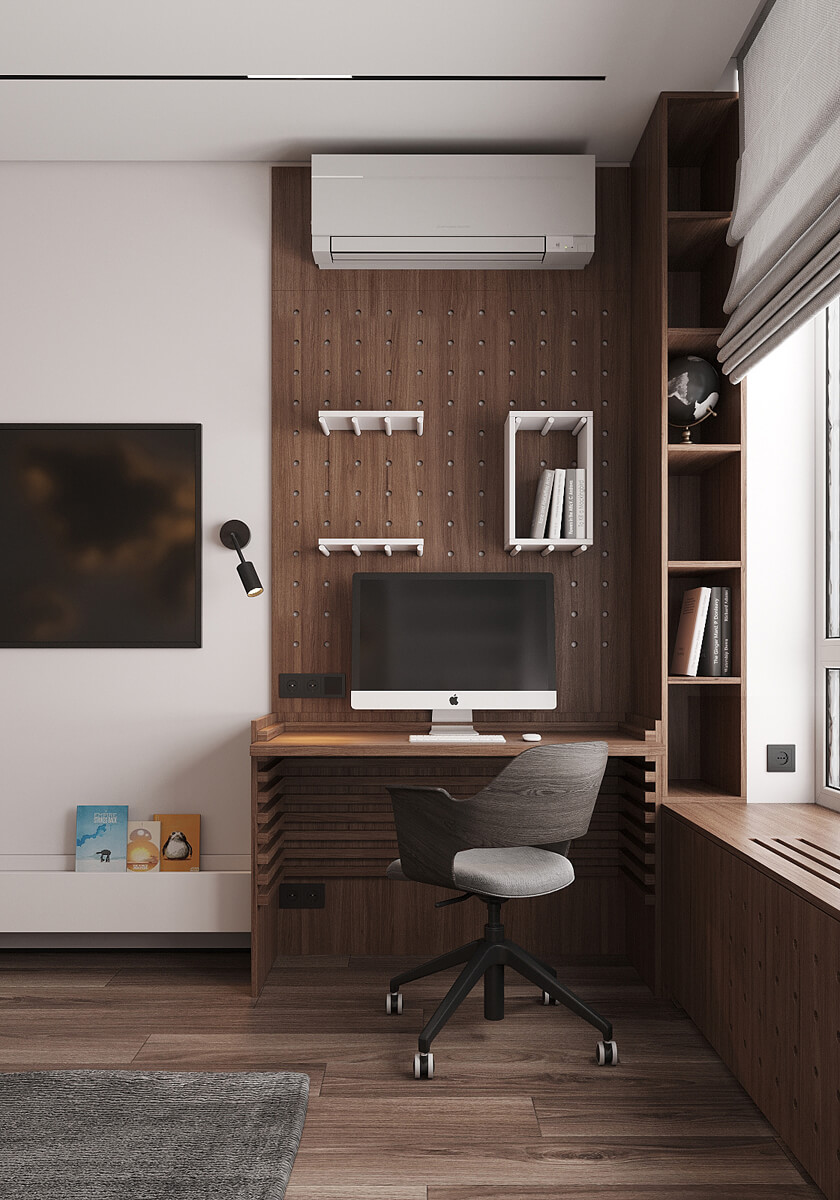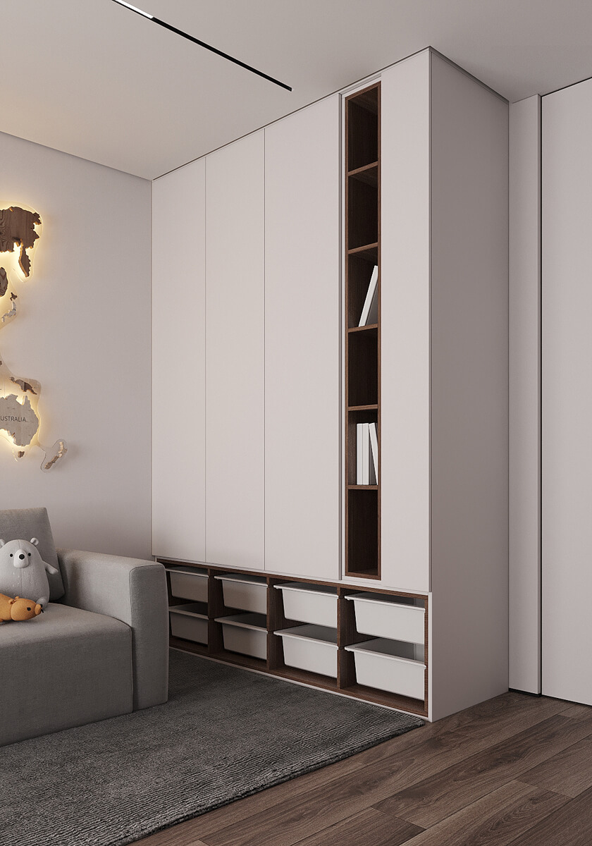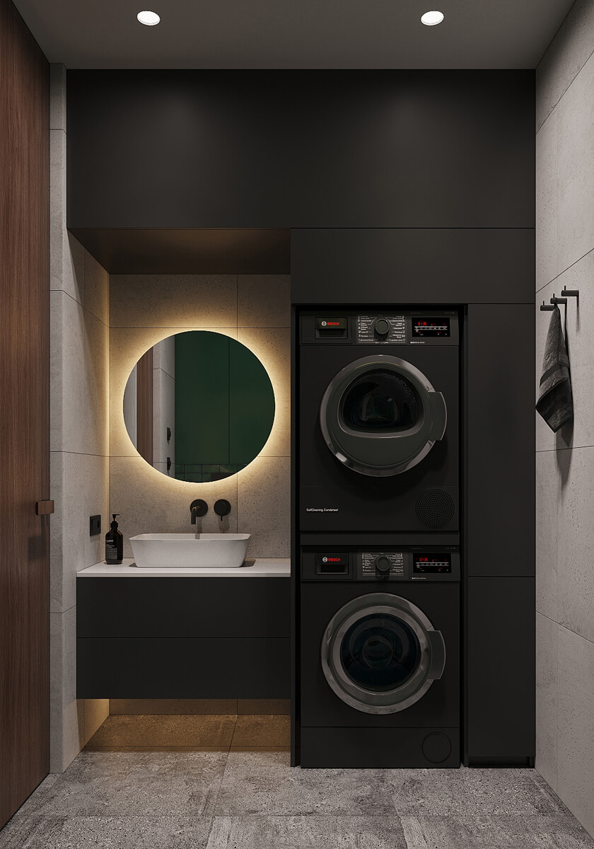 Даний проєкт виконаний в сучасному стилі з поєднанням лофту в таких деталях, як існуюча частина стелі. Щодо кольорової гами, то тут переважають нейтральні та приглушенні відтінки: сірий, білий, чорний та коричневий. Але додали яскравий акцент смарагдового кольору. Ми залишили відкриту чисту стелю з бетонних плит, що оформили накладними треками. Вона підкреслює сильний характер лофту в інтер’єрі!