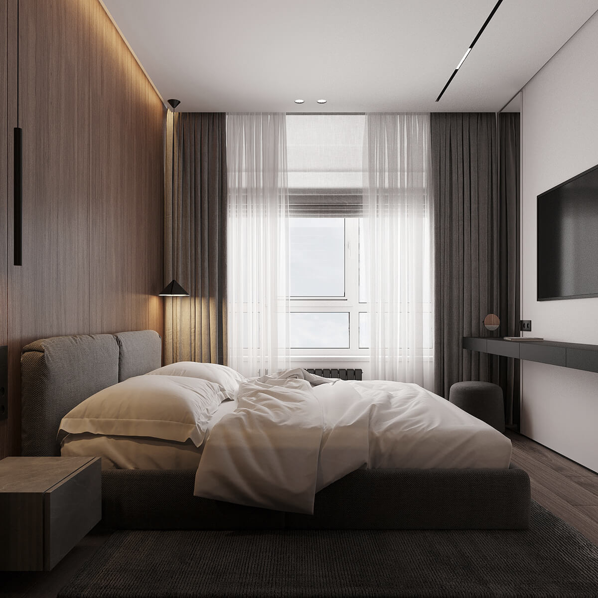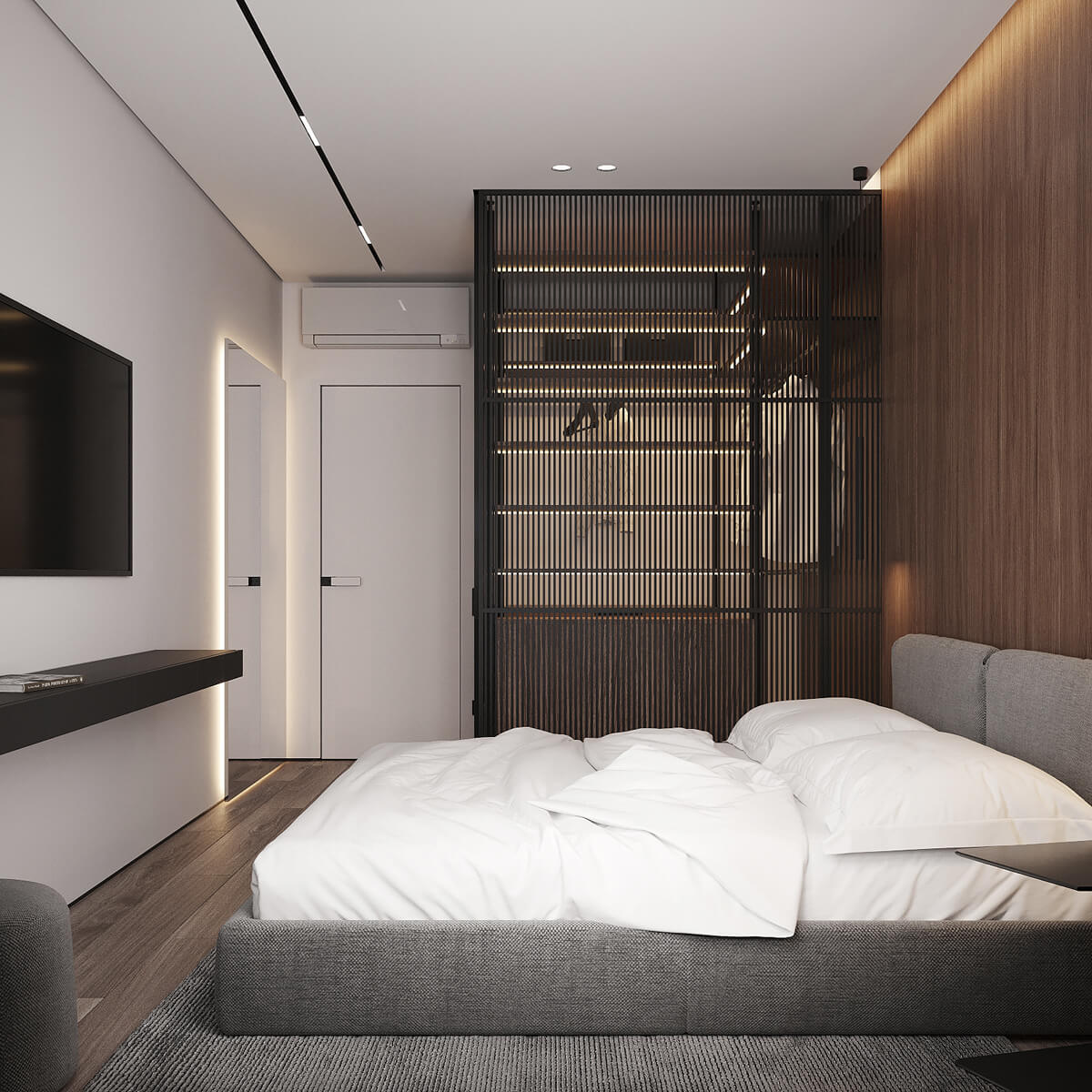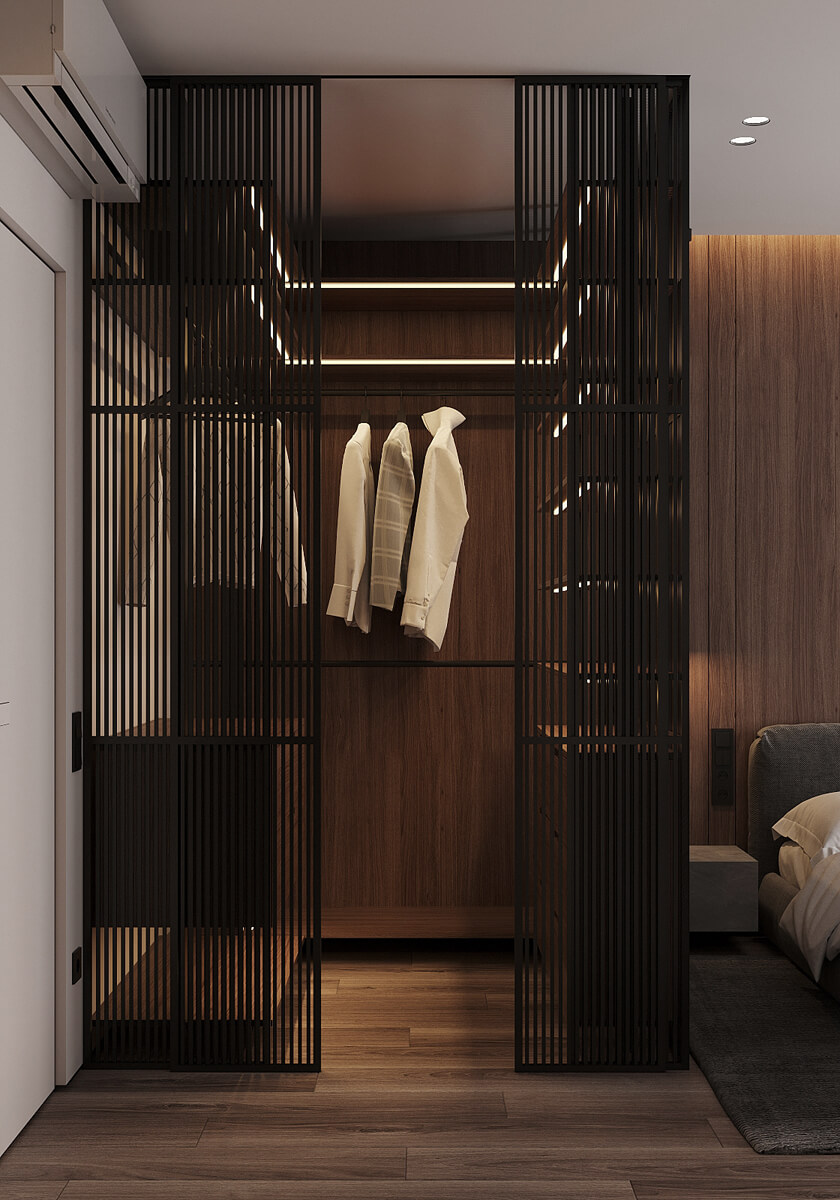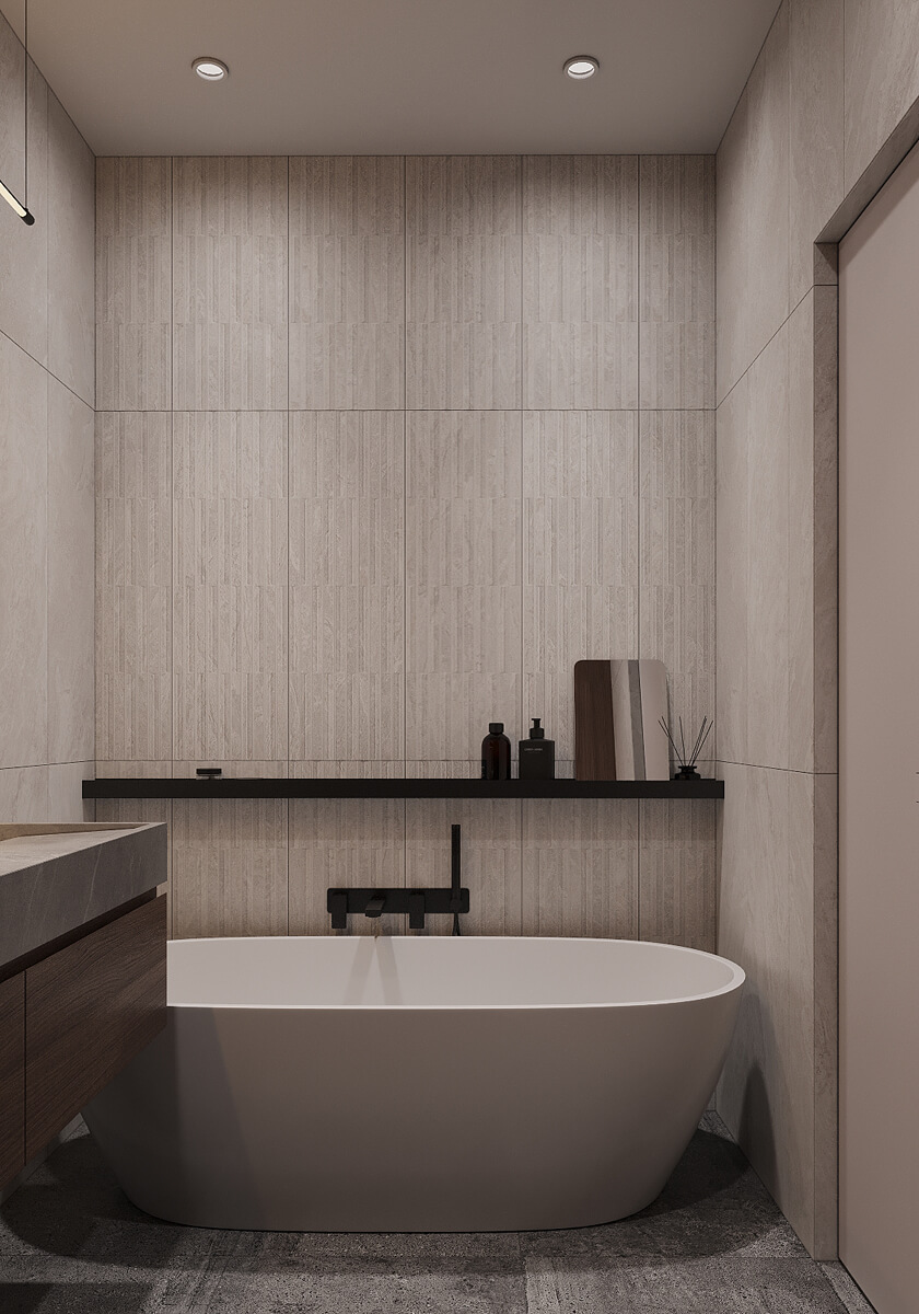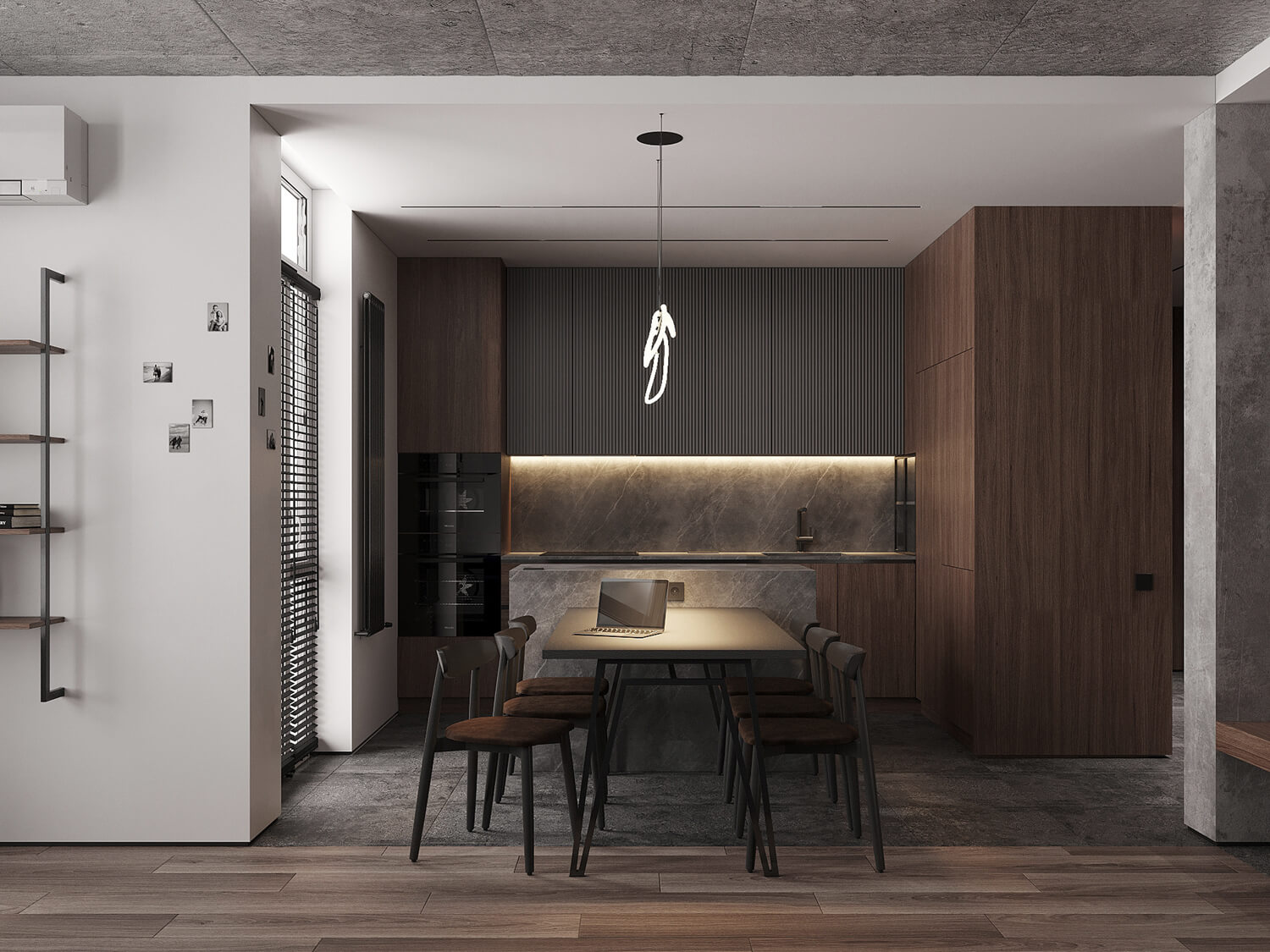 Даний проєкт виконаний в сучасному стилі з поєднанням лофту в таких деталях, як існуюча частина стелі. Щодо кольорової гами, то тут переважають нейтральні та приглушенні відтінки: сірий, білий, чорний та коричневий. Але додали яскравий акцент смарагдового кольору. Ми залишили відкриту чисту стелю з бетонних плит, що оформили накладними треками. Вона підкреслює сильний характер лофту в інтер’єрі!