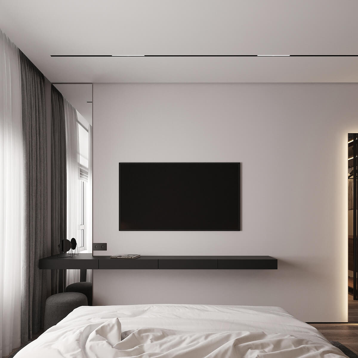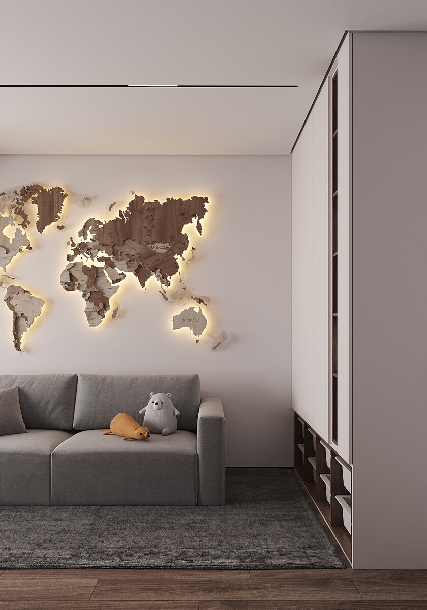 Родзинкою інтер’єру в зоні вітальні є стіна з проектором! Цікавою рисою проєкту є відкритий простір без стіни, що розрізняє класичні функціональні зони. Це створює відчуття простору та пропускає багато світла. Меблі в стилі мінімалізм з простими чіткими лініями.