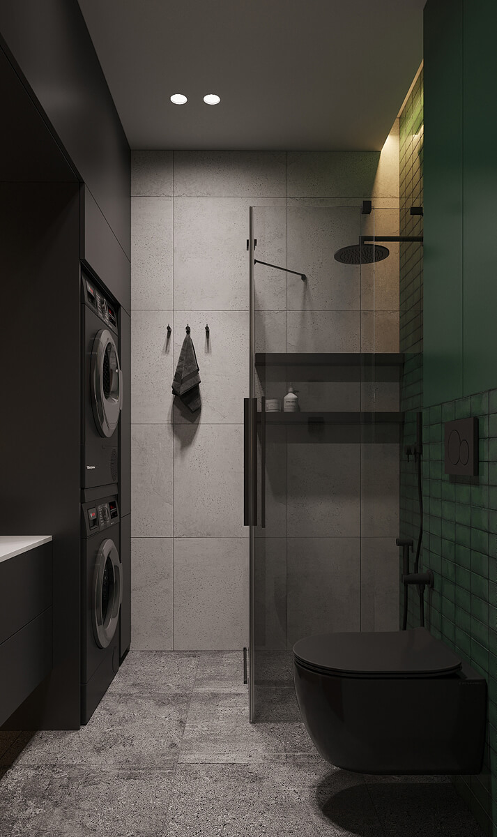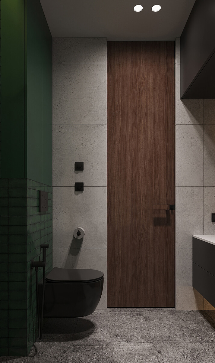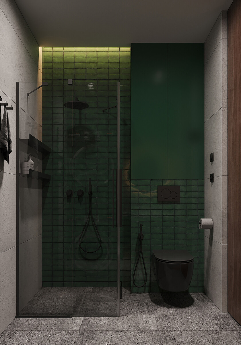 У санвузлі акцентна стіна виконана з дрібної темно-зеленої плитки, навіть шафа над унітазом пофарбована в цей же колір, щоб вся стіна здавалася цілісною. Це додає природного відтінку та свіжості простору!