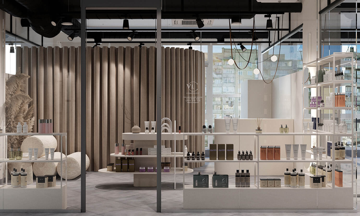 Магазин оформлений у світлій гамі з акцентом на мінімалізм: зручні стелажі, тестова зона, велике дзеркало для фото та комфортне місце очікування. Від кабінету його відділяє масивна бежева штора – водночас стильний акцент і елемент приватності.