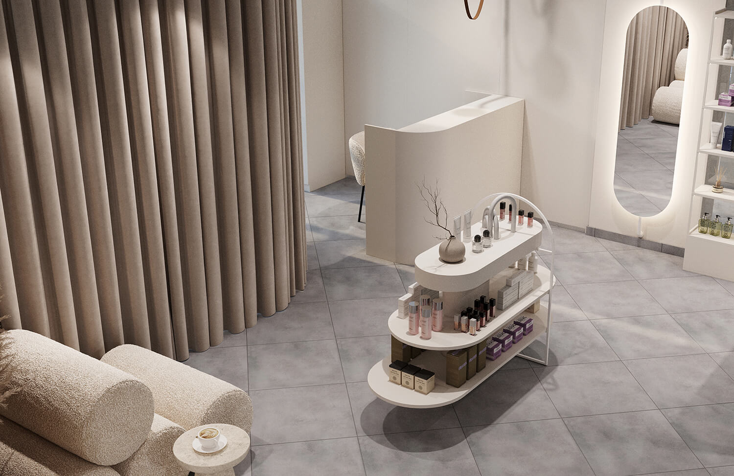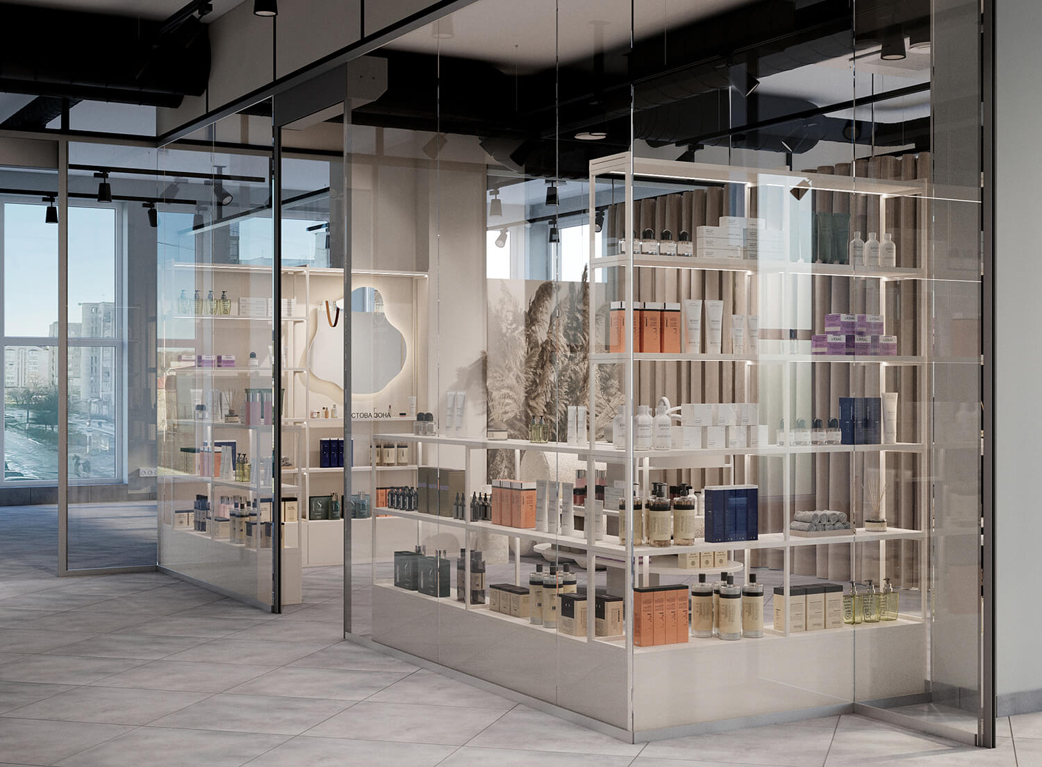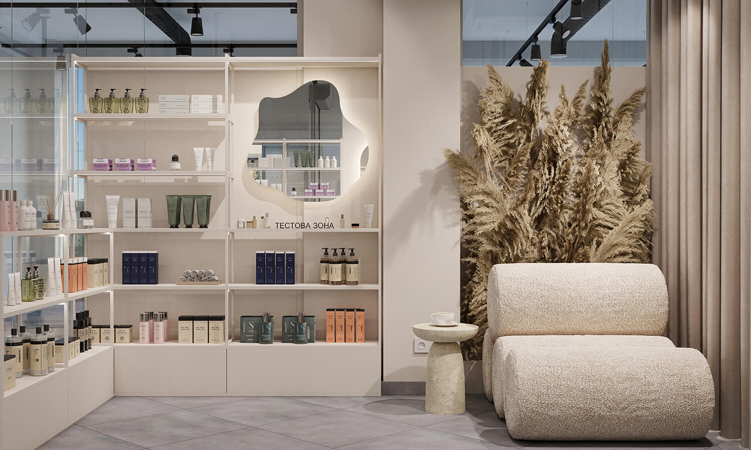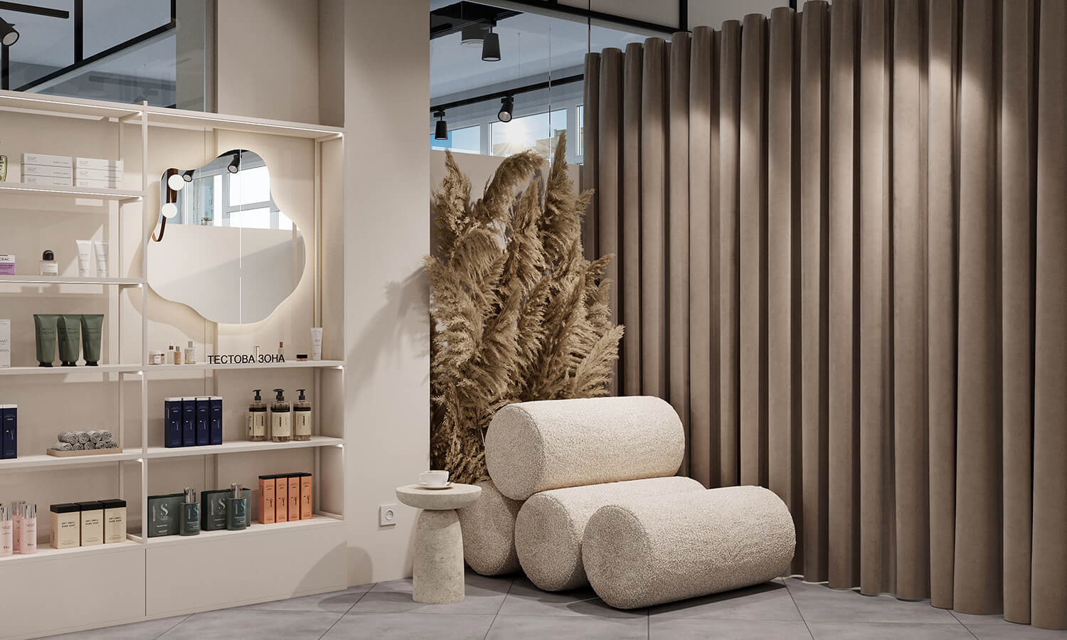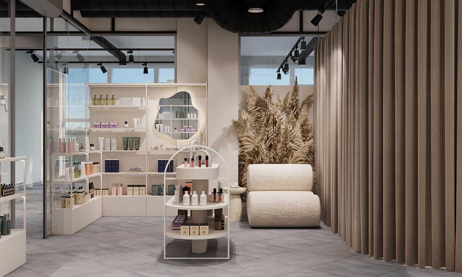 Магазин оформлений у світлій гамі з акцентом на мінімалізм: зручні стелажі, тестова зона, велике дзеркало для фото та комфортне місце очікування. Від кабінету його відділяє масивна бежева штора – водночас стильний акцент і елемент приватності.