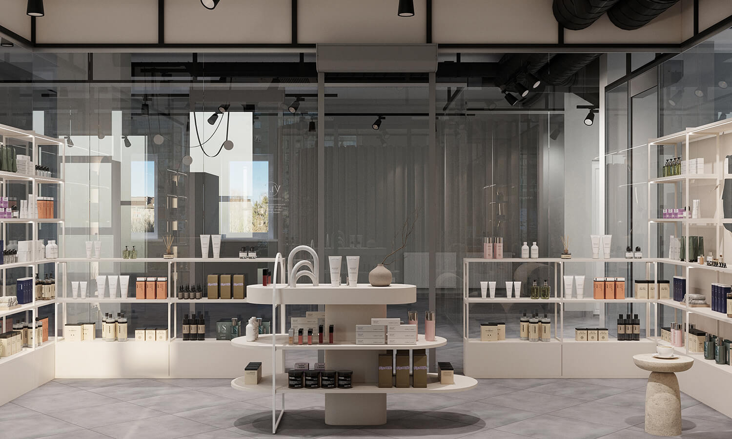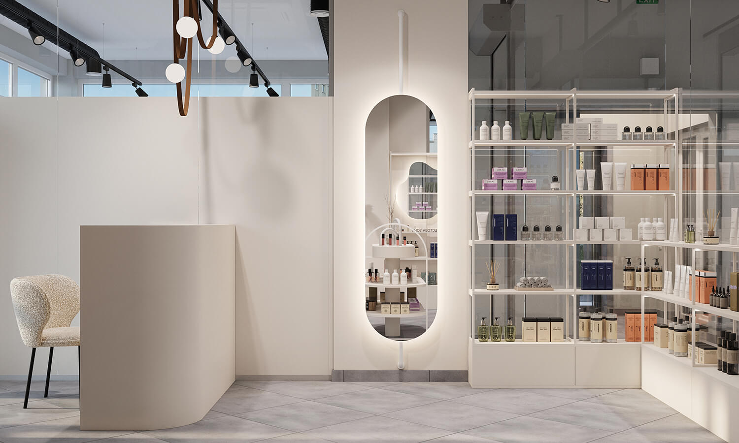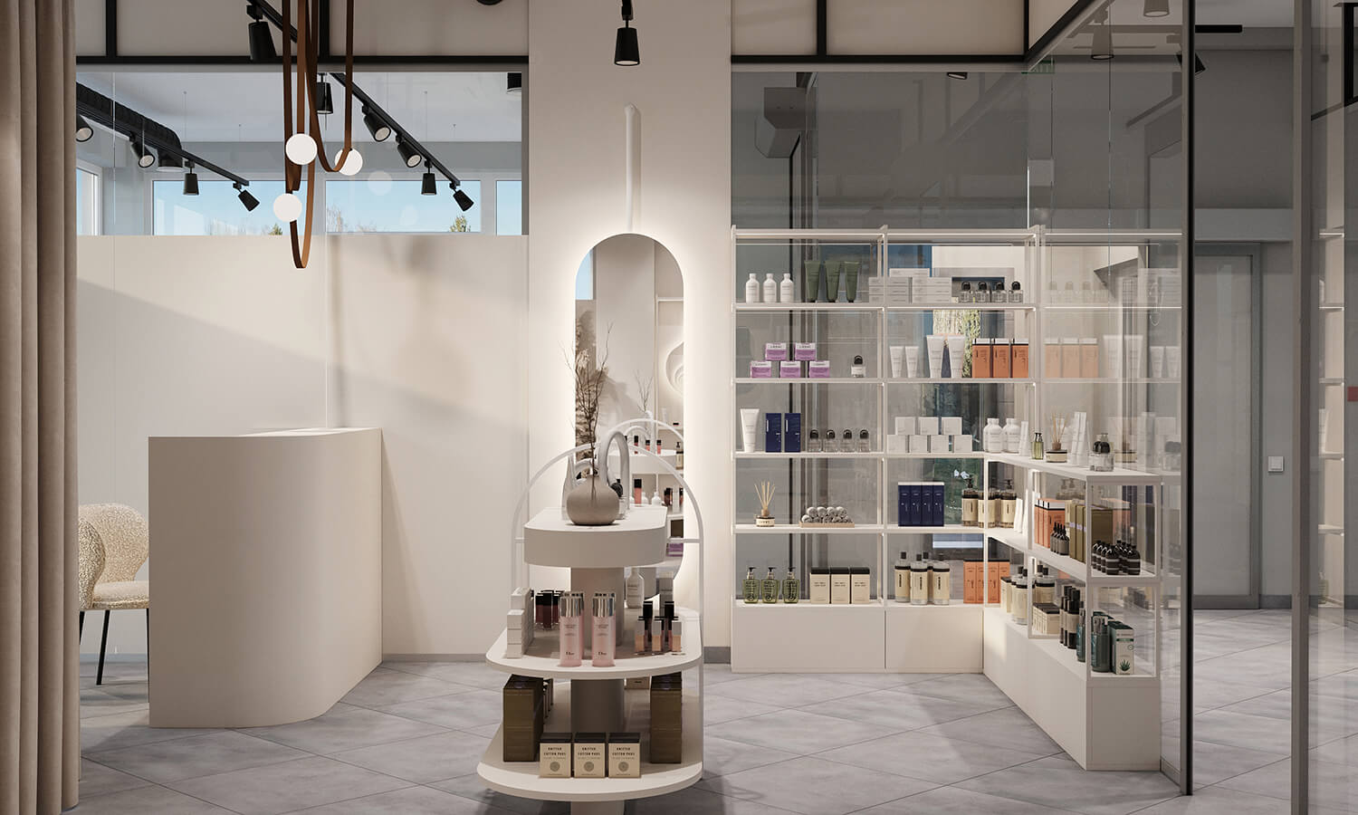 Завдання: створити гармонійний, функціональний простір, де косметологічний кабінет і магазин природно поєднуються, зберігаючи атмосферу легкості, затишку та естетики.