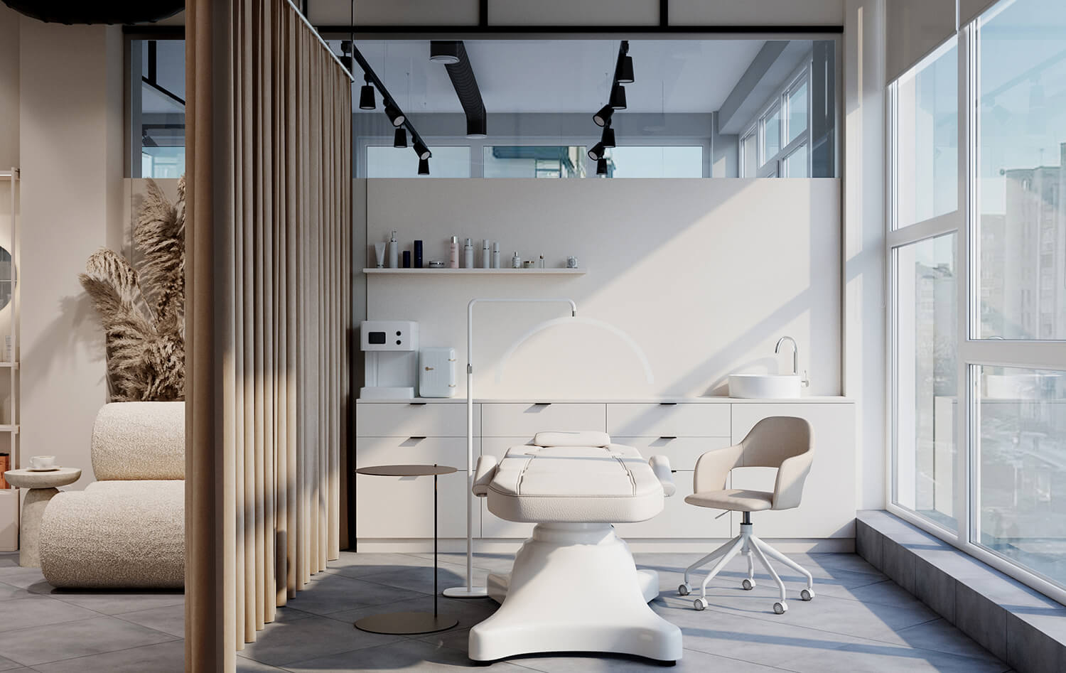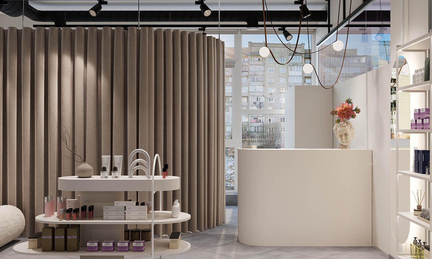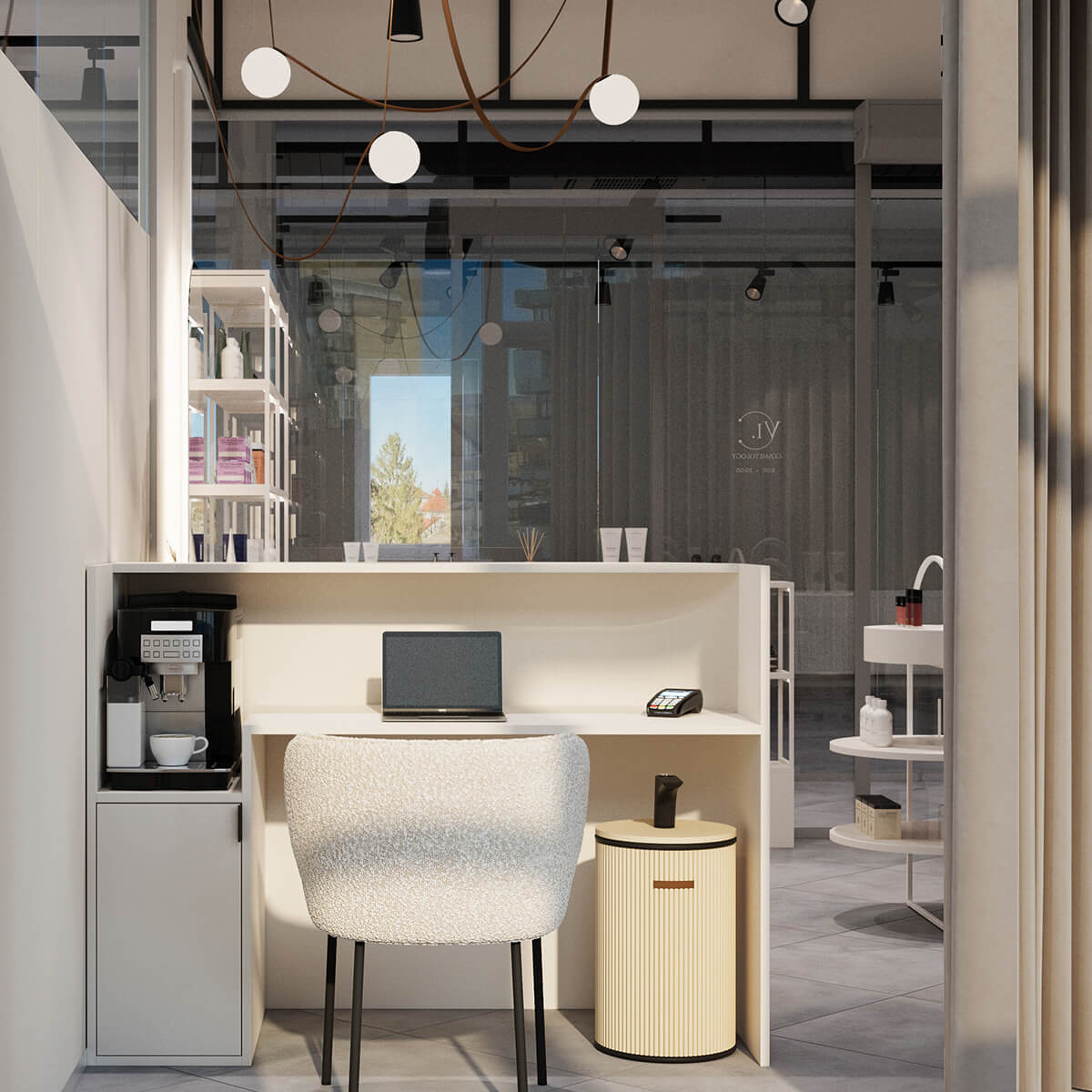 Результат: у цьому проєкті ми поєднали косметологічний кабінет і магазин у єдиному просторі. Завдяки продуманому зонуванню вдалося створити атмосферу легкості та затишку, де обидві функції гармонійно доповнюють одна одну.