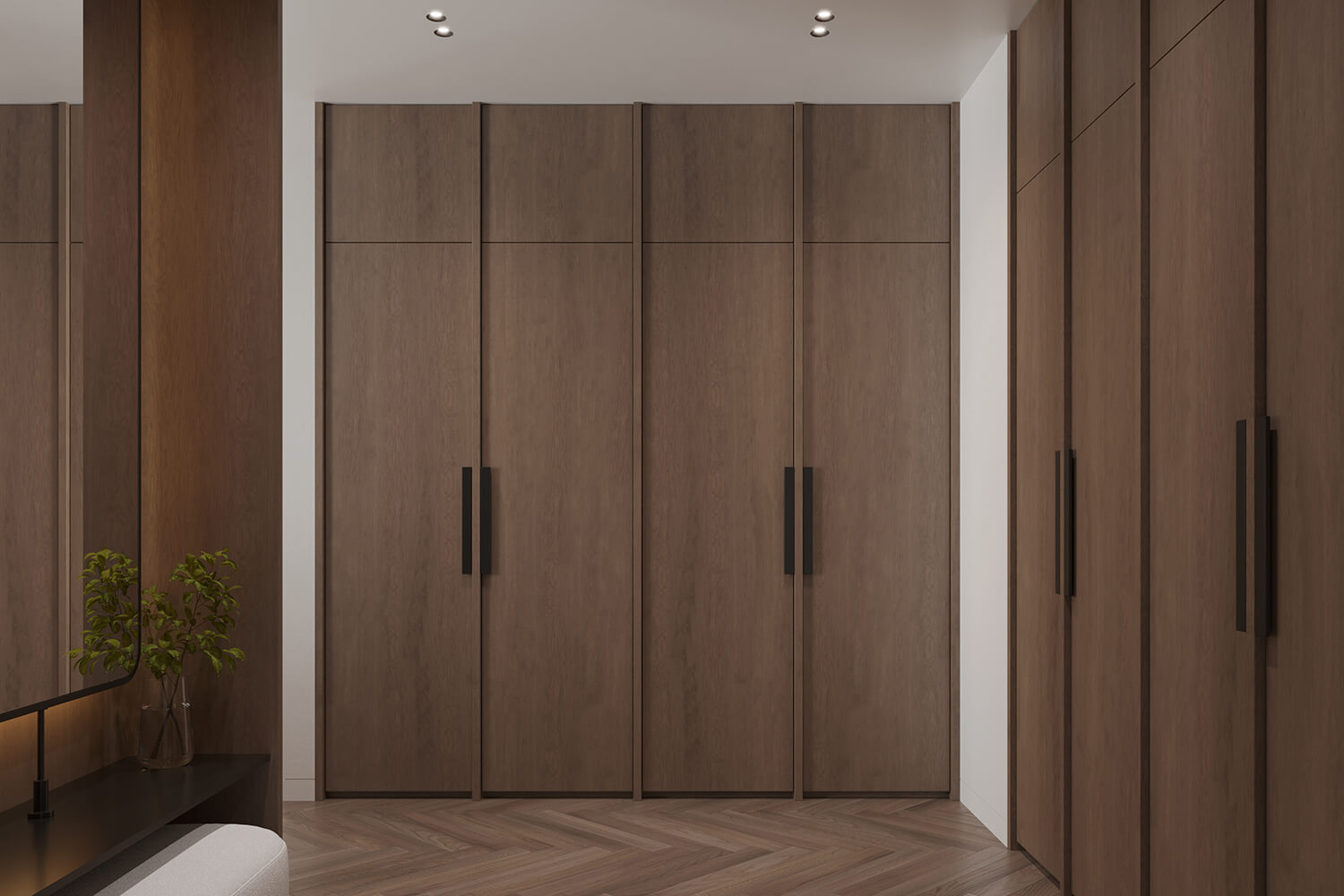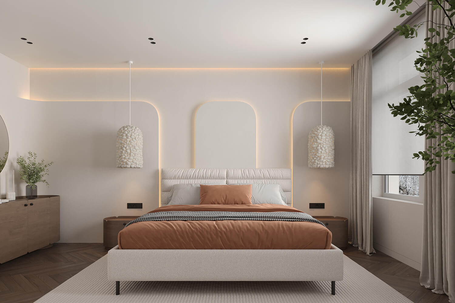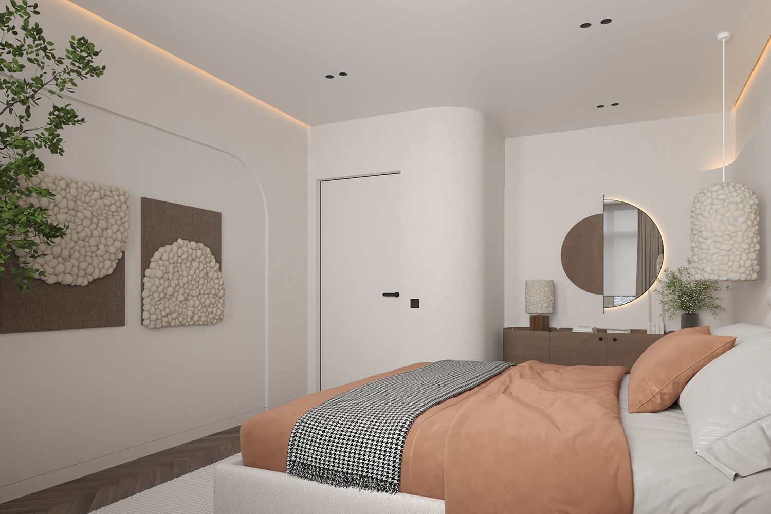 Спальня — простора та світла, з акцентом на текстури й приглушене освітлення. Асиметричне панно за узголів’ям, шпоновані вставки, теплі текстильні рішення й натуральні кольори формують затишний інтер’єр. У ніші — універсальний столик, який може бути і косметичним, і робочим, доповнений дзеркалом.