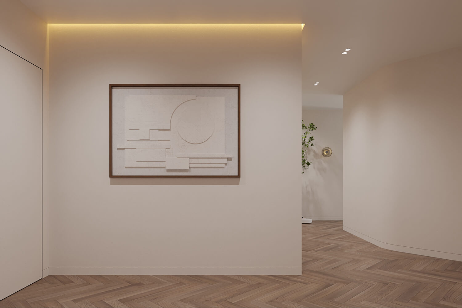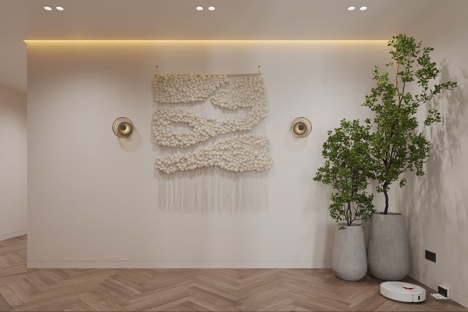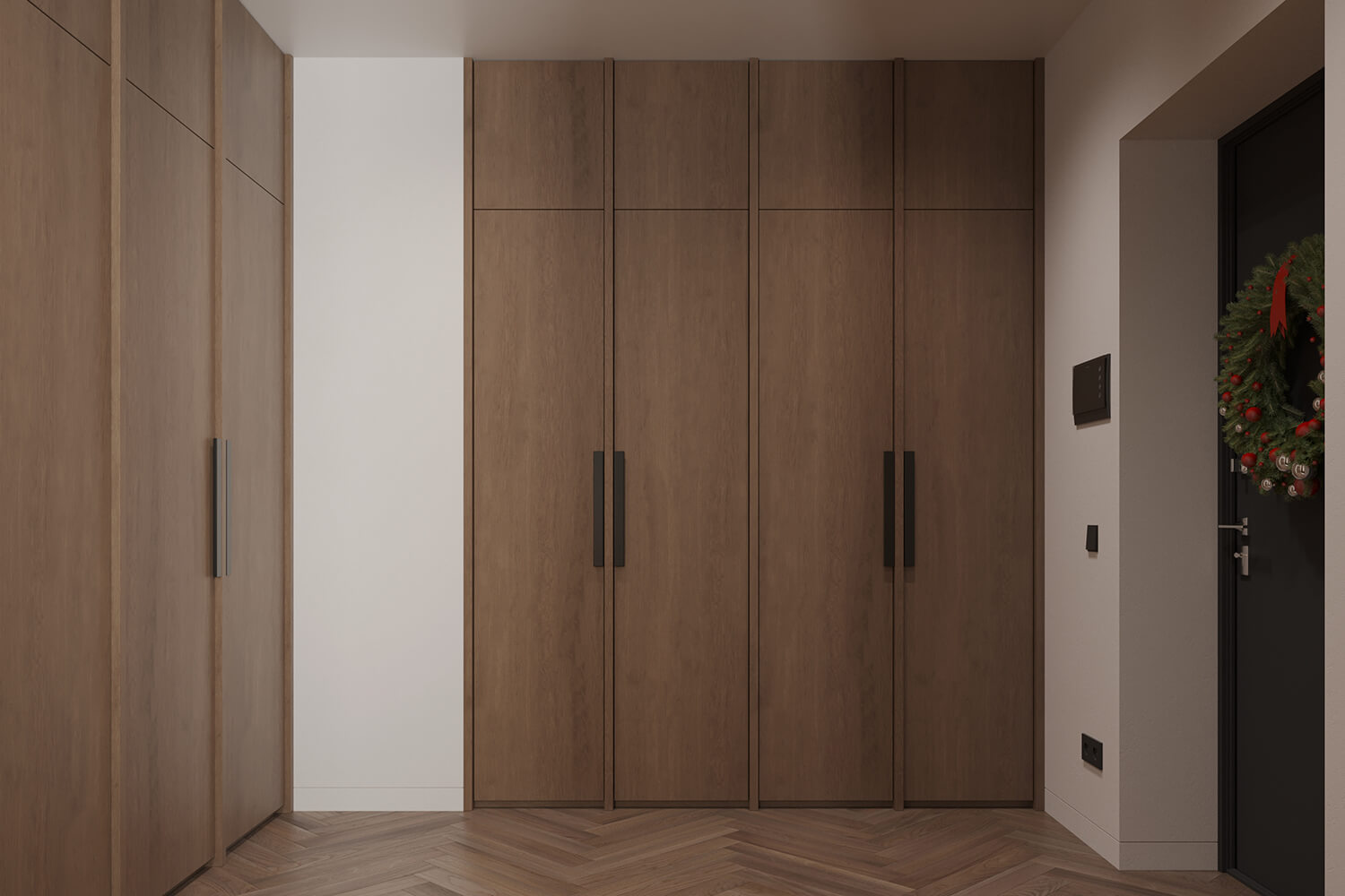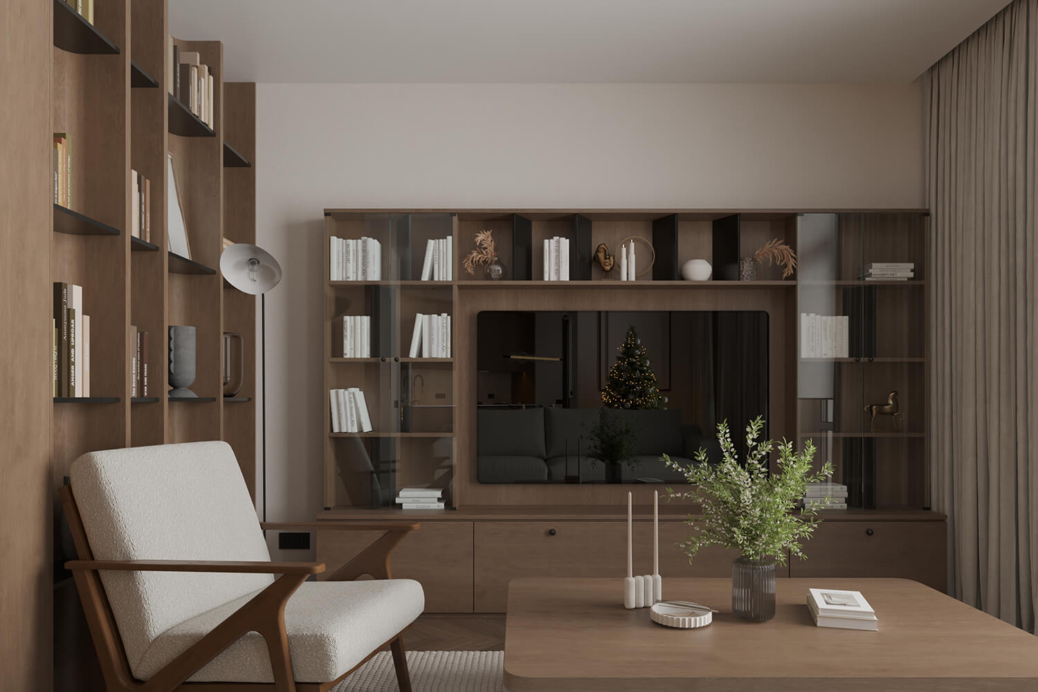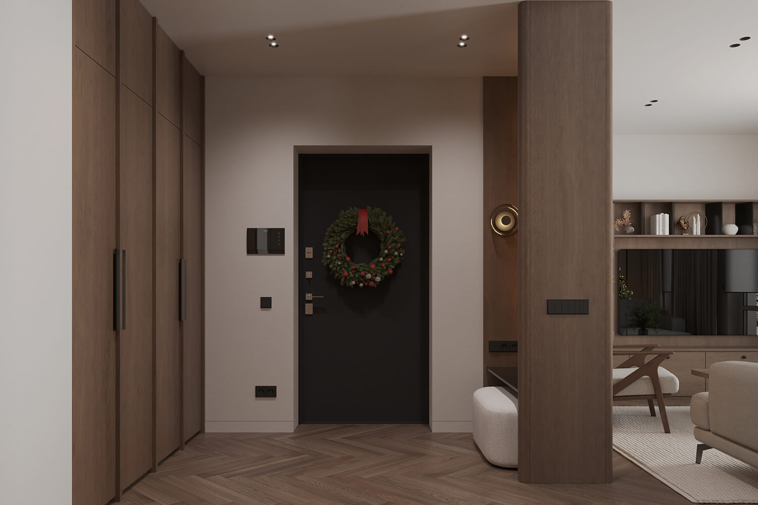 Результат: у цьому проєкті ми створили простір, де зручно жити, працювати та відпочивати. Вхідна група оформлена в нейтральній палітрі з дерев’яними фасадами, дзеркальними панелями та прихованими системами зберігання — усе для візуального порядку та зручності. У лаунж-зоні — м’який диван, тактильний текстиль і журнальний стіл з натурального дерева. Робоче місце інтегроване в нішу з полицями та локальним підсвічуванням, що дозволяє зосередитись у спокійній атмосфері.