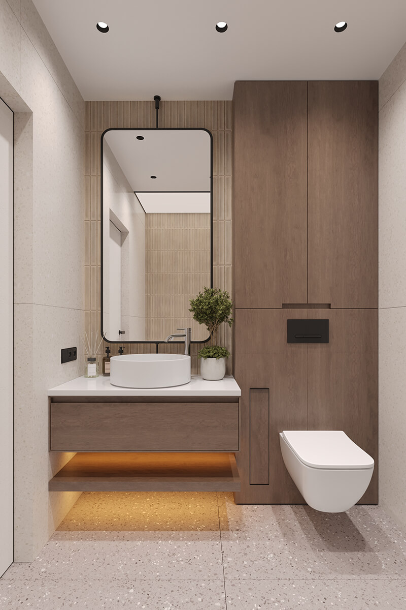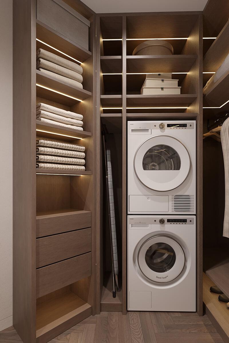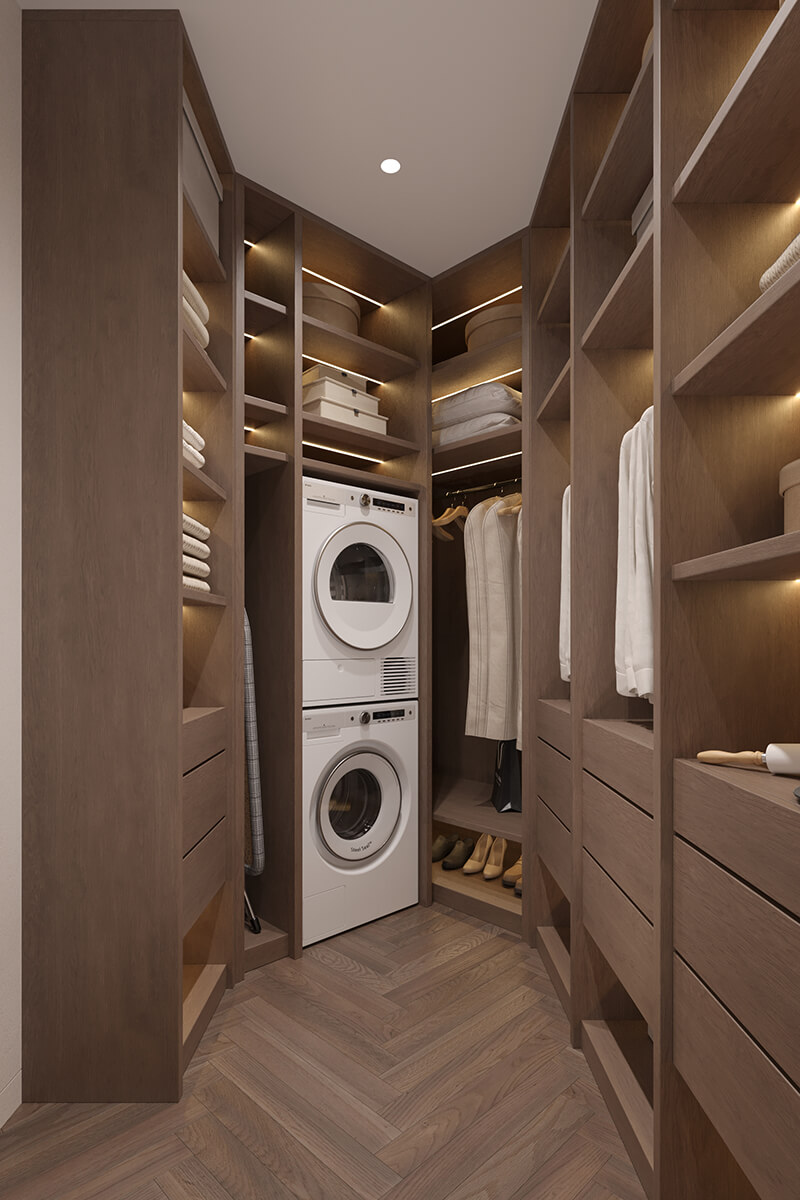 Гардеробна має відкриту систему зберігання з підсвіткою й інтегрованим пральним блоком. Ванна кімната оформлена в природних матеріалах: плитка під камінь, дерево, текстурні поверхні. Навісна тумба з підсвіткою, округла раковина, вбудовані шафи й точкове освітлення роблять простір зручним, технологічним та естетично чистим.