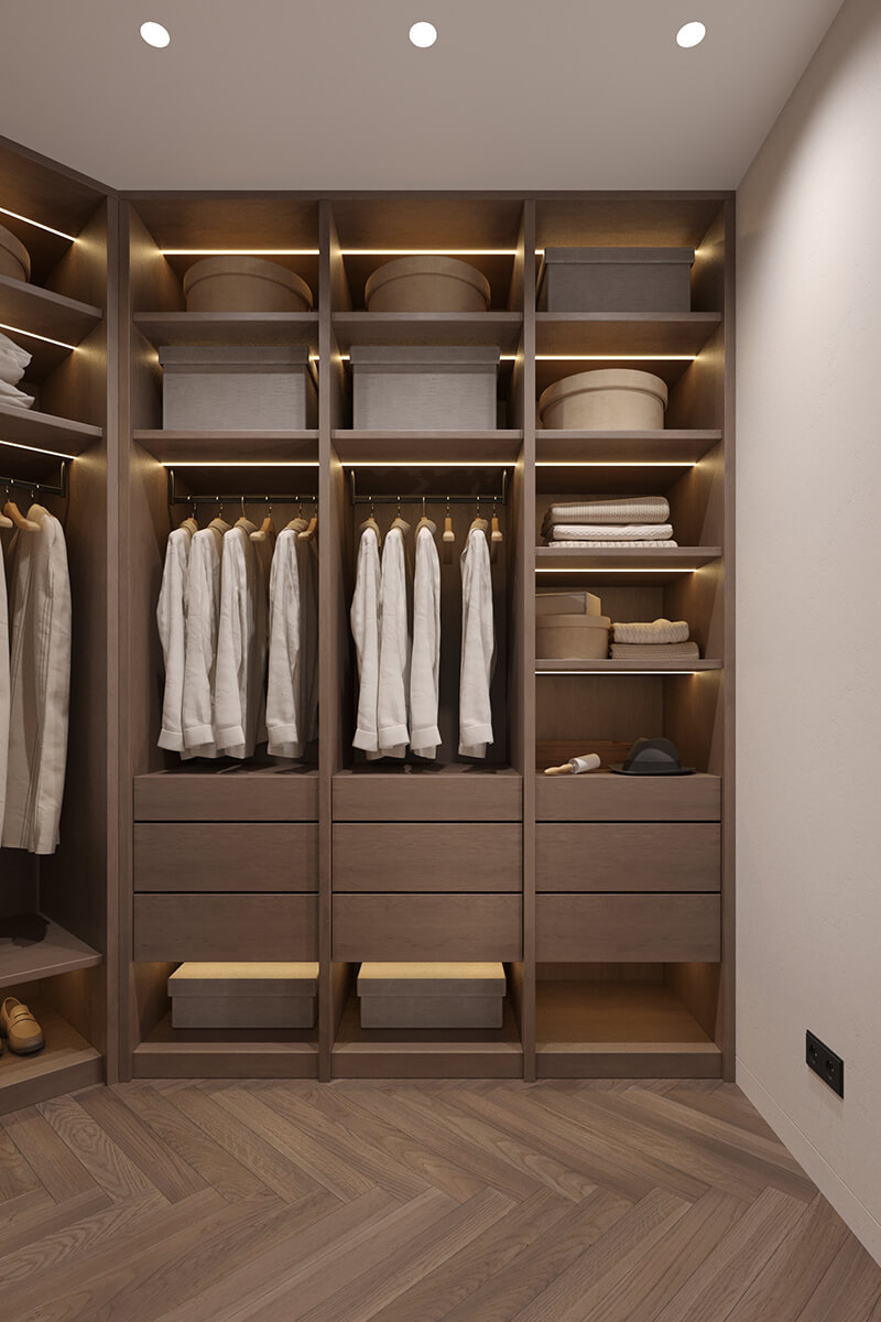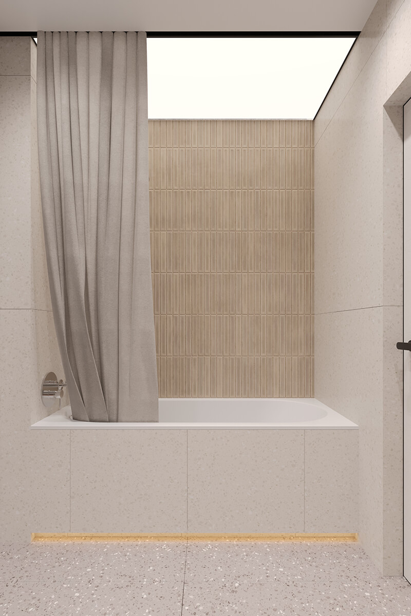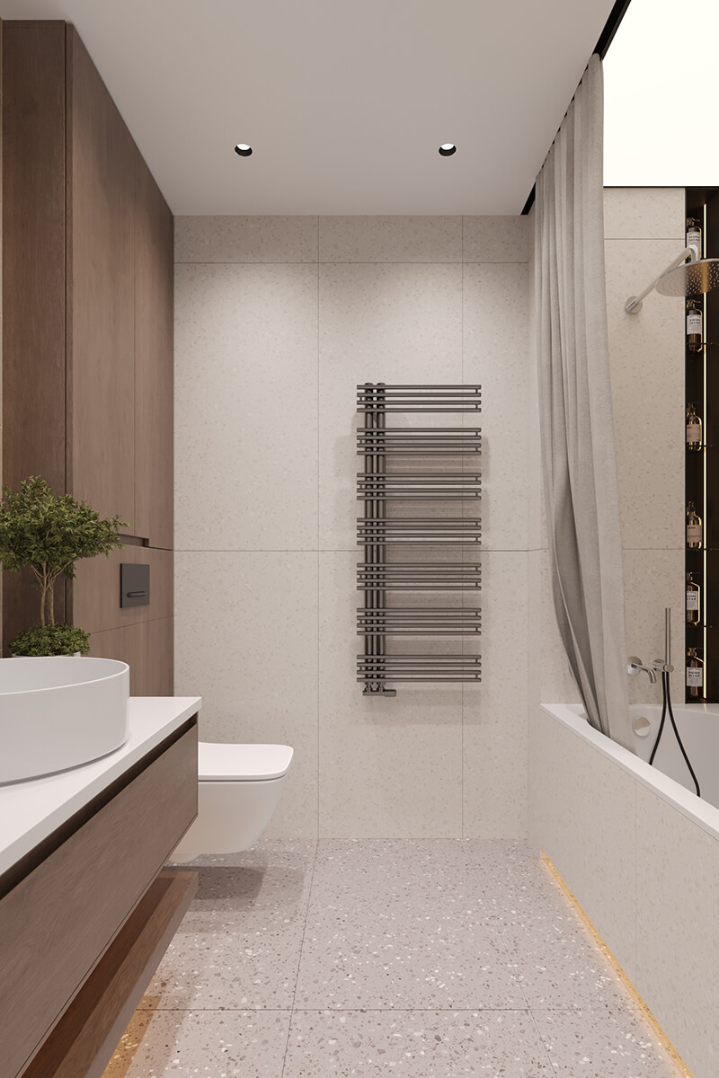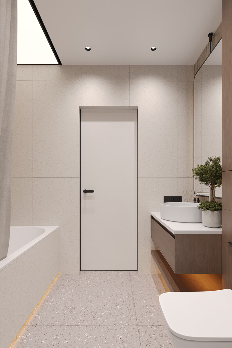 Гардеробна має відкриту систему зберігання з підсвіткою й інтегрованим пральним блоком. Ванна кімната оформлена в природних матеріалах: плитка під камінь, дерево, текстурні поверхні. Навісна тумба з підсвіткою, округла раковина, вбудовані шафи й точкове освітлення роблять простір зручним, технологічним та естетично чистим.