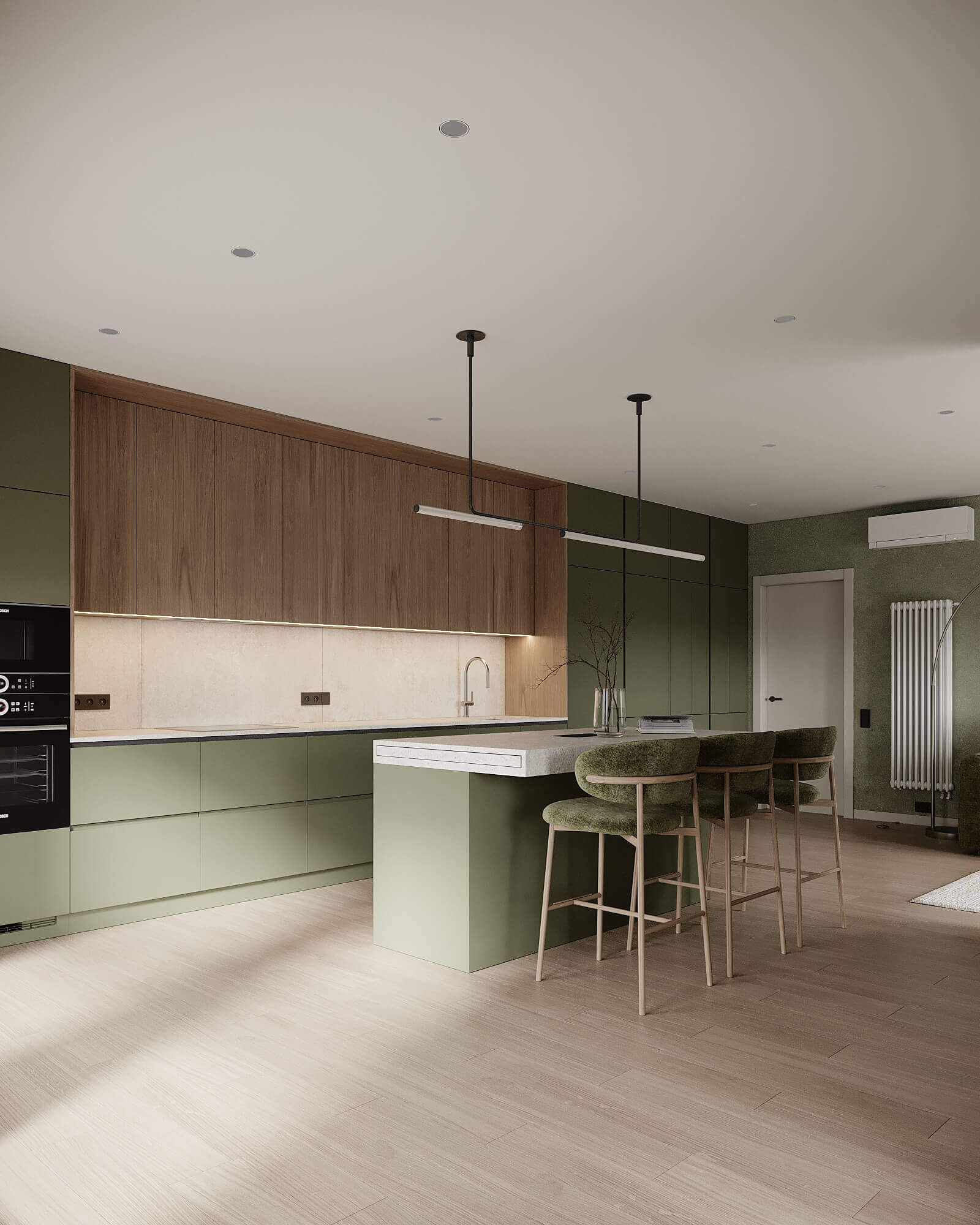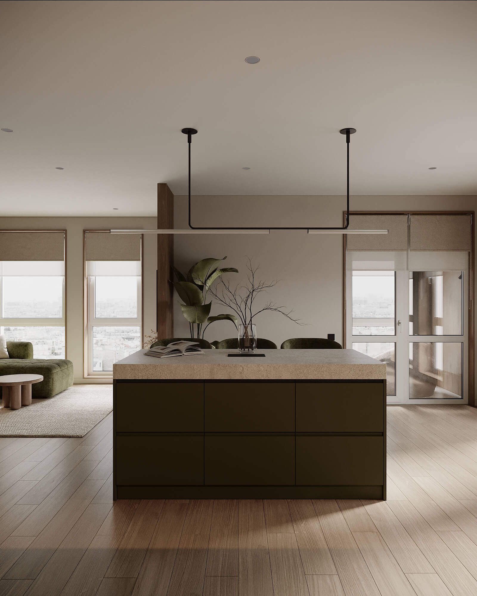 Цей проєкт – приклад того, як кухня-вітальня може бути одночасно стриманою, функціональною й емоційно теплою. Ми працювали з природною палітрою: приглушений зелений, текстура дерева, світлий камінь – усе для балансу між естетикою та щоденним комфортом. Острів став композиційним центром і місцем сценаріїв: від швидкої кави до вечірніх розмов. Також присутня прихована зона для напоїв. У закритому вигляді – це мінімалістична шафа, у відкритому – повноцінний coffee & drink spot.