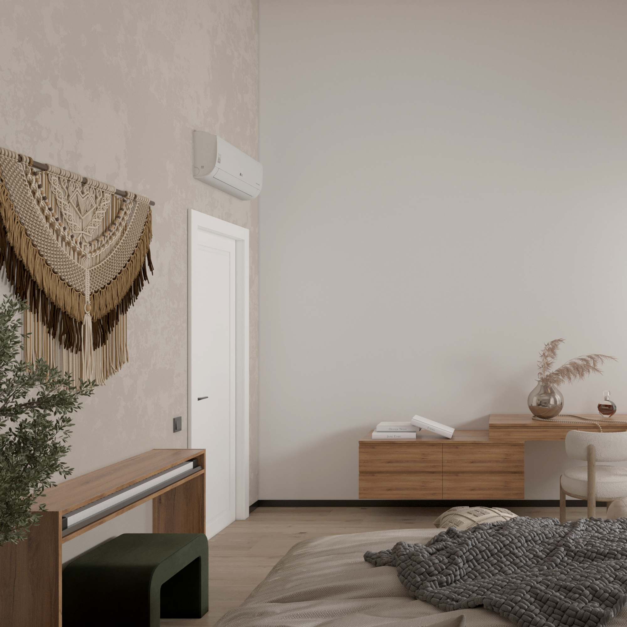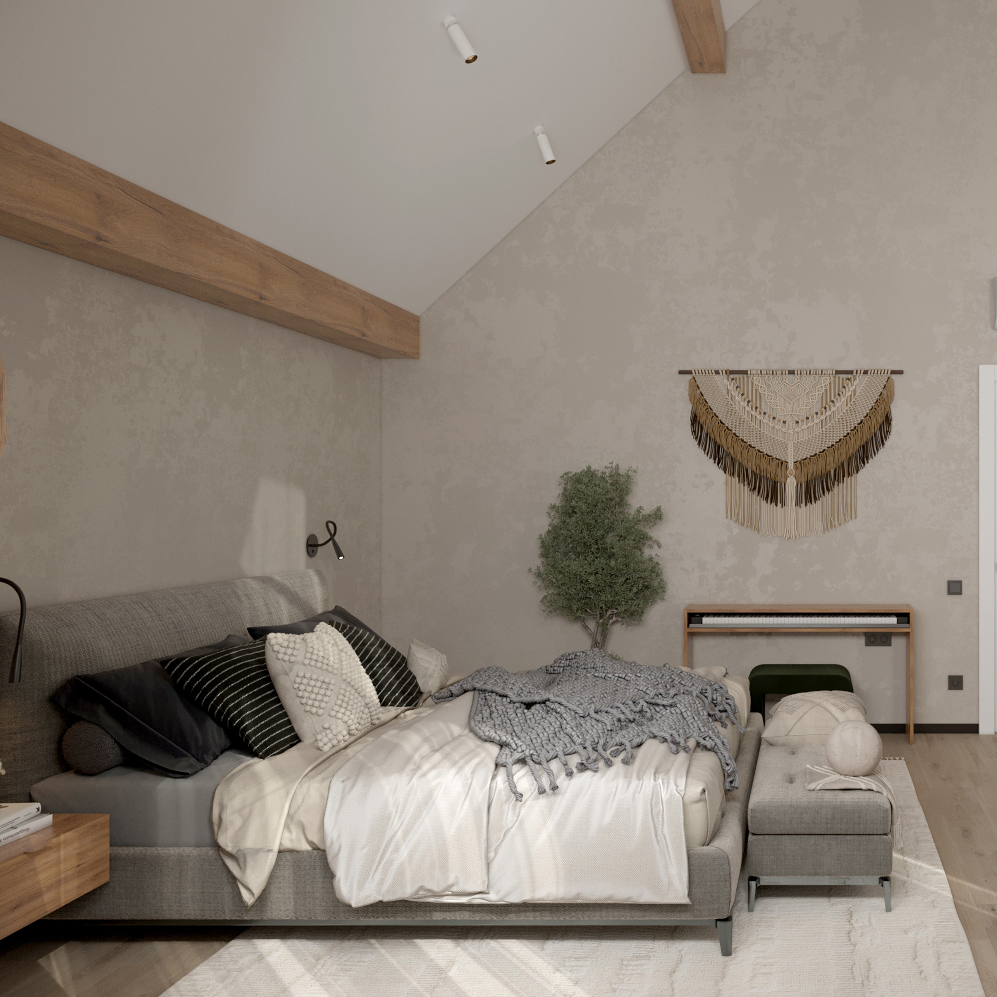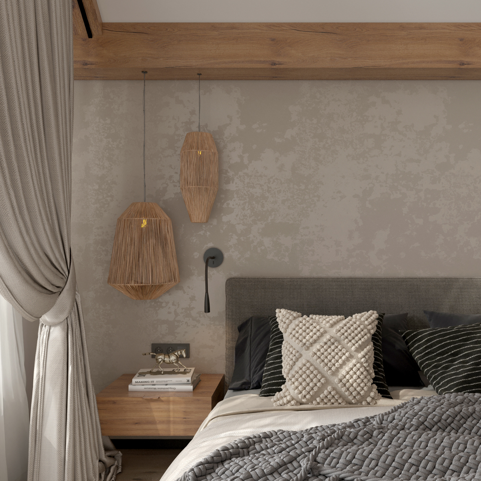 Заказчики хотели интерьер в нейтральных, теплых оттенках с натуральными текстурами: деревом, плетеным декором и текстилем с этническими акцентами. Мы выбрали современную адаптацию бохо, дополнив его продуманным сценарным освещением. В центре внимания — проектор вместо телевизора, так что каждая деталь работает на комфорт и атмосферу.