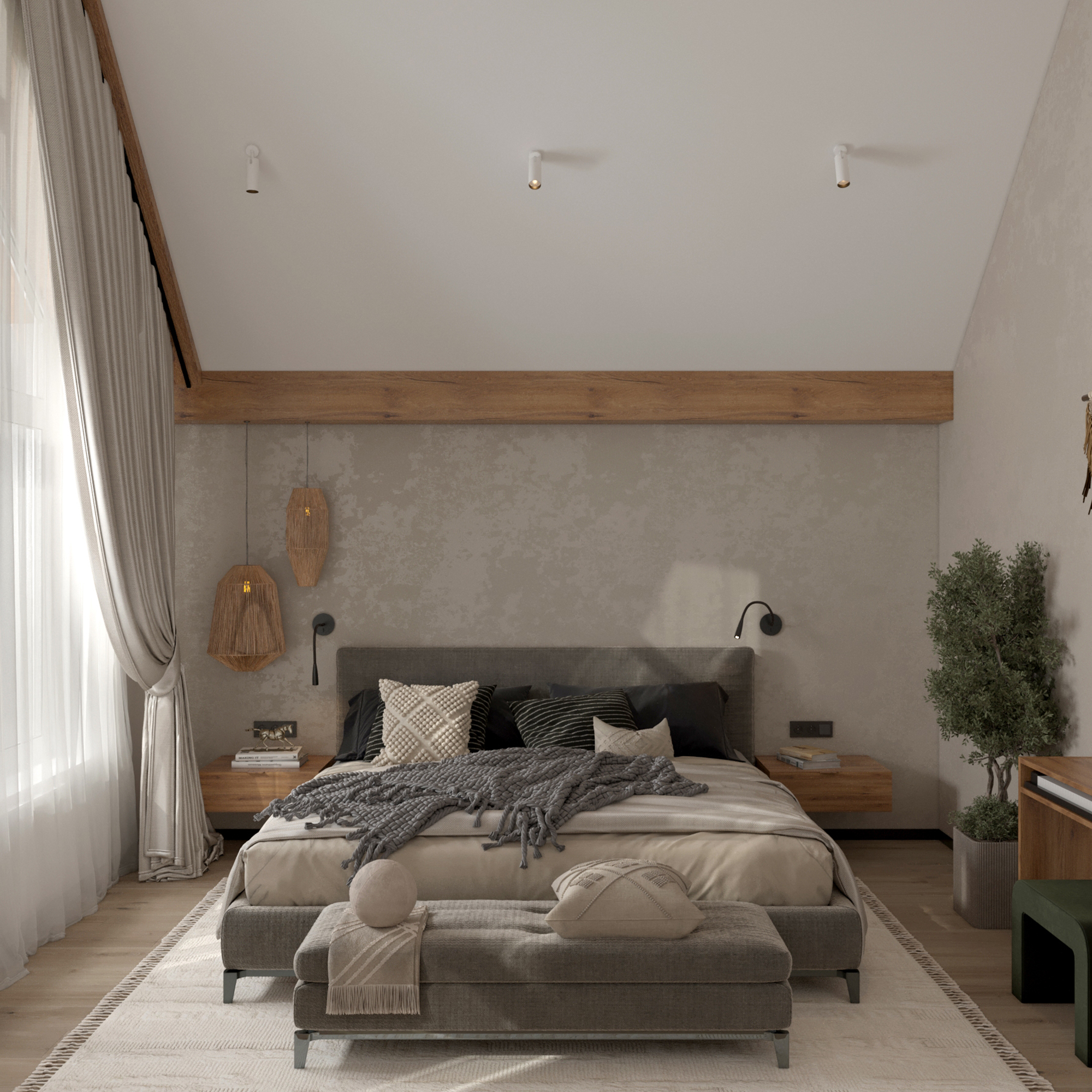 Пространство диктовало ритм — скошенная крыша, высокие окна и мягкий естественный свет задали настроение еще до начала проектирования.