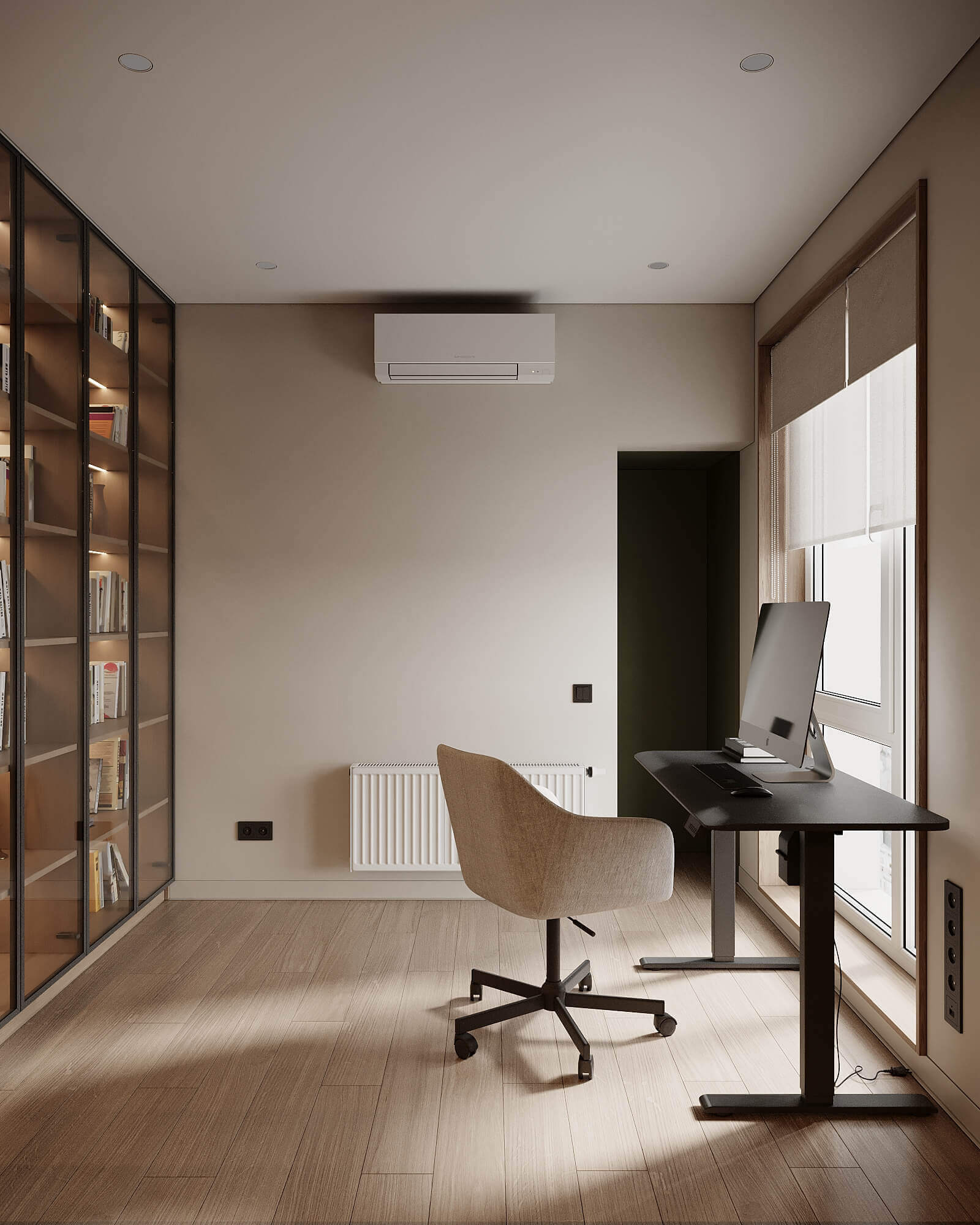 Кабінет побудований на чіткій логіці та стриманих акцентах: вбудована бібліотека зі склом і металевим каркасом працює як архітектурний елемент, додаючи глибини без перевантаження.